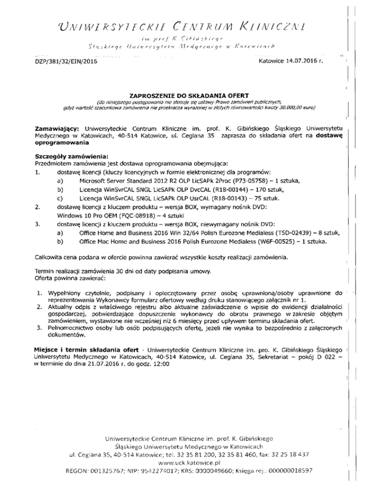 UNIWERSYTECKIE CENTRUM i m. ji r c f. K. C i /' i ń " h i r <j SI. ą 3 k i e '/ o KLINICZNI r U11 i w c r s tj l e 1 u -W <' d tj c / n c r/ c w K n l c iv i c a c h DZP/381/32/EIN/2016 Katowice 14.07.2016 r. ZAPROSZENIE DO SKŁADANIA OFERT (do niniejszego postępowania nie stosuje się ustawy Prawo zamówień publicznych, gdyż wartość szacunkowa zamówienia nie przekracza wyrażonej w złotych równowartości kwoty 30.000,00 euro) Zamawiający: Uniwersyteckie Centrum Kliniczne im. prof. K. Gibinskiego Śląskiego Uniwersytetu Medycznego w Katowicach, 40-514 Katowice, ul. Ceglana 35 zaprasza do składania ofert na dostawę oprogramowania Szczegóły zamówienia: Przedmiotem zamówienia jest dostawa oprogramowania obejmująca: 1. dostawę licencji (kluczy licencyjnych w formie elektronicznej dla programów: a) 2. Microsoft Server Standard 2012 R2 OLP LicSAPk 2Proc (P73-05758) - 1 sztuka, b) Licencja WinSvrCAL SNGL LicSAPk OLP DvcCAL (R18-00144) - 170 sztuk, c) Licencja WinSvrCAL SNGL LicSAPk OLP UsrCAL (R18-00143) - 75 sztuk. dostawę licencji z kluczem produktu - wersja BOX, wymagany nośnik DVD: Windows 10 Pro OEM (FQC-08918) - 4 sztuki 3. dostawę licencji z kluczem produktu - wersja BOX, niewymagany nośnik DVD: a) Office Home and Business 2016 Win 32/64 Polish Eurozone Medialess (T5D-02439) - 8 sztuk, b) Office Mac Home and Business 2016 Polish Eurozone Medialess (W6F-00525) - 1 sztuka. Całkowita cena podana w ofercie powinna zawierać wszystkie koszty realizacji zamówienia. Termin realizacji zamówienia 30 dni od daty podpisania umowy. Oferta powinna zawierać: 1. 2. 3. Wypełniony czytelnie, podpisany i opieczętowany przez osobę uprawnioną/osoby uprawnione do reprezentowania Wykonawcy formularz ofertowy według druku stanowiącego załącznik nr 1. Aktualny odpis z właściwego rejestru albo aktualne zaświadczenie o wpisie do ewidencji działalności gospodarczej, potwierdzające dopuszczenie wykonawcy do obrotu prawnego w zakresie objętym zamówieniem, wystawione nie wcześniej niż 6 miesięcy przed upływem terminu składania ofert. Pełnomocnictwo osoby lub osób podpisujących ofertę, jeżeli nie wynika to bezpośrednio z załączonych dokumentów. Miejsce i termin składania ofert - Uniwersyteckie Centrum Kliniczne im. pro. K. Gibinskiego Śląskiego Uniwersytetu Medycznego w Katowicach, 40-514 Katowice, ul. Ceglana 35, Sekretariat - pokój D 022 w terminie do dnia 21.07.2016 r. do godz. 12:00 Uniwersyteckie Centrum Kliniczne im. prof. K. Gibinskiego Śląskiego Uniwersytetu Medycznego w Katowicach ul. Ceglana 35, 40-514 Katowice; tel. 32 35 81 200, 32 35 81 460, fax: 32 25 18 437 www.uck.katowice.pl REGON: 001325767; NIP: 9542274017; KRS: 0000049660; Księga rej.: 000000018597 Ofertę należy złożyć w zamkniętej , opisanej według poniższego wzoru kopercie „ Nazwa , adres Wykonawcy Uniwersyteckie Centrum Kliniczne im. prof. K. Gibinskiego Śląskiego Uniwersytetu Medycznego w Katowicach ul. Ceglana 35, 40-514 Katowice „Oferta - oprogramowanie" - Nie otwierać przed21.07.2016 r. godz.l2:00" Osoby uprawnione do porozumiewania się z wykonawcami: - Andrzej Rechowicz, Dział Zamówień Publicznych pok. E057, [email protected] w godzinach pracy od poniedziałku do piątku godz. 7.25 - 15.00. tel. 32 3581-332 e-mail: Zapraszający zastrzega sobie prawo do niedokonania wyboru Wykonawcy bez podania przyczyn. Załączniki: 1. Formularz ofertowy 2. Wzór umowy Z upoważnienia Dyrektora Unrmnytediego Centrum O i i i o n m m. prof. Ł GŁiisfJcgo DZP/381/32/EIN/2016 Załącznik nr 1 pieczęć firmowa wykonawcy OFERTA dla Uniwersyteckiego Centrum Klinicznego im. prof. K. Gibinskiego Śląskiego Uniwersytetu Medycznego w Katowicach Nazwa wykonawcy Siedziba: REGON NIP KRS Tel fax Internet e-mail Osoba do kontaktów Ubiegając się o zamówienie publiczne na dostawę oprogramowania, oferujemy realizację całości zamówienia za następującą cenę: cena netto podatek VAT Cena ofertowa brutto: zł % tj zł zł (słownie: ) Powyższa cena cena zawiera wszystkie koszty realizacji zamówienia. Oświadczamy, że - zawarta w Zaproszeniu treść projektu umowy została przez nas zaakceptowana i zobowiązujemy się w przypadku wyboru naszej oferty do zawarcia umowy na wyżej wymienionych warunkach w miejscu i terminie wyznaczonym przez Zamawiającego. - Załącznikami do niniejszej oferty są (wymienić wszystkie załączniki) : podpis i pieczęć osoby uprawnionej/ osób uprawnionych do reprezentowania wykonawcy DZP/381/32/EIN/2016 Załącznik nr 2 UMOWA - wzór (do niniejszej umowy nie stosuje się ustawy Prawo zamówień publicznych, gdyż wartość szacunkowa zamówienia nie przekracza wyrażonej w złotych równowartości kwoty 30 000,00 euro) zawarta w dniu Strony umowy: w Katowicach. Zamawiający - Uniwersyteckie Centrum Kliniczne im. prof. K. Gibinskiego Śląskiego Uniwersytetu Medycznego w Katowicach 40-514 Katowice, ul. Ceglana 35 KRS 0000049660, NIP 954-22-74-017, REGON 001325767 reprezentowane przez: Dyrektora - Dariusza Jorg Wykonawca KRS , NIP , REGON reprezentowany przez: §1 Przedmiotem umowy jest dostawa oprogramowania obejmująca: 1. dostawę licencji (kluczy licencyjnych w formie elektronicznej dla programów: a) Microsoft Server Standard 2012 R2 OLP LicSAPk 2Proc (P73-05758) - 1 sztuka, b) Licencja WinSvrCAL SNGL LicSAPk OLP DvcCAL (R18-00144) - 170 sztuk, c) Licencja WinSvrCAL SNGL LicSAPk OLP UsrCAL (R18-00143) - 75 sztuk. 2. dostawę licencji z kluczem produktu - wersja BOX, wymagany nośnik DVD: Windows 10 Pro OEM (FQC-08918) - 4 sztuki 3. dostawę licencji z kluczem produktu - wersja BOX, niewymagany nośnik DVD: a) Office Home and Business 2016 Win 32/64 Polish Eurozone Medialess (T5D-02439) - 8 sztuk, b) Office Mac Home and Business 2016 Polish Eurozone Medialess (W6F-00525) - 1 sztuka. §2 Oprogramowanie zostanie dostarczone Zamawiającemu w ciągu 30 dni od daty podpisania umowy. §3 1. Za należytą realizację całej umowy Zamawiający zapłac