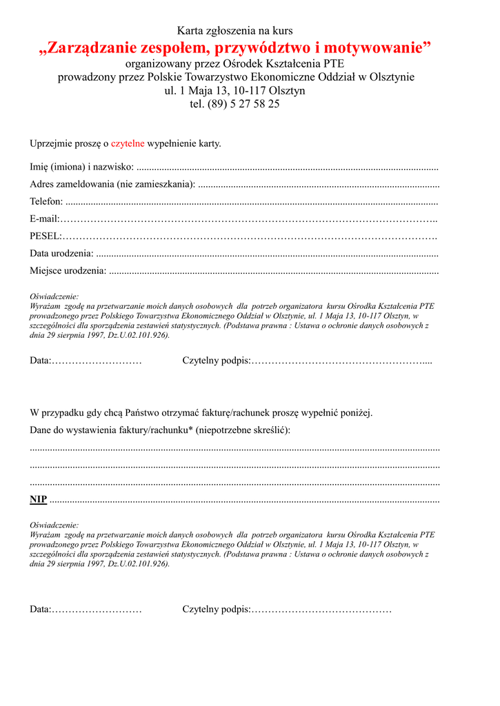 Karta zgłoszenia na kurs „Zarządzanie zespołem, przywództwo i motywowanie” organizowany przez Ośrodek Kształcenia PTE prowadzony przez Polskie Towarzystwo Ekonomiczne Oddział w Olsztynie ul. 1 Maja 13, 10-117 Olsztyn tel. (89) 5 27 58 25 Uprzejmie proszę o czytelne wypełnienie karty. Imię (imiona) i nazwisko: ........................................................................................................................ Adres zameldowania (nie zamieszkania): ................................................................................................ Telefon: .................................................................................................................................................... E-mail:………………………………………………………………………………………………….. PESEL:…………………………………………………………………………………………………. Data urodzenia: ........................................................................................................................................ Miejsce urodzenia: ................................................................................................................................... Oświadczenie: Wyrażam zgodę na przetwarzanie moich danych osobowych dla potrzeb organizatora kursu Ośrodka Kształcenia PTE prowadzonego przez Polskiego Towarzystwa Ekonomicznego Oddział w Olsztynie, ul. 1 Maja 13, 10-117 Olsztyn, w szczególności dla sporządzenia zestawień statystycznych. (Podstawa prawna : Ustawa o ochronie danych osobowych z dnia 29 sierpnia 1997, Dz.U.02.101.926). Data:……………………… Czytelny podpis:…………………………………………….... W przypadku gdy chcą Państwo otrzymać fakturę/rachunek proszę wypełnić poniżej. Dane do wystawienia faktury/rachunku* (niepotrzebne skreślić): ................................................................................................................................................................... ................................................................................................................................................................... ................................................................................................................................................................... NIP ........................................................................................................................................................... Oświadczenie: Wyrażam zgodę na przetwarzanie moich danych osobowych dla potrzeb organizatora kursu Ośrodka Kształcenia PTE prowadzonego przez Polskiego Towarzystwa Ekonomicznego Oddział w Olsztynie, ul. 1 Maja 13, 10-117 Olsztyn, w szczególności dla sporządzenia zestawień statystycznych. (Podstawa prawna : Ustawa o ochronie danych osobowych z dnia 29 sierpnia 1997, Dz.U.02.101.926). Data:……………………… Czytelny podpis:……………………………………