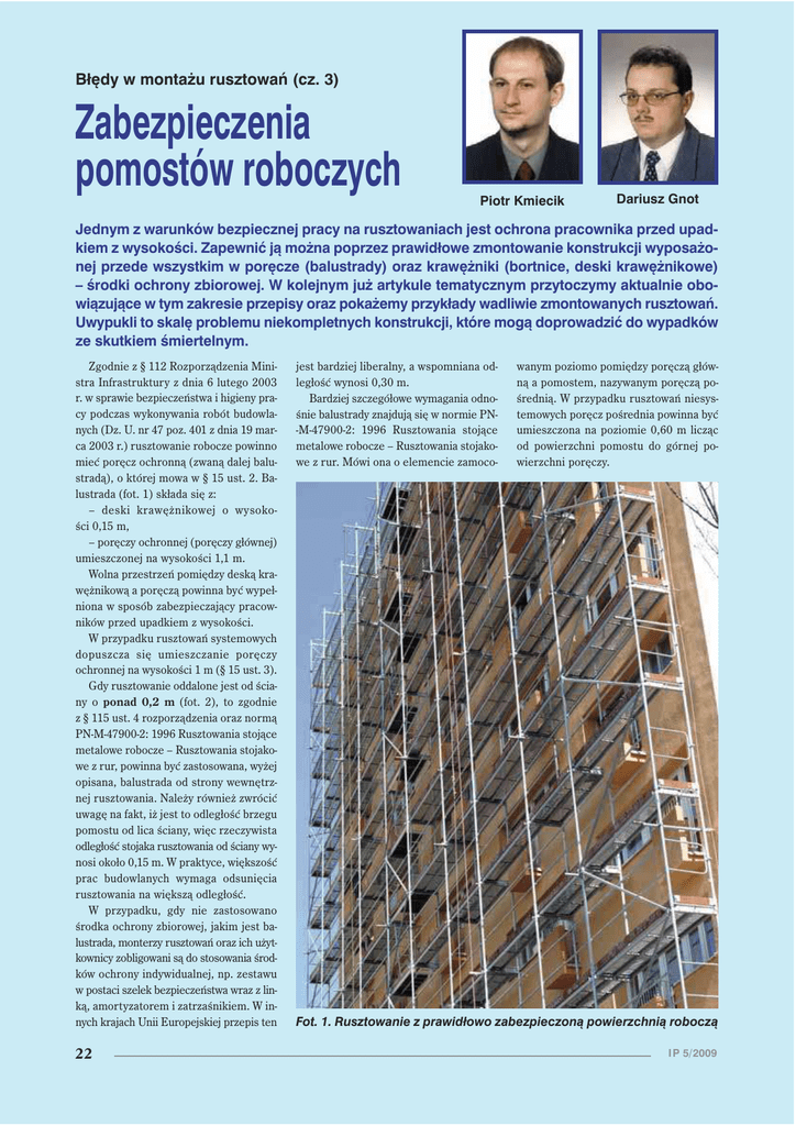 Błędy w montaŜu rusztowań (cz. 3) Zabezpieczenia pomostów roboczych Piotr Kmiecik Dariusz Gnot Jednym z warunków bezpiecznej pracy na rusztowaniach jest ochrona pracownika przed upadkiem z wysokości. Zapewnić ją można poprzez prawidłowe zmontowanie konstrukcji wyposażonej przede wszystkim w poręcze (balustrady) oraz krawężniki (bortnice, deski krawężnikowe) – środki ochrony zbiorowej. W kolejnym już artykule tematycznym przytoczymy aktualnie obowiązujące w tym zakresie przepisy oraz pokażemy przykłady wadliwie zmontowanych rusztowań. Uwypukli to skalę problemu niekompletnych konstrukcji, które mogą doprowadzić do wypadków ze skutkiem śmiertelnym. Zgodnie z § 112 Rozporządzenia Ministra Infrastruktury z dnia 6 lutego 2003 r. w sprawie bezpieczeństwa i higieny pracy podczas wykonywania robót budowlanych (Dz. U. nr 47 poz. 401 z dnia 19 marca 2003 r.) rusztowanie robocze powinno mieć poręcz ochronną (zwaną dalej balustradą), o której mowa w § 15 ust. 2. Balustrada (fot. 1) składa się z: – de ski kra wężni kowej o wy so ko ści 0,15 m, – poręczy ochronnej (poręczy głównej) umieszczonej na wysokości 1,1 m. Wolna przestrzeń pomiędzy deską krawężnikową a poręczą powinna być wypełniona w sposób zabezpieczający pracowników przed upadkiem z wysokości. W przypadku rusztowań systemowych dopuszcza się umieszczanie poręczy ochronnej na wysokości 1 m (§ 15 ust. 3). Gdy rusztowanie oddalone jest od ściany o ponad 0,2 m (fot. 2), to zgodnie z § 115 ust. 4 rozporządzenia oraz normą PN-M-47900-2: 1996 Rusztowania stojące metalowe robocze – Rusztowania stojakowe z rur, powinna być zastosowana, wyżej opisana, balustrada od strony wewnętrznej rusztowania. Należy również zwrócić uwagę na fakt, iż jest to odległość brzegu pomostu od lica ściany, więc rzeczywista odległość stojaka rusztowania od ściany wynosi około 0,15 m. W praktyce, większość prac budowlanych wymaga odsunięcia rusztowania na większą odległość. W przypadku, gdy nie zastosowano środka ochrony zbiorowej, jakim jest balustrada, monterzy rusztowań oraz ich użytkownicy zobligowani są do stosowania środków ochrony indywidualnej, np. zestawu w postaci szelek bezpieczeństwa wraz z linką, amortyzatorem i zatrzaśnikiem. W innych krajach Unii Europejskiej przepis ten 22 jest bardziej liberalny, a wspomniana odległość wynosi 0,30 m. Bardziej szczegółowe wymagania odnośnie balustrady znajdują się w normie PN-M-47900-2: 1996 Rusztowania stojące metalowe robocze – Rusztowania stojakowe z rur. Mówi ona o elemencie zamoco- wanym poziomo pomiędzy poręczą główną a pomostem, nazywanym poręczą pośrednią. W przypadku rusztowań niesystemowych poręcz pośrednia powinna być umieszczona na poziomie 0,60 m licząc od powierzchni pomostu do górnej powierzchni poręczy. Fot. 1. Rusztowanie z prawidłowo zabezpieczoną powierzchnią roboczą I P 5/2009 Fot. 2. Brak zabezpieczeń w przypadku, gdy odległość od pomostu rusztowania do ściany jest większa niŜ 0,2 m Przepis, norma Rozporządzenie Ministra Infrastruktury z dnia 6 lutego 2003 r. w sprawie bezpieczeństwa i higieny pracy podczas wykonywania robót budowlanych (Dz. U. Nr 47, poz. 401) Norma dopuszcza inny skuteczny sposób zabezpieczenia pomostów, np. za pomocą mocnej siatki zamiast poręczy z rur. Należy jednak pamiętać, że stosowanie materiału okładzinowego, np. siatek ochronnych nie zwalnia z obowiązku stosowania balustrad. Reguluje to zapis § 119 ust. 2 rozporządzenia. Częstym powodem demontażu poręczy przez użytkowników rusztowania jest kolizja z nimi podczas wykonywania prac transportowych, np. za pomocą wysięgni- Treść § 15. 1. Drogi komunikacyjne dla wózków i taczek, usytuowane nad poziomem terenu powyŜej 1 m, zabezpiecza się balustradą. 2. Balustrada, o której mowa w ust. 1, składa się z deski krawęŜnikowej o wysokości 0,15 m i poręczy ochronnej umieszczonej na wysokości 1, 1 m. Wolną przestrzeń pomiędzy deską krawęŜnikową a poręczą wypełnia się w sposób zabezpieczający pracowników przed upadkiem z wysokości. 3. W przypadku rusztowań systemowych dopuszcza się umieszczanie poręczy ochronnej na wysokości 1 m. § 112. Rusztowania i ruchome podesty robocze powinny: 1) posiadać pomost o powierzchni roboczej wystarczającej dla osób wykonujących roboty oraz do składowania narzędzi i niezbędnej ilości materiałów; 2) posiadać stabilną konstrukcję dostosowaną do przeniesienia obciąŜeń; 3) zapewniać bezpieczną komunikację i swobodny dostęp do stanowisk pracy; 4) zapewniać moŜliwość wykonywania robót w pozycji niepowodującej nadmiernego wysiłku; 5) posiadać poręcz ochronną, o której mowa w § 15 ust. 2; 6) posiadać piony komunikacyjne. § 115. pkt. 4. W przypadku odsunięcia rusztowania od ściany ponad 0,2 m naleŜy stosować balustrady, o których mowa w § 15 ust. 2, od strony tej ściany. Polska Norma PN-M-47900-2:1996 „Rusztowania stojące metalowe robocze. Rusztowania stojakowe z rur.” 5/2009 I P § 118. 1. Usytuowanie rusztowania w obrębie ciągów komunikacyjnych wymaga zgody właściwych organów nadzorujących te ciągi oraz zastosowania wymaganych przez nie środków bezpieczeństwa. Środki bezpieczeństwa powinny być określone w projekcie organizacji ruchu. 2. Rusztowania, o których mowa w ust. 1, oprócz wymagań określonych w § 112, powinny posiadać co najmniej: 1) zabezpieczenia przed spadaniem przedmiotów z rusztowania; 2) zabezpieczenie przechodniów przed moŜliwością powstania urazów oraz uszkodzeniem odzieŜy przez elementy konstrukcyjne rusztowania. § 119. 1. Rusztowania, usytuowane bezpośrednio przy drogach, ulicach oraz w miejscach przejazdów i przejść dla pieszych, oprócz wymagań określonych w § 112, powinny posiadać daszki ochronne i osłonę z siatek ochronnych. 2. Stosowanie siatek ochronnych nie zwalnia z obowiązku stosowania balust