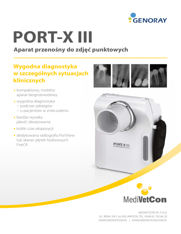 PORT-X III Aparat przenośny do zdjęć punktowych Wygodna diagnostyka w szczególnych sytuacjach klinicznych kompaktowy, mobilny aparat bezprzewodowy wygodna diagnostyka − podczas zabiegów − u pacjentów w znieczuleniu bardzo wysoka jakość obrazowania krótki czas ekspozycji dedykowana radiografia PortView lub skaner płytek fosforowych FireCR MEDIVETCON SP. Z O.O. UL. BEMA 20/1, 63-200 JAROCIN, TEL. 0048 62 720 66 20 WWW.MEDIVETCON.PL | WWW.MEDIVETCON.COM.PL Nowoczesna technologia RTG Aparat przenośny PORT-X PORT-X to linia aparatów bezprzewodowych o bardzo wysokiej jakości obrazowania. Zdjęcia ostre, o dużym stopniu kontrastu uzyskujemy dzięki generatorowi wysokiej częstotliwości i lampie TOSHIBA. Dedykowana radiografia cyfrowa PortView lub skaner płytek fosforowych FireCR zapewniają bardzo wysoką rozdzielczość zdjęć. Bardzo krótkie czasy ekspozycji i niskie natężenie prądu minimalizują dawkę promieniowania. Dane techniczne PORT-X III Generator promieniowania Parametry lampy Ekspozycja Waga Toshiba Producent Typ Wysokiej częstotliwości Natężenie prądu 2 mA Napięcie 60 kV Ognisko 0,8 mm 20° Kąt anody Filtracja całkowita 1,8 mmAl Zakres czasu ekspozycji 0,01-2,0 s Jednostka główna 2,35 kg Akcesoria 0,6 kg 11 lub 20 cm Długość tubusa Wymiary Jednostka główna Ładowarka Wygodna i intuicyjna obsługa. Zaprogramowane parametry ekspozycji. 197 x 147 x 145 mm 100 x 65 x 35 mm 1 Możliwość wykonywania zdjęć na statywie. W zestawie przewodowy wyzwalacz ekspozycji oraz ładowarka. Wszystkie parametry widoczne na dużym czytelnym wyświetlaczu LCD. Parametry ekspozycji ustawiane domyślnie do wieku pacjenta oraz rodzaju zęba. 2