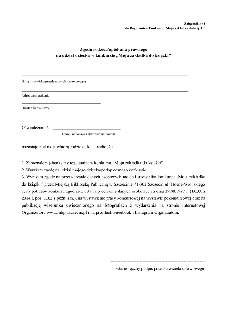 Załącznik nr 1 do Regulaminu Konkursu „Moja zakładka do książki” Zgoda rodzica/opiekuna prawnego na udział dziecka w konkursie „Moja zakładka do książki” ____________________________________________________________________________ (imię i nazwisko przedstawiciela ustawowego) ____________________________________________________________________________ (adres zamieszkania) ____________________________________ (telefon kontaktowy) Oświadczam, że: _______________________________ (imię i nazwisko uczestnika konkursu) pozostaje pod moją władzą rodzicielską, a nadto, że: 1. Zapoznałem (-łam) się z regulaminem konkursu „Moja zakładka do książki”, 2. Wyrażam zgodę na udział mojego dziecka/podopiecznego konkursie 3. Wyrażam zgodę na przetwarzanie danych osobowych moich i uczestnika konkursu „Moja zakładka do książki” przez Miejską Bibliotekę Publiczną w Szczecinie 71-302 Szczecin ul. Hoene-Wrońskiego 1, na potrzeby konkursu zgodnie z ustawą o ochronie danych osobowych z dnia 29.08.1997 r. (Dz.U. z 2014 r. poz. 1182 z późn. zm.), na wystawienie pracy konkursowej na wystawie pokonkursowej oraz na publikację wizerunku uwiecznionego na fotografiach z wydarzenia na stronie internetowej Organizatora www.mbp.szczecin.pl i na profilach Facebook i Instagram Organizatora. ----------------------------------------------------------------własnoręczny podpis przedstawiciela ustawowego