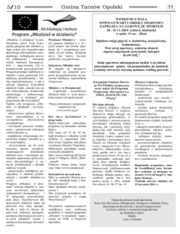 5 10 Gmina Tarnow Opolski 11 WEEKEND Z HALĄ NOWO OTWARTY OBIEKT SPORTOWY ZAPRASZA NA ZABAWĘ ZE SPORTEM 20 –21.11.2010 (sobota, niedziela) w godz. 13.oo – 20.oo „Młodzież w działaniu” to uruchomiony przez Unię Europejską program dla młodzieży. Jego celem jest stymulowanie aktywnego obywatelstwa europejskiego, rozbudzanie poczucia solidarności i tolerancji wśród młodych Europejczyków i angażowanie ich w kształtowanie przyszłościUnii. Program promuje mobilność w obrębie i poza granicami UE, edukację pozaformalną i dialog międzykulturowy, a także sprzyja integracji wszystkich młodych ludzi, niezależnie od ich wykształcenia, środowiska społecznego i kulturowego. „Młodzież w działaniu” jest programem dla wszystkich! Ogólne cele programu „Młodzież w działaniu”, są następujące: - promowanie ogólnej aktywności obywatelskiej, a w szczególności obywatelstwa europejskiego, - rozwijanie poczucia solidarności i promowanie tolerancji wśród młodzieży, - pogłębianie wzajemnego zrozumienia między młodzieżą z różnych krajów; - przyczynianie się do podnoszenia jakości systemów wspierających działalność młodzieżową i rozwijania potencjału organizacji społeczeństwa obywatelskiego w zakresie problematyki i działań młodzieżowych; - promowanie współpracy europejskiej w zakresie problematyki i działań młodzieżo-• wych. Program „Młodzież w działaniu” stwarza młodzieży zna-• czne możliwości nabywania umiejętności i kompetencji. • W programie przewidziano pięć akcji. Najciekawsze dla aktywnych młodych ludzi są• pierwsze trzy tutaj opisane. Każda z nich to okazja do przeżycia ciekawej przygody, poznania interesujących osób z rożnych zakątków świata i zdobycia bezcennego doświadczenia. Wymiana Młodzieży – stwarza grupom młodzieży z różnych krajów możliwość spotkania się i wzajemnego poznania swych kultur. Tematem może być taniec, kwestie społeczne, czy gotowanie. Inicjatywy Młodzieżowe W ramach tej inicjatywy wspierane się projekty grupowe przygotowywane na poziomie lokalnym, regionalnym i krajowym. Młodzieży w Demokracji - wspieranie uczestnictwa młodych ludzi w życiu demokratycznym ich społeczności Więcej informacji o programie znajdziecie na: www.youth.org.pl Kto może uczestniczyć w programie. Najważniejszymi adresatami programu są naturalnie młodzi ludzie. Jeśli masz od 13 do 30 lat, bądź pracujesz z młodzieżą lub działasz w organizacji młodzieżowej i legalnie mieszkasz w jednym z Krajów Programu. Obejrzyjcie przykłady zrealizowanych projektów: http://www.youth.org.pl/s/p/art ykuly/7/7/Raport_MwD_2009 _net.pdf Ciekawa strona którą warto znać: http://www.eurodesk.pl/ Zastanówcie się nad tym: Jakie są potrzeby Waszej grupy lub młodych ludzi, z którymi pracujecie? Jakie działania chcecie zrealizować ? Jaki potencjał posiadacie by stworzyć projekt, a czego Wam brakuje? Wszystkich zainteresowanych współpracą oraz realizacją projektów w ramach programu „Młodzież w działaniu” zapraszamy do GOK w Tarnowie Opolskim. Będziesz mógł pograć w siatkówkę, koszykówkę, badmintona. Weź strój sportowy, zmienne obuwie zaproś znajomych, przyjaciół, kolegów BAW SIĘ ! Hala sportowa udostępniona będzie wszystkim mieszkańcom gminy od poniedziałku do niedzieli. Godziny otwarcia zostaną ustalone według potrzeb. Europejski Fundusz Rozwoju Wsi Polskiej rozpoczyna nowy nabór do Programu Wspierania Aktywności Lokalnej „Razem Możemy Więcej” Dla kogo dotacje W ramach projektu „Razem Możemy Więcej” o wsparcie finansowe mogą ubiegać się organizacje pozarządowe, w tym fundacje i stowarzyszenia, posiadające określoną formę prawną, jak i podmioty kolegialne (np. rady sołeckie, rady parafialne, koła gospodyń wiejskich i inne), mające swoją siedzibę i prowadzące działalność na terenach wiejskich (wsie i miasta do 5 tys. Mieszkańców). Maksymalna wysokość grantu może nie może przekroczyć kwoty 10 tys. zł, a w przypadku realizacji projektu przy udziale dodatkowych, zewnętrznych środków finansowych (dofinansowanie partnera, środki funduszu sołeckiego, dotacja gminy, itp.), wielkość grantu może być podwyższona o 50%, jednak nie więcej, niż do 15 tys. zł. Obszary wsparcia Dofinansowanie mogą uzyskać wnioskodawcy, realizujący projekty w następujących dziedzinach: - zachowanie oraz rozwój i wykorzystanie lokalnego potencjału, - szeroko pojęta działalność oświatowa, ochrona i promocja zdrowia. W ramach programu mogą być finansowane wydatki związane m.in. z: - zakupem materiałów do przeprowadzenia szkoleń, pokazów, demonstracji itp, - zakupem strojów, instrumentów muzycznych, - przystosowaniem obiektów do prowadzenia działalności wynikającej z realizowanych projektów, - zwrotem kosztów prelegentów i instruktorów Regulamin programu, zasady kwalifikacji oraz formularz wniosku są dostępne na stronie www.efrwp.pl w zakładce Dotacje. Wnioski można składać do 15 stycznia 2011 r. Najserdeczniejsze podziękowania Księżom, Krewnym, Delegacjom, Kolegom z Zakładu Pracy, mieszkańcom Kosorowic i innych miejscowości za liczny udział w ceremonii pogrzebowej śp. Rudolfa Cichoń składa Żona z Córkami