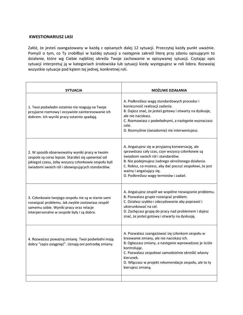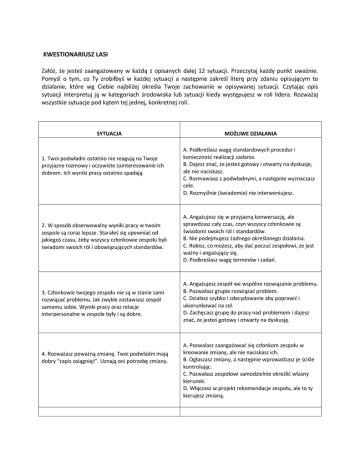 KWESTIONARIUSZ LASI Załóż, że jesteś zaangażowany w każdą z opisanych dalej 12 sytuacji. Przeczytaj każdy punkt uważnie. Pomyśl o tym, co Ty zrobiłbyś w każdej sytuacji a następnie zakreśl literę przy zdaniu opisującym to działanie, które wg Ciebie najbliżej określa Twoje zachowanie w opisywanej sytuacji. Czytając opis sytuacji interpretuj ją w kategoriach środowiska lub sytuacji kiedy występujesz w roli lidera. Rozważaj wszystkie sytuacje pod kątem tej jednej, konkretnej roli. SYTUACJA 1. Twoi podwładni ostatnio nie reagują na Twoje przyjazne rozmowy i oczywiste zainteresowanie ich dobrem. Ich wyniki pracy ostatnio spadają. MOŻLIWE DZIAŁANIA A. Podkreślasz wagę standardowych procedur i konieczność realizacji zadania. B. Dajesz znać, że jesteś gotowy i otwarty na dyskusje, ale nie naciskasz. C. Rozmawiasz z podwładnymi, a następnie wyznaczasz cele. D. Rozmyślnie (świadomie) nie interweniujesz. 2. W sposób obserwowalny wyniki pracy w twoim zespole są coraz lepsze. Starałeś się upewniać od jakiegoś czasu, żeby wszyscy członkowie zespołu byli świadomi swoich ról i obowiązujących standardów. A. Angażujesz się w przyjazną konwersację, ale sprawdzasz cały czas, czyn wszyscy członkowie są świadomi swoich ról i standardów. B. Nie podejmujesz żadnego określonego działania. C. Robisz, co możesz, aby dać poczuć zespołowi, że jest ważny i angażujący się. D. Podkreślasz wagę terminów i zadań. 3. Członkowie twojego zespołu nie są w stanie sami rozwiązać problemu. Jak zwykle zostawiasz zespół samemu sobie. Wyniki pracy oraz relacje interpersonalne w zespole były i są dobre. A. Angażujesz zespół we wspólne rozwiązanie problemu. B. Pozwalasz grupie rozwiązać problem. C. Działasz szybko i zdecydowanie aby poprawić i ukierunkować na cel. D. Zachęcasz grupę do pracy nad problemem i dajesz znać, że jesteś gotowy i otwarty na dyskusję. 4. Rozważasz poważną zmianę. Twoi podwładni mają dobry “zapis osiągnięć”. Uznają oni potrzebę zmiany. A. Pozwalasz zaangażować się członkom zespołu w kreowanie zmiany, ale nie naciskasz ich. B. Ogłaszasz zmiany, a następnie wprowadzasz je ściśle kontrolując. C. Pozwalasz zespołowi samodzielnie określić własny kierunek. D. Włączasz w projekt rekomendacje zespołu, ale to ty kierujesz zmianą. 5. Wyniki pracy twojego zespołu obniżały się w ciągu ostatnich kilku miesięcy. Członków nie obchodziła realizacja celów. W przeszłości przedefiniowanie ról pomagało. Twoi ludzie potrzebują ciągłego przypominania, aby praca była zrobiona. A. Pozwalasz zespołowi samodzielnie określić własny kierunek B. Uwzględniasz rekomendacje zespołu, ale pilnujesz, aby cele zostały zrealizowane. C. Redefiniujesz cele? (Przypominasz) i ostrożnie? Uważnie? Nadzorujesz.. D. Sprawiasz, że zespół angażuje się w podejmowanie decyzji, ale dopilnowujesz, aby cele zostały osiągnięte. 6. Kiedy przyszedłeś do zespołu zastałeś sytuacje, w której rzeczy toczą się sprawnie. Twój poprzednik prowadził twardą politykę płacową i kadrową. Chcesz utrzymać produktywność, a równocześnie chciałbyś zacząć humanizować środowisko. A. Robisz, co możesz, aby grupa poczuła się ważna i włączona w działania. B. Podkreślasz wagę terminów i zadań. C. Świadomie nie interweniujesz. D. Sprawiasz, że zespół angażuje się w podejmowanie decyzji, ale nadzorujesz realizację celów. 7. Rozważasz duże zmiany w strukturze organizacyjnej. Członkowie zespołu przekazali uwagi o potrzebnych zmianach. Grupa wykazała elastyczność w swoich codziennych działaniach. A. Określasz zmianę i uważnie nadzorujesz wprowadzenie. B. Zdobywasz akceptację grupy i pozwalasz im samym wdrożyć zmianę. C. Jesteś skłonny do wprowadzenia zmian zgodnie z rekomendacjami, ale utrzymujesz kontrolę nad wprowadzeniem. D. Unikasz konfrontacji i pozostawiasz bieg rzeczy samemu sobie. 8. Praca zespołu i relacje interpersonalne są dobre. Czujesz się trochę niepewnie w związku z brakiem kierunku dla zespołu. A. Pozostawiasz zespół samemu sobie. B. Dyskutujesz sytuację z grupą a następnie inicjujesz konieczne zmiany. C. Podejmujesz kroki , aby ukierunkować pracę zespołu w stronę jasno określonych zasad. D. Jesteś ostrożny, aby nie zepsuć relacji szefprzełożony przez bycie zbyt dyrektywnym. 9. Twój przełożony mianował cię na stanowisko, abyś pokierował pracą zespołu, który jest daleko z tyłu jeśli chodzi o realizację rekomendowanych zmian. Zespół nie ma jasności swoich celów. Frekwencja na spotkaniach jest słaba. Zebrania przekształciły się w spotkania towarzyskie. Ludzie w zespole mają wystarczający potencjał, aby ci pomóc. A. Pozwalasz zespołowi samemu rozwiązać ten problem. B. Uwzględniasz rekomendacje grupy, ale sam pilnujesz, aby cele zostały osiągnięte. C. Przedefiniowujesz? Cele i uważnie nadzorujesz. D. Pozwalasz zespołowi zaangażować się w wyznaczanie celów, ale nie naciskasz. 10. Twoi podwładni, którzy zazwyczaj są w stanie przyjąć na siebie odpowiedzialności nie reagują pozytywnie na twoje ostatnie przedefiniowanie standardów. A. Pozwalasz zespołowi zaangażować się w wyznaczanie nowych standardów, ale nie naciskasz. B. Przedefiniowujesz standardy i uważnie nadzorujesz. C. Unikasz konfrontacji nie stosując nacisków. D. Wprowadzasz rekomendacje grupy, ale kontrolujesz, czy nowe standardy są osiągane. 11. Promowano Cię na nowe stanowisko. Poprzedni kierownik nie był zaangażowany w sprawy zespołu. Zespół realizuje zadania a relacje osobiste są dobre. A. Podejmujesz kroki, aby ukierunkować podwładnych na pracę w jasno określony sposób. B. Angażujesz podwładnych w podejmowanie decyzji...? C. Rozmawiasz na temat wyników pracy w przeszłości i badasz potrzeby zespołu na nowe sposoby kierowania. D. Dalej pozostawiasz grupę samą sobie. 12. Ostatnie informacje 