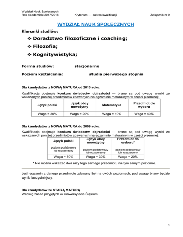 Wydział Nauk Społecznych Rok akademicki 2017/2018 Załącznik nr 9 Kryterium — zakres kwalifikacji WYDZIAŁ NAUK SPOŁECZNYCH Kierunki studiów: v Doradztwo filozoficzne i coaching; v Filozofia; v Kognitywistyka; Forma studiów: stacjonarne Poziom kształcenia: studia pierwszego stopnia Dla kandydatów z NOWĄ MATURĄ od 2010 roku: Kwalifikacja obejmuje konkurs świadectw dojrzałości — brane są pod uwagę wyniki ze wskazanych poniżej przedmiotów zdawanych na egzaminie maturalnym w części pisemnej: Język polski Język obcy nowożytny Matematyka Przedmiot do wyboru Waga = 30% Waga = 20% Waga = 10% Waga = 40% Dla kandydatów z NOWĄ MATURĄ do 2009 roku: Kwalifikacja obejmuje konkurs świadectw dojrzałości — brane są pod uwagę wyniki ze wskazanych poniżej przedmiotów zdawanych na egzaminie maturalnym w części pisemnej: Język obcy Przedmiot do Język polski nowożytny wyboru* poziom podstawowy lub rozszerzony Waga = 50% poziom podstawowy lub rozszerzony poziom podstawowy lub rozszerzony Waga = 30% Waga = 20% * Nie można wskazać dwa razy tego samego przedmiotu na tym samym poziomie. Jeśli egzamin z danego przedmiotu zdawany był na dwóch poziomach, pod uwagę brany będzie wynik korzystniejszy. Dla kandydatów ze STARĄ MATURĄ Według zasad przyjętych w Uniwersytecie Śląskim. 1 Wydział Nauk Społecznych Rok akademicki 2017/2018 Załącznik nr 9 Kryterium — zakres kwalifikacji Kierunki studiów: v Doradztwo filozoficzne i coaching; v Filozofia; v Kognitywistyka; Forma studiów: Poziom kształcenia: niestacjonarne studia pierwszego stopnia Wstęp na studia: na podstawie złożenia wymaganych dokumentów, po zarejestrowaniu się kandydata w systemie Internetowej Rejestracji Kandydatów (IRK). uprzednim Kierunek studiów: v Filozofia Forma studiów: Poziom kształcenia: stacjonarne oraz niestacjonarne studia drugiego stopnia Kandydat ubiegający się o przyjęcie posiada kwalifikacje oraz kompetencje niezbędne do podjęcia kształcenia na studiach II stopnia na tym kierunku, a w szczególności — wiedzę i umiejętności z obszaru nauk humanistycznych lub społecznych oraz z innych obszarów wiedzy. Wstęp na studia: na podstawie złożenia wymaganych dokumentów, po zarejestrowaniu się kandydata w systemie Internetowej Rejestracji Kandydatów (IRK). uprzednim W przypadku, gdy liczba kandydatów przekroczy limit przyjęć o przyjęciu decyduje miejsce na liście rankingowej, utworzonej w oparciu o ocenę na dyplomie ukończenia studiów wyższych, wg zasad: § ukończenie studiów w obszarze nauk humanistycznych lub społecznych — ocena mnożona x 2; § ukończenie studiów w obszarze pozostałych nauk — ocena mnożona x 1. 2 Wydział Nauk Społecznych Rok akademicki 2017/2018 Załącznik nr 9 Kryterium — zakres kwalifikacji Kierunek studiów: v Doradztwo filozoficzne i coaching Forma studiów: Poziom kształcenia: stacjonarne oraz niestacjonarne studia drugiego stopnia Kandydat ubiegający się o przyjęcie posiada kwalifikacje oraz kompetencje niezbędne do podjęcia kształcenia na studiach II stopnia na tym kierunku, a w szczególności — wiedzę i umiejętności z obszaru nauk humanistycznych lub społecznych. Wstęp na studia: na podstawie złożenia wymaganych dokumentów, po zarejestrowaniu się kandydata w systemie Internetowej Rejestracji Kandydatów (IRK). uprzednim W przypadku, gdy liczba kandydatów przekroczy limit przyjęć o przyjęciu decyduje miejsce na liście rankingowej, utworzonej w oparciu o ocenę na dyplomie ukończenia studiów wyższych, wg zasady: § ukończenie kierunków: doradztwo filozoficzne i coaching, filozofia lub psychologia — ocena mnożona x 3; § ukończenie studiów w obszarze nauk humanistycznych lub społecznych — ocena mnożona x 2; § ukończenie studiów w obszarze pozostałych nauk — ocena mnożona x 1. 3 Wydział Nauk Społecznych Rok akademicki 2017/2018 Załącznik nr 9 Kryterium — zakres kwalifikacji Kierunek studiów: v Historia 1; v Turystyka historyczna; v Doradztwo i infobrokerstwo historyczne Forma studiów: stacjonarne Poziom kształcenia: studia pierwszego stopnia Dla kandydatów z NOWĄ MATURĄ od 2010 roku: Kwalifikacja obejmuje konkurs świadectw dojrzałości — brane są pod uwagę wyniki ze wskazanych poniżej przedmiotów zdawanych na egzaminie maturalnym w części pisemnej: Język polski Język obcy nowożytny Matematyka Przedmiot do wyboru Waga = 30% Waga = 20% Waga = 10% Waga = 40% Dla kandydatów z NOWĄ MATURĄ do 2009 roku: Kwalifikacja obejmuje konkurs świadectw dojrzałości — brane są pod uwagę wyniki ze wskazanych poniżej przedmiotów zdawanych na egzaminie maturalnym w części pisemnej: Język obcy Przedmiot Język polski nowożytny do wyboru* poziom podstawowy lub rozszerzony Waga = 35% poziom podstawowy lub rozszerzony poziom podstawowy lub rozszerzony Waga = 30% Waga = 35% * Nie można wskazać dwa razy tego samego przedmiotu na tym samym poziomie. Jeśli egzamin z danego przedmiotu zdawany był na dwóch poziomach, pod uwagę brany będzie wynik korzystniejszy. Dla kandydatów ze STARĄ MATURĄ: Według zasad przyjętych w Uniwersytecie Śląskim. Na ww. kierunku, oferowane są specjalności: administracyjno-samorządowa, archiwalna i zarządzanie dokumentacją, nauczycielska, muzealna. O uruchomieniu danej specjalności decyduje liczba zgłoszeń, uregulowana odrębnymi przepisami. 1 4 Wydział Nauk Społecznych Rok akademicki 2017/2018 Kryterium — zakres kwalifikacji Załącznik nr 9 Kierunek studiów: v Historia 2; v Turystyka historyczna Forma studiów: Poziom kształcenia: niestacjonarne studia pierwszego stopnia Wstęp na studia: na podstawie złożenia wymaganych dokumentów, po zarejestrowaniu się kandydata w systemie Internetowej Rejestracji Kandydatów (IRK). uprzednim Kierunek studiów: v Historia 3 Forma studiów: Poziom kształcenia: stacjonarne studia drugiego stopnia Kandydat ubiegający się o przyjęcie posiada kwalifikacje oraz kompe