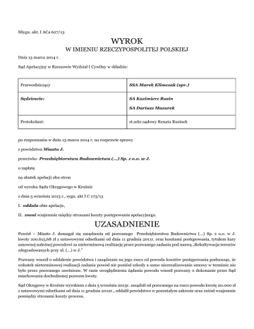 SSygn. akt. I ACa 627/13 WYROK W IMIENIU RZECZYPOSPOLITEJ POLSKIEJ Dnia 13 marca 2014 r. Sąd Apelacyjny w Rzeszowie Wydział I Cywilny w składzie: Przewodniczący SSA Marek Klimczak (spr.) Sędziowie: SA Kazimierz Rusin SA Dariusz Mazurek Protokolant: st.sekr.sądowy Renata Rusinek po rozpoznaniu w dniu 13 marca 2014 r. na rozprawie sprawy z powództwa Miasta J. przeciwko Przedsiębiorstwu Budownictwa (...) Sp. z o.o. w J. o zapłatę na skutek apelacji obu stron od wyroku Sądu Okręgowego w Krośnie z dnia 5 września 2013 r., sygn. akt I C 173/13 I. oddala obie apelacje, II. znosi wzajemnie między stronami koszty postępowania apelacyjnego. UZASADNIENIE Powód – Miasto J. domagał się zasądzenia od pozwanego Przedsiębiorstwa Budownictwa (...) Sp. z o.o. w J. kwoty 100.615,68 zł z ustawowymi odsetkami od dnia 11 grudnia 2011r. oraz kosztami postępowania, tytułem kary umownej należnej powodowi za nieterminową realizację przez pozwanego zadania pod nazwą „Rekultywacja terenów zdegradowanych przy ul. (...) w J.” Pozwany wnosił o oddalenie powództwa i zasądzenie na jego rzecz od powoda kosztów postępowania podnosząc, że wskutek nieterminowej realizacji zadania powód nie poniósł szkody a samo niezrealizowanie umowy w terminie nie było przez pozwanego zawinione. W razie uwzględnienia żądania powoda wnosił pozwany o dokonanie przez Sąd miarkowania dochodzonej pozwem kwoty. Sąd Okręgowy w Krośnie wyrokiem z dnia 5 września 2013r. zasądził od pozwanego na rzecz powoda kwotę 20.000 zł z ustawowymi odsetkami od dnia 11 grudnia 2012r., oddalił powództwo w pozostałym zakresie oraz zniósł wzajemnie pomiędzy stronami koszty procesu. Wyrok ten, jak wynika z jego pisemnego uzasadnienia, oparty został na następujących ustaleniach faktycznych i wnioskach prawnych. W dniu 3 października 2011r. pomiędzy powodem Miastem J., jako inwestorem, a Przedsiębiorstwem Budownictwa (...). z w J., jako wykonawcą, została zawarta w trybie ustawy z dnia 29 stycznia 2004r. Prawo zamówień publicznych umowa, której przedmiotem była realizacja zadania pod nazwą „Rekultywacja terenów zdegradowanych przy ulicy (...) w J.”. Strony ustaliły termin rozpoczęcia prac na dzień protokolarnego przekazania terenu robót wykonawcy, zaś termin zakończenia na dzień 31 października 2012r., przy dniem zakończenia robót miał być dzień podpisania protokołu odbioru końcowego. Wysokość wynagrodzenia ustalono zgodnie z ceną ofertową na kwotę 3.718.244,45 zł (4.573.440,67 zł brutto). W umowie ustalono, że wszelkie zmiany i uzupełnienia umowy wymagają aneksu sporządzonego z zachowaniem formy pisemnej. Określono też przypadki, kiedy dopuszczalna będzie możliwość zmian umowy w zakresie terminu zakończenia robót oraz zmian harmonogramu rzeczowo – finansowego stanowiącego załącznik nr 2 do umowy. Takim przypadkiem objęto wystąpienie robót dodatkowych, od których wykonania uzależnione było wykonanie zamówienia podstawowego. W umowie określono także warunki naliczania przez zamawiającego kar umownych należnych od wykonawcy, w tym m. in. za opóźnienie w zakończeniu robót, określając ich wysokość na 0,1 wynagrodzenia za dzień opóźnienia. Po przystąpieniu do wykonywania prac wykonawca stwierdził w terenie występowanie litych skał oraz czynnych źródeł, o których nie było mowy w opracowanej na potrzeby inwestycji dokumentacji geotechnicznej wchodzącej w skład dokumentacji przetargowej. W rezultacie strony zawarły w dniu 25 czerwca 2012r. umowę na roboty dodatkowe, której przedmiotem było odspojenie i wydobycie gruntu skalnego. W umowie tej określono termin realizacji robót na okres od 25 czerwca 2012r. do 4 lipca oraz dodatkowe wynagrodzenie na kwotę 36.900 zł. W tym samym dniu aneksem zmieniono harmonogram rzeczowo finansowy stanowiący załącznik nr 2 do umowy z 3 października 2011r. Jako przyczynę tej zmiany wskazano wystąpienie robót dodatkowych, od których wykonania uzależnione było wykonanie zamówienia podstawowego. Mimo określenia w umowie dodatkowej czasokresu kucia skał, faktycznie dotyczyła ona skał skutych od stycznia do maja 2012r. Potrzeba kucia skał występowała także w okresie późniejszym. W trakcie wykonywania prac okazało się także, że projekt budowalny zawierał błędy i nieścisłości wynikające z niedostosowania do warunków miejscowych, uniemożliwiające realizację poszczególnych robót. Spostrzeżone błędy projektowe uniemożliwiające realizację poszczególnych elementów przedsięwzięcia były na bieżąco opracowywane przez kierownika budowy i inspektora nadzoru, a następnie przedkładane przez inwestora do akceptacji biura projektowego. Przystępowanie do kolejnych robót wymagających zmian następowało po uzyskaniu częściowych zgód projektanta na poszczególne zmiany, przy czym zgody te były wyrażane w różnych terminach, nawet kilkumiesięcznych. Nadto zdarzało się, że poprawiony projekt nadal zawierał nieścisłości i wymagał poprawy. Po raz pierwszy pozwany zwrócił się do powoda o przesunięcie o jeden miesiąc terminu zakończenia robót na posiedzeniu rady budowy w dniu 12 września 2012r. Z oficjalnym pismem wystąpił w dniu 24 września 2012r. wskazując, jako powód wystąpienie nieprzewidzianych robót związanych z odspajaniem znacznej ilości skał w sierpniu i wrześniu 2012r. Wniosek powoda do Marszałka Województwa w tej sprawie został zaopiniowany pozytywnie. Pomimo tego aneks do umowy zmieniający termin zakończenia prac nie został zawarty. Pismem z dnia 5 listopada 2012r. doręczonym powodowi w dniu następnym pozwany zgłosił powodowi zakończenie robót i gotowość odbioru. Powód wyznaczył termin rozpoczęcia odbioru końcowego na dzień 9 listopada 2012r. Przedmiot umowy został odebrany protokołem odbioru końcowego robót w dniu 22 listopada 2012r. Pismem z dnia 6 grudnia 2012r., doręczonym w tym samym dn