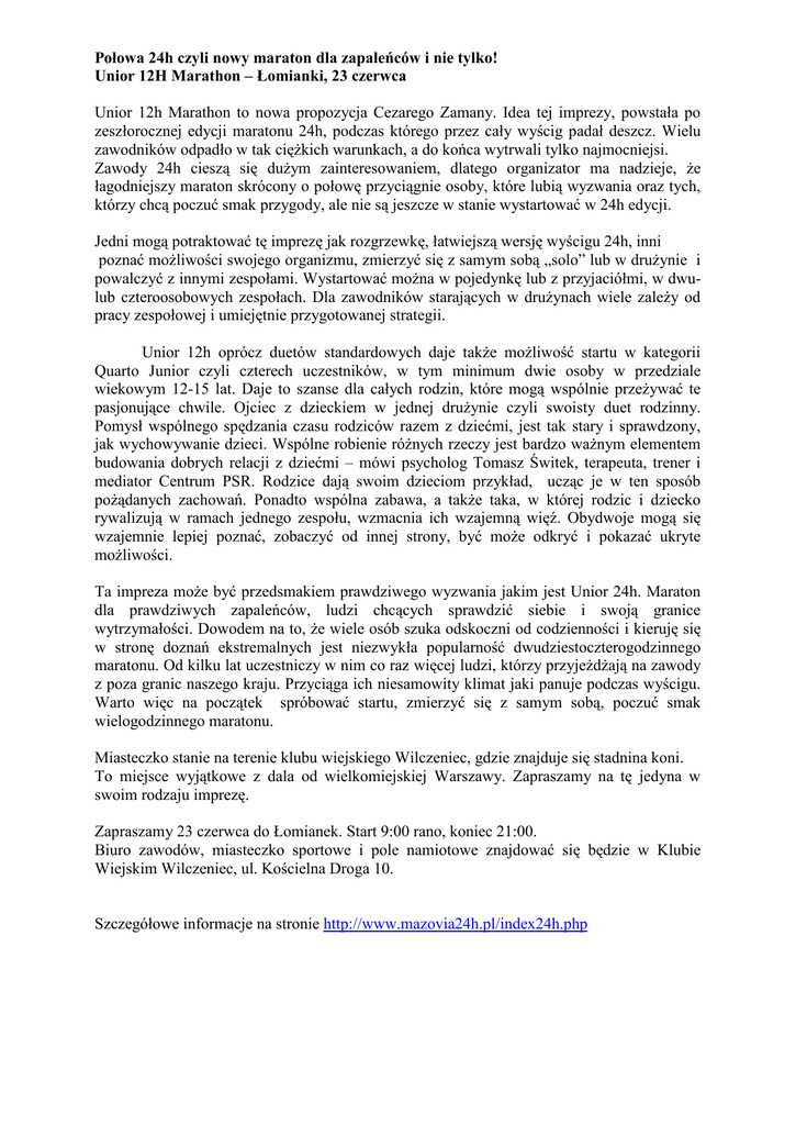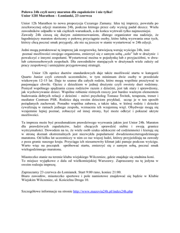 Połowa 24h czyli nowy maraton dla zapaleńców i nie tylko! Unior 12H Marathon – Łomianki, 23 czerwca Unior 12h Marathon to nowa propozycja Cezarego Zamany. Idea tej imprezy, powstała po zeszłorocznej edycji maratonu 24h, podczas którego przez cały wyścig padał deszcz. Wielu zawodników odpadło w tak ciężkich warunkach, a do końca wytrwali tylko najmocniejsi. Zawody 24h cieszą się dużym zainteresowaniem, dlatego organizator ma nadzieje, że łagodniejszy maraton skrócony o połowę przyciągnie osoby, które lubią wyzwania oraz tych, którzy chcą poczuć smak przygody, ale nie są jeszcze w stanie wystartować w 24h edycji. Jedni mogą potraktować tę imprezę jak rozgrzewkę, łatwiejszą wersję wyścigu 24h, inni poznać możliwości swojego organizmu, zmierzyć się z samym sobą „solo” lub w drużynie i powalczyć z innymi zespołami. Wystartować można w pojedynkę lub z przyjaciółmi, w dwulub czteroosobowych zespołach. Dla zawodników starających w drużynach wiele zależy od pracy zespołowej i umiejętnie przygotowanej strategii. Unior 12h oprócz duetów standardowych daje także możliwość startu w kategorii Quarto Junior czyli czterech uczestników, w tym minimum dwie osoby w przedziale wiekowym 12-15 lat. Daje to szanse dla całych rodzin, które mogą wspólnie przeżywać te pasjonujące chwile. Ojciec z dzieckiem w jednej drużynie czyli swoisty duet rodzinny. Pomysł wspólnego spędzania czasu rodziców razem z dziećmi, jest tak stary i sprawdzony, jak wychowywanie dzieci. Wspólne robienie różnych rzeczy jest bardzo ważnym elementem budowania dobrych relacji z dziećmi – mówi psycholog Tomasz Świtek, terapeuta, trener i mediator Centrum PSR. Rodzice dają swoim dzieciom przykład, ucząc je w ten sposób pożądanych zachowań. Ponadto wspólna zabawa, a także taka, w której rodzic i dziecko rywalizują w ramach jednego zespołu, wzmacnia ich wzajemną więź. Obydwoje mogą się wzajemnie lepiej poznać, zobaczyć od innej strony, być może odkryć i pokazać ukryte możliwości. Ta impreza może być przedsmakiem prawdziwego wyzwania jakim jest Unior 24h. Maraton dla prawdziwych zapaleńców, ludzi chcących sprawdzić siebie i swoją granice wytrzymałości. Dowodem na to, że wiele osób szuka odskoczni od codzienności i kieruję się w stronę doznań ekstremalnych jest niezwykła popularność dwudziestoczterogodzinnego maratonu. Od kilku lat uczestniczy w nim co raz więcej ludzi, którzy przyjeżdżają na zawody z poza granic naszego kraju. Przyciąga ich niesamowity klimat jaki panuje podczas wyścigu. Warto więc na początek spróbować startu, zmierzyć się z samym sobą, poczuć smak wielogodzinnego maratonu. Miasteczko stanie na terenie klubu wiejskiego Wilczeniec, gdzie znajduje się stadnina koni. To miejsce wyjątkowe z dala od wielkomiejskiej Warszawy. Zapraszamy na tę jedyna w swoim rodzaju imprezę. Zapraszamy 23 czerwca do Łomianek. Start 9:00 rano, koniec 21:00. Biuro zawodów, miasteczko sportowe i pole namiotowe znajdować się będzie w Klubie Wiejskim Wilczeniec, ul. Kościelna Droga 10. Szczegółowe informacje na stronie http://www.mazovia24h.pl/index24h.php