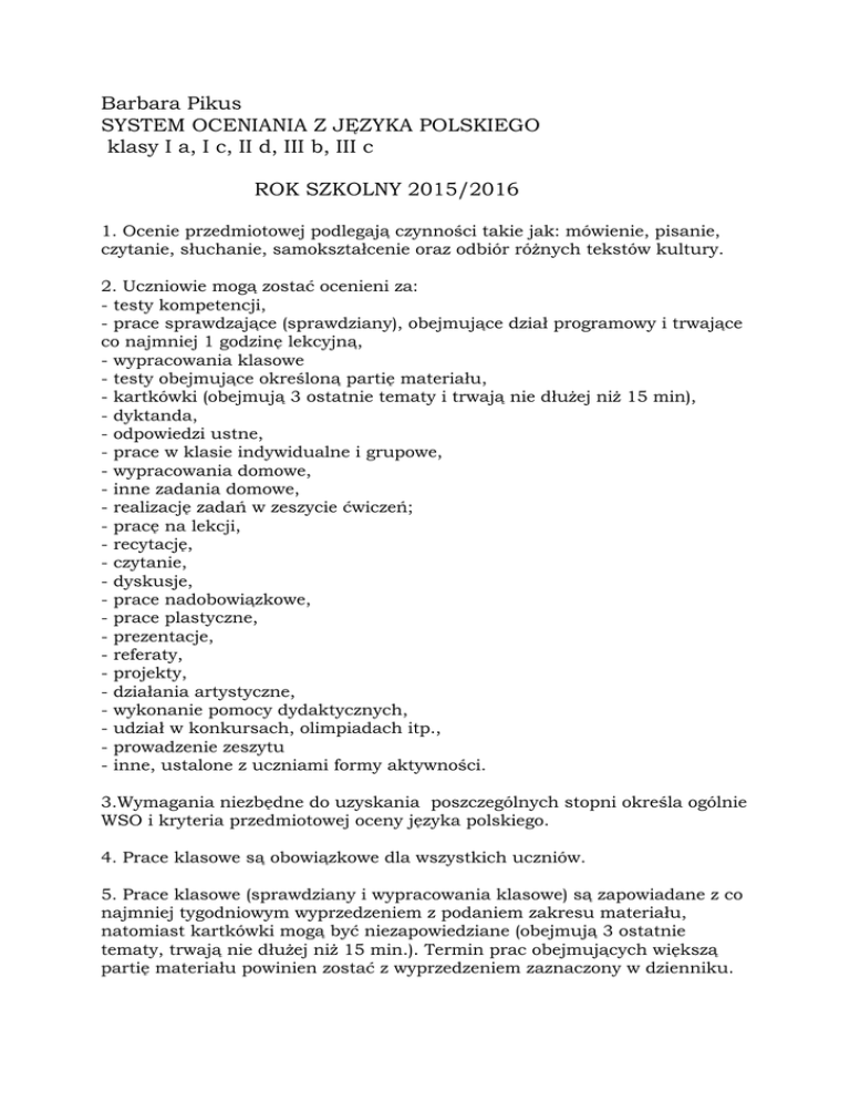 Barbara Pikus SYSTEM OCENIANIA Z JĘZYKA POLSKIEGO klasy I a, I c, II d, III b, III c ROK SZKOLNY 2015/2016 1. Ocenie przedmiotowej podlegają czynności takie jak: mówienie, pisanie, czytanie, słuchanie, samokształcenie oraz odbiór różnych tekstów kultury. 2. Uczniowie mogą zostać ocenieni za: - testy kompetencji, - prace sprawdzające (sprawdziany), obejmujące dział programowy i trwające co najmniej 1 godzinę lekcyjną, - wypracowania klasowe - testy obejmujące określoną partię materiału, - kartkówki (obejmują 3 ostatnie tematy i trwają nie dłużej niż 15 min), - dyktanda, - odpowiedzi ustne, - prace w klasie indywidualne i grupowe, - wypracowania domowe, - inne zadania domowe, - realizację zadań w zeszycie ćwiczeń; - pracę na lekcji, - recytację, - czytanie, - dyskusje, - prace nadobowiązkowe, - prace plastyczne, - prezentacje, - referaty, - projekty, - działania artystyczne, - wykonanie pomocy dydaktycznych, - udział w konkursach, olimpiadach itp., - prowadzenie zeszytu - inne, ustalone z uczniami formy aktywności. 3.Wymagania niezbędne do uzyskania poszczególnych stopni określa ogólnie WSO i kryteria przedmiotowej oceny języka polskiego. 4. Prace klasowe są obowiązkowe dla wszystkich uczniów. 5. Prace klasowe (sprawdziany i wypracowania klasowe) są zapowiadane z co najmniej tygodniowym wyprzedzeniem z podaniem zakresu materiału, natomiast kartkówki mogą być niezapowiedziane (obejmują 3 ostatnie tematy, trwają nie dłużej niż 15 min.). Termin prac obejmujących większą partię materiału powinien zostać z wyprzedzeniem zaznaczony w dzienniku. 6. Prace sprawdzające i testy są omawiane szczegółowo w klasie w oparciu o kartotekę sprawdzianu i analizę wyników. 7. Jeśli uczeń ma uzasadnione uwagi co do przyznawania punktów za zadania sprawdzianu, zgłasza je nauczycielowi, który ponownie ustali ocenę. 8. Nauczyciel sprawdza prace w ciągu 12 dni roboczych; może przedłużyć ten termin tylko, kiedy umówi się z uczniami – w przeciwnym wypadku wstawia tylko te oceny, które są korzystne dla ucznia. 9. Wszystkie prace po sprawdzeniu uczeń ma prawo obejrzeć i zgłosić ewentualne uwagi nauczycielowi. Ocenione prace uczeń otrzymuje do domu w celu okazania jej rodzicom i dokonania poprawy. 10. W razie usprawiedliwionej nieobecności na sprawdzianie uczeń musi przystąpić do niego w ustalonym z nauczycielem terminie w ciągu dwóch tygodni od ustania przyczyny nieobecności. Nieuzasadnione nieprzystąpienie do poprawy daje podstawę do wystawienia cząstkowej oceny niedostatecznej (bez możliwości poprawy). 11. Poprawa prac klasowych jest dobrowolna dla uczniów i musi się odbyć w ciągu dwóch tygodni od daty rozdania prac. Formę i termin poprawy ustala nauczyciel na prośbę zainteresowanych przed upływem dwóch tygodni od daty rozdania prac. Uczeń przystępuje do niej tylko raz. 12. Ocenę ze sprawdzianu, testu lub wypracowania, jeśli jest ono klasowe, można jednorazowo poprawić, a ocenę niedostateczną trzeba poprawić obowiązkowo. 13. Stopień uzyskany z poprawy pracy klasowej jest wpisywany do dziennika. 14. Nauczyciel podczas omawiania każdego sprawdzianu podaje uczniom punktację przewidzianą za poszczególne umiejętności, wiedzę, zadania czy polecenia oraz liczbę punktów wymaganą do otrzymania określonej oceny. 15. Jeśli z jakichś przyczyn w terminie nie mogły się odbyć ważne, zapowiedziane sprawdziany lub prace klasowe, zostają one przełożone na najbliższą lekcję, pod warunkiem, że nie będzie to 4. z kolei sprawdzian w tygodniu. Ta zasada nie obowiązuje, jeśli uczniowie usilnie zabiegają o przełożenie pracy, mając świadomość, że zbiegnie im się to z innymi sprawdzianami. 16.Nie poprawia się oceny niedostatecznej za brak pracy domowej. Wyjątek stanowią wypracowania, które każdy uczeń ma prawo napisać jeszcze raz i dostarczyć na kolejną lekcję. Wtedy ocena niedostateczna. zostanie poprawiona. 17. Nie poprawia się oceny z kartkówki obejmującej ostatnie 3 tematy. 18. Za aktywną pracę na lekcji uczeń może otrzymać „plus”. Za 5 „plusów” zostaje wystawiona ocena bardzo dobra. 19. Lekceważenie poleceń nauczyciela, nieprzystąpienie do pracy w czasie lekcji, przeszkadzanie innym może skutkować sprawdzeniem stopnia opanowania zadanego materiału oraz wstawieniem oceny niedostatecznej. 20. Przygotowanie do lekcji obejmuje noszenie zeszytu, podręcznika, zeszytu ćwiczeń lub omawianej lektury. Za notoryczne lekceważenie tego obowiązku zostaje wystawiona ocena niedostateczna. 21. Ocena klasyfikacyjna nie jest średnią arytmetyczną ocen bieżących. Największą wagę mają oceny ze sprawdzianów, prac klasowych i ważnych prac domowych (wypracowań), mniejszą wagę mają oceny z kartkówek, aktywności i innych prac domowych, najmniejszą oceny za występy, recytację, czytanie. 22. Ocenie podlega obowiązkowe posiadanie zeszytu przedmiotowego. To dowód uczestnictwa w lekcji i miejsce odrabiania prac domowych. 23. Ocenie podlega systematyczne prowadzenie zeszytu i uzupełnianie go w wypadku nieobecności na zajęciach. Jego nieprowadzenie jest podstawą do wystawienia oceny niedostatecznej. Za każdy brak w zeszycie uczeń otrzymuje ocenę niedostateczną, ale może ją poprawić, uzupełniając luki w ciągu tygodnia. 24. Uczeń posiadający opinię z poradni psychologiczno – pedagogicznej ma dostosowane wymagania do indywidualnych potrzeb i możliwości opisanych w opinii. 25. Uczeń może wykonać przygotowane przez nauczyciela na początku roku zadania dodatkowe na ocenę celującą, ale nie więcej niż 2 zadania w trymestrze. Może jednak bez ograniczeń realizować inne zadania dodatkowe przedstawiane przez nauczyciela w ciągu roku, związane z realizowanym programem. 26. Oprócz ocen w rubryce danego ucznia mogą się znaleźć inne oznaczenia: np. - nieprzygotowany; nb. - nieobecny; (+), (-) praca na danej lekcji 27. Poprawienie t