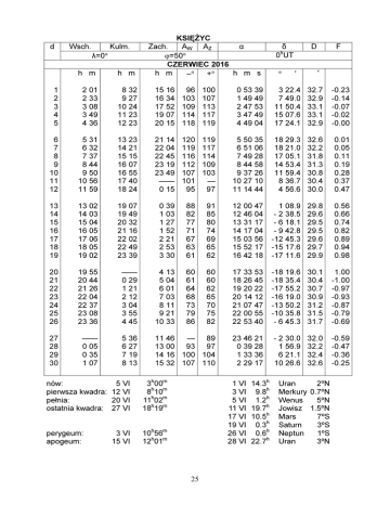 d Wsch. Kulm. λ=0° KSIĘŻYC Zach. AW AZ α ϕ=50° CZERWIEC 2016 h m h m s +° –° δ 0 UT D F h h m h m 1 2 3 4 5 2 01 2 33 3 08 3 49 4 36 8 32 9 27 10 24 11 23 12 23 15 16 16 34 17 52 19 07 20 15 96 103 109 114 118 100 107 113 117 119 0 53 39 1 49 49 2 47 53 3 47 49 4 49 04 3 22.4 7 49.0 11 50.4 15 07.6 17 24.1 32.7 32.9 33.1 33.1 32.9 -0.23 -0.14 -0.07 -0.02 -0.00 6 7 8 9 10 11 12 5 31 6 32 7 37 8 44 9 50 10 56 11 59 13 23 14 21 15 15 16 07 16 55 17 40 18 24 21 14 22 04 22 45 23 19 23 49 —— 0 15 120 119 116 112 107 101 95 119 117 114 109 103 — 97 5 50 35 6 51 06 7 49 28 8 44 58 9 37 26 10 27 10 11 14 44 18 29.3 18 21.0 17 05.1 14 53.4 11 59.4 8 36.7 4 56.6 32.6 32.2 31.8 31.3 30.8 30.4 30.0 0.01 0.05 0.11 0.19 0.28 0.37 0.47 13 14 15 16 17 18 19 13 02 14 03 15 04 16 05 17 06 18 05 19 02 19 07 19 49 20 32 21 16 22 02 22 49 23 39 0 39 1 03 1 27 1 52 2 21 2 53 3 30 88 82 77 71 67 63 61 91 85 80 74 69 65 62 12 00 47 12 46 04 13 31 17 14 17 04 15 03 56 15 52 17 16 42 18 1 08.9 - 2 38.5 - 6 18.1 - 9 42.8 -12 45.3 -15 17.6 -17 11.6 29.8 29.6 29.5 29.5 29.6 29.7 29.9 0.56 0.66 0.74 0.82 0.89 0.94 0.98 20 21 22 23 24 25 26 19 55 20 44 21 26 22 04 22 37 23 08 23 36 —— 0 29 1 21 2 12 3 04 3 55 4 45 4 13 5 04 6 01 7 03 8 11 9 21 10 33 60 61 64 68 73 79 86 60 60 62 65 70 75 82 17 33 53 18 26 45 19 20 22 20 14 12 21 07 47 22 00 55 22 53 40 -18 19.6 -18 35.4 -17 55.2 -16 19.0 -13 50.2 -10 35.8 - 6 45.3 30.1 30.4 30.7 30.9 31.2 31.5 31.7 1.00 -1.00 -0.97 -0.93 -0.87 -0.79 -0.69 27 28 29 30 —— 0 05 0 35 1 07 5 36 6 27 7 19 8 13 11 46 — 89 13 00 93 97 14 16 100 104 15 32 107 110 23 46 21 0 39 28 1 33 36 2 29 17 - 2 30.0 1 56.9 6 21.1 10 26.6 32.0 32.2 32.4 32.6 -0.59 -0.47 -0.36 -0.25 nów: 5 VI pierwsza kwadra: 12 VI pełnia: 20 VI ostatnia kwadra: 27 VI 3h00m 8h10m 11h02m 18h19m perygeum: apogeum: 10h56m 12h01m 3 VI 15 VI 1 VI 3 VI 5 VI 11 VI 17 VI 19 VI 26 VI 28 VI 25 14.3h 9.8h 1.2h 19.7h 10.5h 0.3h 0.6h 22.7h ° ' ' Uran 2ºN Merkury 0.7ºN Wenus 5ºN Jowisz 1.5ºN Mars 7ºS Saturn 3ºS Neptun 1ºS Uran 3ºN