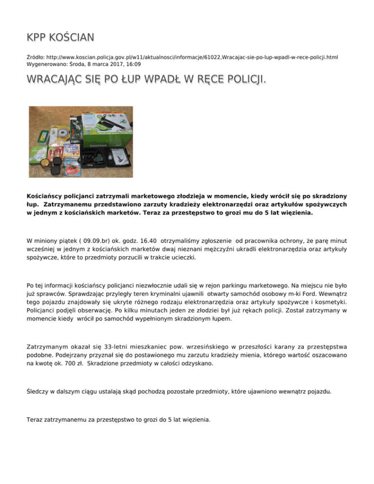 KPP KOŚCIAN WRACAJĄC SIĘ PO ŁUP WPADŁ W RĘCE POLICJI.