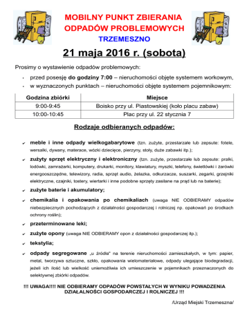 MOBILNY PUNKT ZBIERANIA ODPADÓW PROBLEMOWYCH TRZEMESZNO 21 maja 2016 r. (sobota) Prosimy o wystawienie odpadów problemowych: • przed posesję do godziny 7:00 – nieruchomości objęte systemem workowym, • w wyznaczonych punktach – nieruchomości objęte systemem pojemnikowym: Godzina zbiórki Miejsce 9:00-9:45 Boisko przy ul. Piastowskiej (koło placu zabaw) 10:00-10:45 Plac przy ul. 22 stycznia 7 Rodzaje odbieranych odpadów: ✔ meble i inne odpady wielkogabarytowe (tzn. zużyte, przestarzałe lub zepsute: fotele, wersalki, dywany, materace, wózki dziecięce, pierzyny, stoły, duże zabawki itp.); ✔ zużyty sprzęt elektryczny i elektroniczny (tzn. zużyte, przestarzałe lub zepsute: pralki, lodówki, zamrażarki, komputery, drukarki, monitory, klawiatury, myszki, telefony, świetlówki i żarówki energooszczędne, telewizory, radia, sprzęt audio, żelazka, odkurzacze, suszarki, zegarki, grzejniki elektryczne, czajniki, tostery, wiertarki i inne podobne sprzęty zasilane na prąd lub na baterie); ✔ zużyte baterie i akumulatory; ✔ chemikalia i opakowania po chemikaliach (uwaga NIE ODBIERAMY odpadów niebezpiecznych pochodzących z działalności gospodarczej i rolniczej np. opakowań po środkach ochrony roślin); ✔ przeterminowane leki; ✔ zużyte opony (uwaga NIE ODBIERAMY opon z działalności gospodarczej itp.); ✔ tekstylia; ✔ odpady segregowane „u źródła" na terenie nieruchomości zamieszkałych, w tym: papier, metal, tworzywa sztuczne, szkło, opakowania wielomateriałowe, odpady ulegające biodegradacji, jeżeli ich ilość lub wielkość uniemożliwia ich umieszczenie w pojemnikach przeznaczonych do selektywnej zbiórki odpadów. !!! UWAGA!!!! NIE ODBIERAMY ODPADÓW POWSTAŁYCH W WYNIKU POWADZENIA DZIAŁALNOŚCI GOSPODARCZEJ I ROLNICZEJ !!! /Urząd Miejski Trzemeszna/