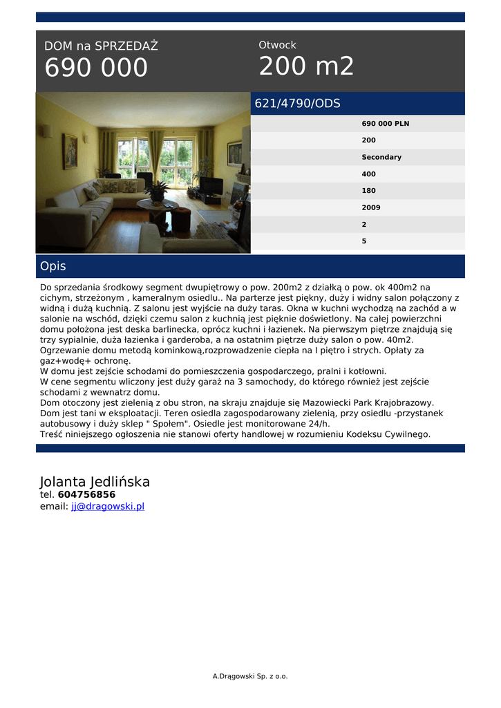 DOM na SPRZEDAŻ 690 000 Otwock 200 m2 621/4790/ODS 690 000 PLN 200 Secondary 400 180 2009 2 5 Opis Do sprzedania środkowy segment dwupiętrowy o pow. 200m2 z działką o pow. ok 400m2 na cichym, strzeżonym , kameralnym osiedlu.. Na parterze jest piękny, duży i widny salon połączony z widną i dużą kuchnią. Z salonu jest wyjście na duży taras. Okna w kuchni wychodzą na zachód a w salonie na wschód, dzięki czemu salon z kuchnią jest pięknie doświetlony. Na całej powierzchni domu położona jest deska barlinecka, oprócz kuchni i łazienek. Na pierwszym piętrze znajdują się trzy sypialnie, duża łazienka i garderoba, a na ostatnim piętrze duży salon o pow. 40m2. Ogrzewanie domu metodą kominkową,rozprowadzenie ciepła na I piętro i strych. Opłaty za gaz+wodę+ ochronę. W domu jest zejście schodami do pomieszczenia gospodarczego, pralni i kotłowni. W cene segmentu wliczony jest duży garaż na 3 samochody, do którego również jest zejście schodami z wewnatrz domu. Dom otoczony jest zielenią z obu stron, na skraju znajduje się Mazowiecki Park Krajobrazowy. Dom jest tani w eksploatacji. Teren osiedla zagospodarowany zielenią, przy osiedlu -przystanek autobusowy i duży sklep " Społem". Osiedle jest monitorowane 24/h. Treść niniejszego ogłoszenia nie stanowi oferty handlowej w rozumieniu Kodeksu Cywilnego. Jolanta Jedlińska tel. 604756856 email: [email protected] A.Drągowski Sp. z o.o. Powered by TCPDF (www.tcpdf.org)