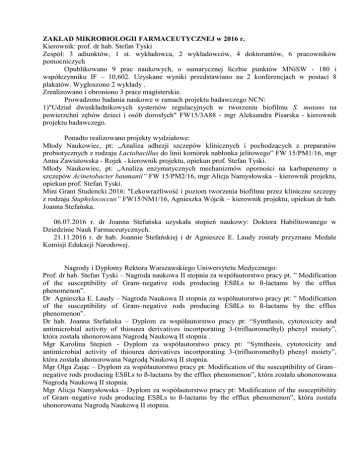 ZAKŁAD MIKROBIOLOGII FARMACEUTYCZNEJ w 2016 r. Kierownik: prof. dr hab. Stefan Tyski Zespół: 3 adiunktów, 1 st. wykładowca, 2 wykładowców, 4 doktorantów, 6 pracowników pomocniczych Opublikowano 9 prac naukowych, o sumarycznej liczbie punktów MNiSW - 180 i współczynniku IF – 10,602. Uzyskane wyniki przedstawiano na 2 konferencjach w postaci 8 plakatów. Wygłoszono 2 wykłady . Zrealizowano i obroniono 3 prace magisterskie. Prowadzono badania naukowe w ramach projektu badawczego NCN: 1)"Udział dwuskładnikowych systemów regulacyjnych w tworzeniu biofilmu S. mutans na powierzchni zębów dzieci i osób dorosłych" FW15/3A88 - mgr Aleksandra Pisarska - kierownik projektu badawczego. Ponadto realizowano projekty wydziałowe: Młody Naukowiec, pt: „Analiza adhezji szczepów klinicznych i pochodzących z preparatów probiotycznych z rodzaju Lactobacillus do linii komórek nabłonka jelitowego” FW 15/PM1/16, mgr Anna Zawistowska - Rojek - kierownik projektu, opiekun prof. Stefan Tyski. Młody Naukowiec, pt: „Analiza enzymatycznych mechanizmów oporności na karbapenemy u szczepów Acinetobacter baumanii” FW 15/PM2/16, mgr Alicja Namysłowska – kierownik projektu, opiekun prof. Stefan Tyski. Mini Grant Studencki 2016: "Lekowrażliwość i poziom tworzenia biofilmu przez kliniczne szczepy z rodzaju Staphylococcus” FW15/NM1/16, Agnieszka Wójcik – kierownik projektu, opiekun dr hab. Joanna Stefańska. 06.07.2016 r. dr Joanna Stefańska uzyskała stopień naukowy: Doktora Habilitowanego w Dziedzinie Nauk Farmaceutycznych. 21.11.2016 r. dr hab. Joannie Stefańskiej i dr Agnieszce E. Laudy zostały przyznane Medale Komisji Edukacji Narodowej. Nagrody i Dyplomy Rektora Warszawskiego Uniwersytetu Medycznego: Prof. dr hab. Stefan Tyski – Nagroda naukowa II stopnia za współautorstwo pracy pt. ” Modification of the susceptibility of Gram–negative rods producing ESßLs to ß-lactams by the efflux phenomenon”. Dr Agnieszka E. Laudy – Nagroda Naukowa II stopnia za współautorstwo pracy pt: ” Modification of the susceptibility of Gram–negative rods producing ESßLs to ß-lactams by the efflux phenomenon”. Dr hab. Joanna Stefańska – Dyplom za współautorstwo pracy pt: “Sytnthesis, cytotoxicity and antimicrobial activity of thiourea derivatives incortporating 3-(trifluoromethyl) phenyl moiety”, która została uhonorowana Nagrodą Naukową II stopnia . Mgr Karolina Stepień - Dyplom za współautorstwo pracy pt: “Sytnthesis, cytotoxicity and antimicrobial activity of thiourea derivatives incortporating 3-(trifluoromethyl) phenyl moiety”, która została uhonorowana Nagrodą Naukową II stopnia. Mgr Olga Zając – Dyplom za współautorstwo pracy pt: Modification of the susceptibility of Gram– negative rods producing ESßLs to ß-lactams by the efflux phenomenon”, która została uhonorowana Nagrodą Naukową II stopnia. Mgr Alicja Namysłowska – Dyplom za współautorstwo pracy pt: Modification of the susceptibility of Gram–negative rods producing ESßLs to ß-lactams by the efflux phenomenon”, która została uhonorowana Nagrodą Naukową II stopnia. Mgr Karolina Stępień - Nagroda za aktywny udział w realizacji badań naukowych oraz współautorstwo w cyklu publikacji badawczych dotyczących aktywności przeciwdrobnoustrojowej nowych związków chemicznych. Wyróżnienie Polskiego Towarzystwa Mikrobiologów za pracę przedstawioną w sesji plakatowej na XXVIII Zjeździe PTM „Czynniki wirulencji drobnoustrojów” dla prof. Stefana Tyskiego, dr hab. Joanny Stefańskiej, mgr Karoliny Stępień, mgr Bożeny Wolińskiej, Agnieszki Wójcik. 26 września 2016 r., podczas Walnego Zgromadzenia Delegatów Polskiego Towarzystwa Mikrobiologów w trakcie XXVIII Zjazdu PTM, wybrano nowe Prezydium Zarządu Głównego PTM na kadencję 2016-2020. Prezesem PTM został prof. Stefan Tyski. Na Sekretarza Zarządu Głównego PTM wybrano dr Agnieszkę E. Laudy. Mgr Alicja Słoczyńska (Namysłowska) odbyła 2 miesięczne szkolenie naukowe w ramach programu Erasmus plus w naukowym ośrodku zagranicznym Public Health England, National Infection Service, Technology Development Group, Porton Down, Salisbury, Wiltshire, United Kingdom, pod kierunkiem dr Matthew E. Wand. Dodatkowo realizowano następujące tematy naukowe: 1) Badania mikrobiologiczne aktywności przeciwdrobnoustrojowej nowych, zsyntetyzowanych związków chemicznych i związków naturalnych oraz preparatów pochodzenia roślinnego. 2) Badania udziału ruchomych elementów genetycznych w szerzeniu się lekooporności wśród szczepów pałeczek Gram-ujemnych. 3) Badania mechanizmów lekooporności Gram-ujemnych pałeczek, zwłaszcza oporności wynikającej z mechanizmu efflux oraz obecności enzymów typu ESßL.