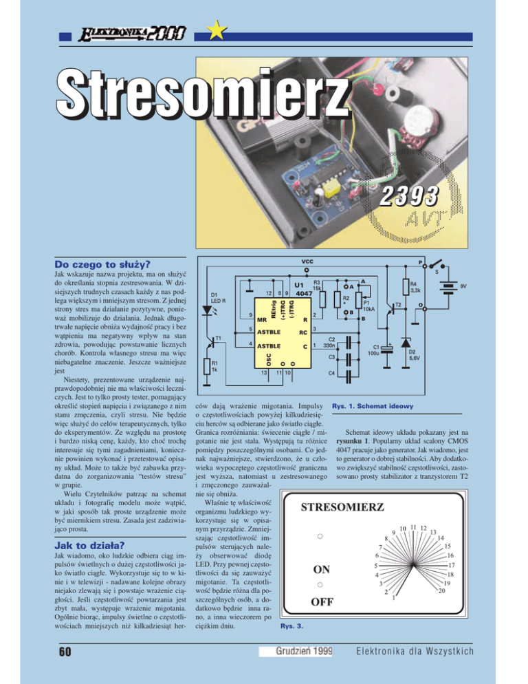 ★ Stresomierz 2393 Do czego to służy? Jak wskazuje nazwa projektu, ma on służyć do określania stopnia zestresowania. W dzi− siejszych trudnych czasach każdy z nas pod− lega większym i mniejszym stresom. Z jednej strony stres ma działanie pozytywne, ponie− waż mobilizuje do działania. Jednak długo− trwałe napięcie obniża wydajność pracy i bez wątpienia ma negatywny wpływ na stan zdrowia, powodując powstawanie licznych chorób. Kontrola własnego stresu ma więc niebagatelne znaczenie. Jeszcze ważniejsze jest Niestety, prezentowane urządzenie naj− prawdopodobniej nie ma właściwości leczni− czych. Jest to tylko prosty tester, pomagający określić stopień napięcia i związanego z nim stanu zmęczenia, czyli stresu. Nie będzie więc służyć do celów terapeutycznych, tylko do eksperymentów. Ze względu na prostotę i bardzo niską cenę, każdy, kto choć trochę interesuje się tymi zagadnieniami, koniecz− nie powinien wykonać i przetestować opisa− ny układ. Może to także być zabawka przy− datna do zorganizowania “testów stresu” w grupie. Wielu Czytelników patrząc na schemat układu i fotografię modelu może wątpić, w jaki sposób tak proste urządzenie może być miernikiem stresu. Zasada jest zadziwia− jąco prosta. Jak to działa? Jak wiadomo, oko ludzkie odbiera ciąg im− pulsów świetlnych o dużej częstotliwości ja− ko światło ciągłe. Wykorzystuje się to w ki− nie i w telewizji − nadawane kolejne obrazy niejako zlewają się i powstaje wrażenie cią− głości. Jeśli częstotliwość powtarzania jest zbyt mała, występuje wrażenie migotania. Ogólnie biorąc, impulsy świetlne o częstotli− wościach mniejszych niż kilkadziesiąt her− 60 ców dają wrażenie migotania. Impulsy Rys. 1. Schemat ideowy o częstotliwościach powyżej kilkudziesię− ciu herców są odbierane jako światło ciągłe. Schemat ideowy układu pokazany jest na Granica rozróżniania: świecenie ciągłe / mi− gotanie nie jest stała. Występują tu różnice rysunku 1. Popularny układ scalony CMOS pomiędzy poszczególnymi osobami. Co jed− 4047 pracuje jako generator. Jak wiadomo, jest nak najważniejsze, stwierdzono, że u czło− to generator o dobrej stabilności. Aby dodatko− wieka wypoczętego częstotliwość graniczna wo zwiększyć stabilność częstotliwości, zasto− jest wyższa, natomiast u zestresowanego sowano prosty stabilizator z tranzystorem T2 i zmęczonego zauważal− nie się obniża. Właśnie tę właściwość organizmu ludzkiego wy− korzystuje się w opisa− nym przyrządzie. Zmniej− szając częstotliwość im− pulsów sterujących nale− ży obserwować diodę LED. Przy pewnej często− tliwości da się zauważyć migotanie. Ta częstotli− wość będzie różna dla po− szczególnych osób, a do− datkowo będzie inna ra− no, a inna wieczorem po ciężkim dniu. Rys. 3. Elektronika dla Wszystkich i diodą Zenera D2, dający napięcie około 5V. Tym samym wpływ zmian napięcia baterii na częstotliwość generatora jest jeszcze bardziej zredukowany. Ma to duże znaczenie w tym układzie, ponieważ właściwości przyrządu muszą być powtarzalne, by można było po− równać wyniki pomiarów porannych z wie− czornymi. Sygnał z nóżki 11 układu scalonego jest podawany na tranzystor T1. Wartość rezysto− Wykaz elementów Rezystory: R1 . . . . . . . . . . . . . . . . . . . . . . . . . . . . . . 1kΩ R2 . . . . . . . . . . . . . . . . . . . . . . . . * patrz tekst R3 . . . . . . . . . . . . . . . . . . . . . . . . . . . . . 15k Ω R4 . . . . . . . . . . . . . . . . . . . . . . . . . . . . 3,3k Ω P1 . . . . . . . . . . . . . . . . . potencjometr 10k ΩA Kondensatory: C1 . . . . . . . . . . . . . . . . . . . . . . . . . 100µF/16V C2 . . . . . . . . . . . . . . . . . . . . . . . . . . . . 330nF C3,C4 . . . . . . . . . . . . . . . . . . . . . . * patrz tekst Półprzewodniki: D1 . . . . . . . . . . . . . . . . . . LED czerwona 5mm D2 . . . . . . . . . . . . . . . . . . . dioda Zenera 5,6V T1,T2 . . . . . . . . . . . . . . . . . . . . . . . . . . BC548 U1 . . . . . . . . . . . . . . . . . . . . . . . . CMOS 4047 Inne: S . . . . . . . . . . . . . . . . . . . . . . . . . . . wyłącznik obudowa typu Z30A złączka do baterii ra R1 decyduje o jasności świecenia diody LED D1. Częstotliwość migotania tej diody zależy od ustawienia potencjometru P1. W układzie przewidziano miejsce na trzy kondensatory (C2, C3, C4), co pozwoli w ra− zie potrzeby uzyskać dowolną pojemność. Rezystor R3 wyznacza najwyższą często− tliwość, przy skręceniu potencjometru na mi− nimum. Zakres zmian, a tym samym najniż− szą częstotliwość, wyznacza rezystancja po− tencjometru P1. W podstawowej wersji rezy− stor R2 nie jest stosowany. W modelu zastosowano tylko jeden kon− densator, C2 o pojemności 330nF. Przy war− tościach elementów jak na schemacie i w wy− kazie, częstotliwość daje się regulować w szerokim zakresie, od 27,5Hz do 46Hz. Ta− kie wartości elementów warto zastosować na początek (i takie wchodzą w skład kitu AVT− 2393). Później, gdyby się okazało, że u testo− wanych osób wymagany zakres zmian czę− stotliwości jest znacznie mniejszy, można sa− modzielnie zmniejszyć ten zakres. Kto chciałby obliczyć częstotliwości, może sko− rzystać z wzoru: f = 1 / (4,40 * R * C) Zamiast obliczać, lepiej jest dokonać tego metodą eksperymentalną. Procedura jest na− Uwaga! Naklejka wg rys. 3 nie wchodzi skład ki− tu AVT−22393. Komplet podzespołów z płytką jest dostępny w sieci handlowej AVT jako kit szkolny AVT−2393 Elektronika dla Wszystkich Rys 2. Schemat montażowy stępująca: przy potencjometrze P1, skręco− nym na zero rezystancji, należy dodać kon− densatory C3, C4 (rzędu kilkudziesięciu czy kilkunastu nanofaradów). Obniży to maksy− malną częstotliwość generatora. Następnie nale
