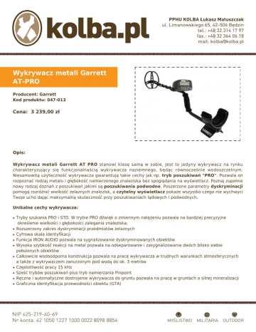 Wykrywacz metali Garrett AT-PRO Producent: Garrett Kod produktu: 047-013 Cena: 3 239,00 zł Opis: Wykrywacz metali Garrett AT PRO stanowi klasę samą w sobie. Jest to jedyny wykrywacz na rynku charakteryzujący się funkcjonalnaścią wykrywacza naziemnego, będąc równocześnie wodoszczelnym. Niesamowitą użyteczność wykrywacza gwarantują takie cechy jak np. tryb poszukiwań "PRO". Pozwala on rozpoznać rodzaj metalu i głębokość namierzonego znaleziska bez spoglądania na wyświetlacz. Poznaj zupełnie nowy rodzaj doznań z poszukiwań jakimi są poszukiwania podwodne. Poszerzone parametry dyskryminacji pomogą rozróżnić wielkość żelaznych znalezisk, a czytelny wyświetlacz pokaże wszystko czego nie wychwyci Twoje ucho dając maksymalną skuteczność przy poszukiwaniach lądowych i podwodnych. Unikalne cechy wykrywacza: ● ● ● ● ● ● ● ● ● ● Tryby szukania PRO i STD. W trybie PRO dźwięk o zmiennym natężeniu pozwala na bardziej precyzyjne określenie wielkości i głębokości zalegania znaleziska; Rozszerzony zakres dyskryminacji przedmiotów żelaznych Cyfrowa skala identyfikacji Funkcja IRON AUDIO pozwala na sygnalizowanie dyskryminowanych obiektów Wysoka szybkość reakcji na metal pozwala na odseparowanie i zasygnalizowanie dwóch blisko siebie położonych obiektów Całkowicie wodoodporna konstrukcja pozwala na pracę wykrywacza w trudnych warunkach atmosferycznych a także z wykrywaczem zanurzonym pod wodą do ok. 3 metrów Częstotliwość pracy 15 kHz Sześć trybów poszukiwań plus tryb namierzania Pinpoint Ręczne i automatyczne dostrojenie wykrywacza do gruntu pozwala na pracę w gruntach o silnej mineralizacji Graficzna identyfikacja przewodności obiektu (GTA) ● ● Wskaźnik głębokości zalegania obiektu Wskaźnik naładowania baterii. Funkcje i ustawienia dodatkowe: ● ● ● ● ● ● ● ● ● ● ● Kursor identyfikacji 12 punktowy 40 punktowy zakres dyskryminacji żelaza Dyskryminacja wybiórcza 6 programów fabrycznych (3 w trybie STD , 3 w trybie PRO) 8 punktowa skala ustawienia czułości Namierzanie Pinpoint Częstotliwość pracy 15 kHz Ilość tonów 3 Rozmiar cewki 8.5" x 11" DD PROformance Regulowana długość wysięgnika 1.06m - 1.29m;Waga 1.4 kg. Zasilanie 4 baterie AA. Zestaw zawiera: ● ● ● wykrywacz Garrett AT PRO sondę DD 8,5x11" słuchawki Gwarancja: 24 miesiące