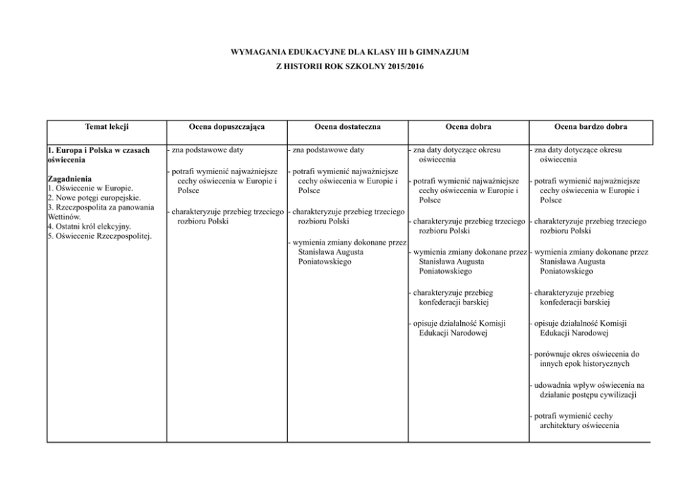 WYMAGANIA EDUKACYJNE DLA KLASY III b GIMNAZJUM Z HISTORII ROK SZKOLNY 2015/2016 Temat lekcji 1. Europa i Polska w czasach oświecenia Zagadnienia 1. Oświecenie w Europie. 2. Nowe potęgi europejskie. 3. Rzeczpospolita za panowania Wettinów. 4. Ostatni król elekcyjny. 5. Oświecenie Rzeczpospolitej. Ocena dopuszczająca Ocena dostateczna - zna podstawowe daty - zna podstawowe daty - potrafi wymienić najważniejsze cechy oświecenia w Europie i Polsce - potrafi wymienić najważniejsze cechy oświecenia w Europie i Polsce Ocena dobra Ocena bardzo dobra - zna daty dotyczące okresu oświecenia - zna daty dotyczące okresu oświecenia - potrafi wymienić najważniejsze cechy oświecenia w Europie i Polsce - potrafi wymienić najważniejsze cechy oświecenia w Europie i Polsce - charakteryzuje przebieg trzeciego - charakteryzuje przebieg trzeciego rozbioru Polski rozbioru Polski - charakteryzuje przebieg trzeciego - charakteryzuje przebieg trzeciego rozbioru Polski rozbioru Polski - wymienia zmiany dokonane przez Stanisława Augusta - wymienia zmiany dokonane przez - wymienia zmiany dokonane przez Poniatowskiego Stanisława Augusta Stanisława Augusta Poniatowskiego Poniatowskiego - charakteryzuje przebieg konfederacji barskiej - charakteryzuje przebieg konfederacji barskiej - opisuje działalność Komisji Edukacji Narodowej - opisuje działalność Komisji Edukacji Narodowej - porównuje okres oświecenia do innych epok historycznych - udowadnia wpływ oświecenia na działanie postępu cywilizacji - potrafi wymienić cechy architektury oświecenia 2. Czas wielkich przemian Zagadnienia 1. Powstanie Stanów Zjednoczonych. 2. Rewolucja francuska. 3. Sejm Wielki. 4. Upadek Rzeczpospolitej. 5. Pierwsze konstytucje. 6. Legiony i Księstwo Warszawskie - wymienia daty rewolucji francuskiej, trwania obrad Sejmu Wielkiego, pierwszego, drugiego, trzeciego rozbioru Polski, powstania kościuszkowskiego - wymienia daty rewolucji francuskiej, trwania obrad Sejmu Wielkiego, pierwszego, drugiego, trzeciego rozbioru Polski, powstania kościuszkowskiego - charakteryzuje upadek Rzeczpospolitej - charakteryzuje upadek Rzeczpospolitej - podaje datę powstania Legionów i - opisuje wydarzenia związane z datę powstania Mazurka rewolucją francuską Dąbrowskiego - wymienia datę pierwszej konstytucji - omawia początki powstania Stanów Zjednoczonych - porównuje czas wielkich zmian z zmianami cywilizacji - opisuje sytuacje w Francji za czasów Ludwika XVI - wyjaśnia w jaki sposób Polska realizowała zasady wprowadzenia zmian przed upadkiem - wymienia postanowienia konstytucji 3-cio majowej - wymienia daty rewolucji francuskiej, trwania obrad Sejmu Wielkiego, pierwszego, drugiego, trzeciego rozbioru Polski, powstania kościuszkowskiego - podaje datę powstania Legionów i - charakteryzuje upadek datę powstania Mazurka Rzeczpospolitej Dąbrowskiego - opisuje wydarzenia związane z rewolucją francuską - porównuje konstytucje francuską, amerykańską z konstytucją polską z 1791 r. - omawia początki powstania Stanów Zjednoczonych - opisuje sytuacje w Francji za czasów Ludwika XVI - wymienia postanowienia konstytucji 3-cio majowej - wymienia daty rewolucji francuskiej, trwania obrad Sejmu Wielkiego, pierwszego, drugiego, trzeciego rozbioru Polski, powstania - podaje datę powstania Legionów i kościuszkowskiego datę powstania Mazurka Dąbrowskiego - charakteryzuje upadek Rzeczpospolitej - opisuje losy Legionów we Włoszech - opisuje wydarzenia związane z rewolucją francuską - wymienia datę pierwszej konstytucji - wymienia datę pierwszej konstytucji - podaje datę powstania Legionów i datę powstania Mazurka Dąbrowskiego - opisuje losy Legionów we Włoszech - charakteryzuje ustrój Księstwa Warszawskiego 3. Kongres wiedeński Zagadnienia 1. Obrady kongresu. 2. Postanowienia kongresu. 3. Święte Przymierze. 4. Epoka restauracji. – zna daty obrad kongresu wiedeńskiego – wyjaśnia pojęcia: legitymizm, równowaga sił, restauracja – potrafi wymienić najważniejsze postanowienia kongresu – zna postanowienia kongresu odnośnie do ziem polskich – zna członków Świętego Przymierza – wskazuje przyczyny zwołania kongresu wiedeńskiego i powołania Świętego Przymierza – rozumie znaczenie postanowień kongresu dla sytuacji Polaków – wymienia uczestników kongresu – porównuje okres napoleoński i epokę restauracji – wskazuje rolę Świętego Przymierza dla utrzymania porządku w Europie – rozumie określenie „tańczący kongres” – wymienia idee oraz prądy – wyjaśnia pojęcia: liberalizm, – podaje przykłady obecności idei – udowadnia wpływ idei polityczne i kulturowe początku konserwatyzm, romantyzm liberalizmu i konserwatyzmu w romantycznych na działanie XIX w. życiu politycznym Europy ruchów wolnościowych w Europie – wymienia europejskich twórców Zagadnienia – wymienia polskich twórców epoki romantyzmu – opisuje rewolucję lipcową we 1. Liberalizm. epoki romantyzmu Francji jako przykład dążeń – opisuje postawy liberalne 2. Konserwatyzm. liberalnych i konserwatywne we – podaje cechy romantyzmu jako 3. Romantyzm. współczesnym świecie prądu w kulturze europejskiej 4. Rewolucja lipcowa we Francji. – charakteryzuje twórczość romantyków 4. Nowe prądy i idee – liberalizm, konserwatyzm i romantyzm – wskazuje na mapie: Królestwo 5. Gospodarka, kultura i oświata – rozumie pojęcia: Królestwo Polskie, Wielkie Księstwo Polskie, Wielkie Księstwo w Królestwie Polskim Poznańskie, Galicja, autonomia, Poznańskie, Galicję, monarchia konstytucyjna Rzeczpospolitą Krakowską Zagadnienia 1. Podział ziem polskich na mocy decyzji kongresu wiedeńskiego. – opisuje sytuację polityczną Królestwa Polskiego 2. Gospodarka Królestwa Polskiego. – charakteryzuje autonomię Królestwa Polskiego – opisuje rozwój gospodarczy Królestwa Polskiego – rozumie znaczenie oświaty, kultury i gospodarki dla utrzymania polskości 