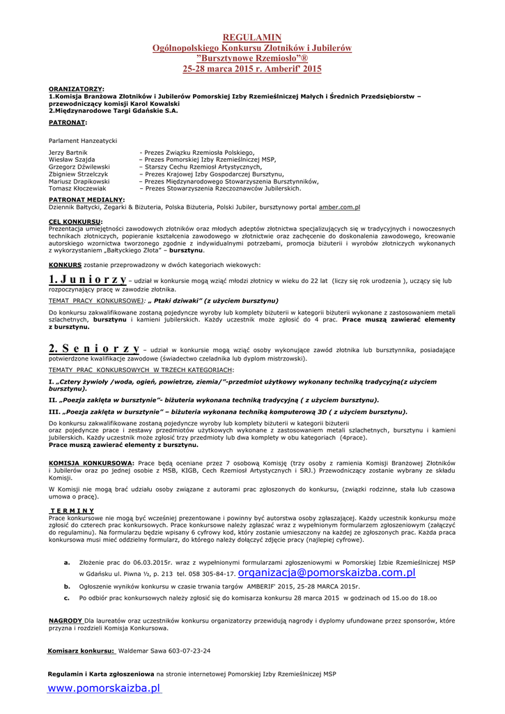 REGULAMIN Ogólnopolskiego Konkursu Złotników i Jubilerów ”Bursztynowe Rzemiosło”® 25-28 marca 2015 r. Amberif' 2015 ORANIZATORZY: 1.Komisja Branżowa Złotników i Jubilerów Pomorskiej Izby Rzemieślniczej Małych i Średnich Przedsiębiorstw – przewodniczący komisji Karol Kowalski 2.Międzynarodowe Targi Gdańskie S.A. PATRONAT: Parlament Hanzeatycki Jerzy Bartnik Wiesław Szajda Grzegorz Dźwilewski Zbigniew Strzelczyk Mariusz Drapikowski Tomasz Kłoczewiak - Prezes Związku Rzemiosła Polskiego, – Prezes Pomorskiej Izby Rzemieślniczej MSP, – Starszy Cechu Rzemiosł Artystycznych, – Prezes Krajowej Izby Gospodarczej Bursztynu, – Prezes Międzynarodowego Stowarzyszenia Bursztynników, – Prezes Stowarzyszenia Rzeczoznawców Jubilerskich. PATRONAT MEDIALNY: Dziennik Bałtycki, Zegarki & Biżuteria, Polska Biżuteria, Polski Jubiler, bursztynowy portal amber.com.pl CEL KONKURSU: Prezentacja umiejętności zawodowych złotników oraz młodych adeptów złotnictwa specjalizujących się w tradycyjnych i nowoczesnych technikach złotniczych, popieranie kształcenia zawodowego w złotnictwie oraz zachęcenie do doskonalenia zawodowego, kreowanie autorskiego wzornictwa tworzonego zgodnie z indywidualnymi potrzebami, promocja biżuterii i wyrobów złotniczych wykonanych z wykorzystaniem „Bałtyckiego Złota” – bursztynu. KONKURS zostanie przeprowadzony w dwóch kategoriach wiekowych: 1. J u n i o r z y – udział w konkursie mogą wziąć młodzi złotnicy w wieku do 22 lat (liczy się rok urodzenia ), uczący się lub rozpoczynający pracę w zawodzie złotnika. TEMAT PRACY KONKURSOWEJ: „ Ptaki dziwaki” (z użyciem bursztynu) Do konkursu zakwalifikowane zostaną pojedyncze wyroby lub komplety biżuterii w kategorii biżuterii wykonane z zastosowaniem metali szlachetnych, bursztynu i kamieni jubilerskich. Każdy uczestnik może zgłosić do 4 prac. Prace muszą zawierać elementy z bursztynu. 2. S e n i o r z y – udział w konkursie mogą wziąć osoby wykonujące zawód złotnika lub bursztynnika, posiadające potwierdzone kwalifikacje zawodowe (świadectwo czeladnika lub dyplom mistrzowski). TEMATY PRAC KONKURSOWYCH W TRZECH KATEGORIACH: I. „Cztery żywioły /woda, ogień, powietrze, ziemia/”-przedmiot użytkowy wykonany techniką tradycyjną(z użyciem bursztynu). II. „Poezja zaklęta w bursztynie”- biżuteria wykonana techniką tradycyjną ( z użyciem bursztynu). III. „Poezja zaklęta w bursztynie” – biżuteria wykonana techniką komputerową 3D ( z użyciem bursztynu). Do konkursu zakwalifikowane zostaną pojedyncze wyroby lub komplety biżuterii w kategorii biżuterii oraz pojedyncze prace i zestawy przedmiotów użytkowych wykonane z zastosowaniem metali szlachetnych, bursztynu i kamieni jubilerskich. Każdy uczestnik może zgłosić trzy przedmioty lub dwa komplety w obu kategoriach (4prace). Prace muszą zawierać elementy z bursztynu. KOMISJA KONKURSOWA: Prace będą oceniane przez 7 osobową Komisję (trzy osoby z ramienia Komisji Branżowej Złotników i Jubilerów oraz po jednej osobie z MSB, KIGB, Cech Rzemiosł Artystycznych i SRJ.) Przewodniczący zostanie wybrany ze składu Komisji. W Komisji nie mogą brać udziału osoby związane z autorami prac zgłoszonych do konkursu, (związki rodzinne, stała lub czasowa umowa o pracę). TERMINY Prace konkursowe nie mogą być wcześniej prezentowane i powinny być autorstwa osoby zgłaszającej. Każdy uczestnik konkursu może zgłosić do czterech prac konkursowych. Prace konkursowe należy zgłaszać wraz z wypełnionym formularzem zgłoszeniowym (załączyć do regulaminu). Na formularzu będzie wpisany 6 cyfrowy kod, który zostanie umieszczony na każdej ze zgłoszonych prac. Każda praca konkursowa musi mieć oddzielny formularz, do którego należy dołączyć zdjęcie pracy (najlepiej cyfrowe). a. Złożenie prac do 06.03.2015r. wraz z wypełnionymi formularzami zgłoszeniowymi w Pomorskiej Izbie Rzemieślniczej MSP w Gdańsku ul. Piwna ½, p. 213 tel. 058 305-84-17. [email protected] b. Ogłoszenie wyników konkursu w czasie trwania targów AMBERIF' 2015, 25-28 MARCA 2015r. c. Po odbiór prac konkursowych należy zgłosić się do komisarza konkursu 28 marca 2015 w godzinach od 15.oo do 18.oo NAGRODY Dla laureatów oraz uczestników konkursu organizatorzy przewidują nagrody i dyplomy ufundowane przez sponsorów, które przyzna i rozdzieli Komisja Konkursowa. Komisarz konkursu: Waldemar Sawa 603-07-23-24 Regulamin i Karta zgłoszeniowa na stronie internetowej Pomorskiej Izby Rzemieślniczej MSP www.pomorskaizba.pl