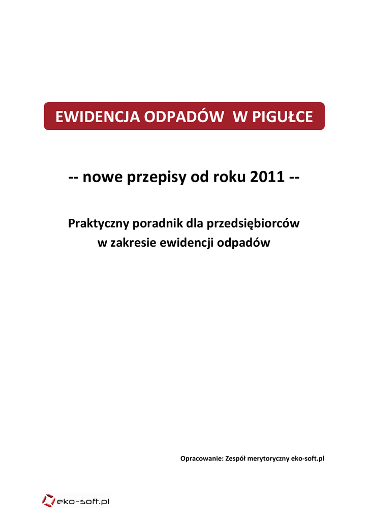 EWIDENCJA ODPADÓW W W PIGUŁCE PIGUŁCE -- nowe przepisy od roku 2011 -Praktyczny poradnik dla przedsiębiorców w zakresie ewidencji odpadów Opracowanie: Zespół merytoryczny eko-soft.pl CZYM JEST EWIDENCJA ODPADÓW ? Ewidencja odpadów to ustawowy obowiązek dokumentowania ilości oraz sposobów gospodarowania odpadami. Ewidencje można podzielić zasadniczo na: Bieżącą ewidencje odpadów dotyczącą: • Wytwarzania odpadów. • Przekazywania odpadów. • Transportu i zbierania odpadów. • Poddawania odpadów: odzyskowi lub unieszkodliwianiu. Coroczną sprawozdawczość sporządzaną na podstawie bieżącej ewidencji przekazywaną do Urzędu Marszałkowskiego. Art. 79c ust. 3 Ustawy o odpadach Jeżeli posiadacz odpadów lub transportujący odpady, będąc obowiązanym do prowadzenia ewidencji odpadów lub przekazywania wymaganych informacji lub sporządzania i przekazywania zbiorczego zestawienia danych lub sporządzania podstawowej charakterystyki odpadów lub przeprowadzania testów zgodności, nie wykonuje tego obowiązku albo wykonuje go nieterminowo lub niezgodnie ze stanem rzeczywistym podlega karze pieniężnej w wysokości 10 000 zł. Art. 36, ust. 4a Ustawy o odpadach zezwala na prowadzenie ewidencji odpadów w systemie informatycznym, w związku z tym zachęcamy do zapoznania się z możliwościami programów firmy Eko-soft.pl, które są prostym i przyjaznym systemem do prowadzenia ewidencji odpadów. 2 KTO PODLEGA OBOWIĄZKOWI EWIDENCJI ? Ustawa o odpadach nakłada obowiązek ewidencji na każdego kto wytwarza odpady lub gospodaruje nimi. W praktyce obowiązek ten dotyczy większości firm. Ustawa również reguluje przypadki w których obowiązek ewidencji jest zniesiony. Z prowadzenia ewidencji zwolnieni są: wytwórcy odpadów komunalnych: • prywatne osoby • przedsiębiorcy (tylko w zakresie odpadów o charakterze typowych odpadów z gospodarstw domowych z wyłączeniem odpadów niebezpiecznych np. stare monitory, puszki bo środkach niebezpiecznych, świetlówki rtęciowe), wytwórcy pojazdów wycofanych z eksploatacji, jeżeli pojazdy te zostały przekazane do przedsiębiorcy prowadzącego stację demontażu lub przedsiębiorcy prowadzącego punkt zbierania pojazdów, osoby fizyczne i jednostki organizacyjne nie będące przedsiębiorcami (np. urzędy, szkoły itp.), które wykorzystują odpady na własne potrzeby. Lista odpadów jakie kwalifikują się do tego zwolnienia ujęte są w rozporządzeniu Ministra Środowiska z dnia 21 kwietnia 2006 r. w sprawie listy rodzajów odpadów, które posiadacz odpadów może przekazywać osobom fizycznym lub jednostkom organizacyjnym niebędącym przedsiębiorcami, oraz dopuszczalnych metod ich odzysku (Dz.U. Nr 75, poz. 527), wytwórcy wybranych rodzajów odpadów ujętych w rozporządzeniu Ministra Środowiska z dnia 11 grudnia 2001 r. w sprawie rodzajów odpadów lub ich ilości, dla których nie ma obowiązku prowadzenia ewidencji odpadów, oraz kategorii małych i średnich przedsiębiorstw, które mogą prowadzić uproszczona ewidencję odpadów (Dz.U. Nr 152, poz. 1735) 3 Uproszczona ewidencja odpadów Uproszczona ewidencja odpadów polega na archiwizowaniu kart przekazania odpadu bez konieczności zakładania kart ewidencji odpadu. Uproszczoną ewidencję odpadów prowadzą: • mali i średni przedsiębiorcy wytwarzający odpady niebezpieczne w ilości do 100 kg rocznie, inne niż niebezpieczne, niebędące odpadami komunalnymi, w ilości do 5 ton rocznie. • prowadzący działalność tylko w zakresie transportu odpadów Średnie przedsiębiorstwo – średnie przedsiębiorstwo to przedsiębiorstwo, które: - zatrudnia mniej niż 250 pracowników oraz - jego roczny obrót nie przekracza 50 milionów euro lub całkowity bilans roczny nie przekracza 43 milionów euro; Małe przedsiębiorstwo – małe przedsiębiorstwo to przedsiębiorstwo, które: - zatrudnia mniej niż 50 pracowników oraz - jego roczny obrót nie przekracza 10 milionów euro lub całkowity bilans roczny nie przekracza 10 milionów euro; Ważne! Należy pamiętać, że uproszczona ewidencja odpadów nie zwalnia z obowiązku złożenia rocznego sprawozdania zbiorczego do Urzędu Marszałkowskiego. 4 DOKUMENTY DO EWIDENCJI ODPADÓW Wzory dokumentów stosowanych na potrzeby bieżącej ewidencji odpadów można znaleźć w rozporządzeniu Ministra Środowiska z dnia 8 grudnia 2010 r. w sprawie wzorów dokumentów stosowanych na potrzeby ewidencji odpadów (Dz.U. 2010 nr 249, poz. 1673) Powyższe wzory należy stosować od 01 stycznia 2011 roku Powyższe rozporządzenie uchyliło dotychczasowe rozporządzenie Ministra Środowiska z dnia 14 lutego 2006 r. w sprawie wzorów dokumentów stosowanych na potrzeby ewidencji odpadów (Dz.U. Nr 30 poz. 213) Rozporządzenie zawiera pięć formularzy: Karta ewidencji odpadów. Służy do prowadzenia bieżącej ewidencji odpadów w zakresie np. ilości wytwarzanych odpadów, poddawanych odzyskowi lub unieszkodliwianiu oraz przekazywanych lub przyjętych od innych podmiotów. Karta przekazania odpadu. Wykorzystywana przy przekazywaniu odpadów innym podmiotom. Zasadniczo dzieli się na 3 kolumny, każda wypełniana osobno przez przekazującego odpad, transportującego odpad oraz przyjmującego odpad. Karta ewidencji komunalnych osadów ściekowych. Służy do prowadzenia bieżącej ewidencji komunalnych osadów ściekowych. Stosowane tylko w oczyszczalniach ścieków. Karta ewidencji zużytego sprzętu elektrycznego i elektronicznego. Służy do prowadzenia bieżącej ewidencji odpadów zużytego sprzętu elektrycznego i elektronicznego. Stosują ją tylko zakłady przetwarzania zużytego sprzętu elektrycznego i elektronicznego. Karta ewidencji pojazdów wycofanych z eksploatacji. Przeznaczona jest do ewidencji pojazdów wycofanych z eksploatacji. Dotyczy tylko stacji demontażu oraz prowadzących punkty zbierania pojazdów. 5 ZESTAWIENIA ZBIORCZE Zestawienie zbiorcze za poprzedni rok kalendarzowy wypeł