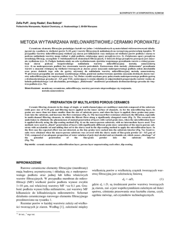 KOMPOZYTY (COMPOSITES) 3(2003)8 Zofia Puff1, Jerzy Raabe2, Ewa Bobryk3 Politechnika Warszawska, Wydział Chemiczny, ul. Noakowskiego 3, 00-664 Warszawa METODA WYTWARZANIA WIELOWARSTWOWEJ CERAMIKI POROWATEJ Ceramiczne elementy filtracyjne posiadające kształt rur jedno- i wielokanałowych są materiałami wielowarstwowymi składającymi się z podłoża (o wielkości porów 5÷10 μm) i warstw filtracyjnych nakładanych na wewnętrzną powierzchnię kanałów. W przypadku warstwy mikrofiltracyjnej wielkość jej ziaren jest kilkanaście razy mniejsza od wielkości porów podłoża i ziarna te podczas nakładania warstwy mogą wnikać w głąb podłoża, zwiększając opory przepływu (rys. 2). Zwiększone opory przepływu utrudniają filtrację, szczególnie w wielokanałowych elementach filtracyjnych, w których droga przepływu przesączu jest znacznie wydłużona (rys. 3). Podjęte badania miały na celu wyeliminowanie zjawiska wzajemnego przenikania warstw o różnej granulacji ziaren podczas bezpośredniego nakładania warstwy mikrofiltracyjnej metodą zanurzeniową (rys. 4) na makroporowate podłoże bez stosowania warstw pośrednich. Zastosowano dwie metody „blokowania” przenikania warstw o znacznie różniącej się wielkości tworzących je ziaren: przez nasycanie makroporowatego podłoża zolem akrylamidu oraz przez dodatek tego zolu do gęstwy używanej do nakładania warstwy mikrofiltracyjnej metodą zanurzeniową. W pierwszym przypadku nie uzyskano oczekiwanego efektu, ponieważ zaobserwowano zjawisko zasysania drobnych ziaren warstwy mikrofiltracyjnej do wnętrza podłoża (rys. 7a). Dobre wyniki uzyskano przy pokrywaniu makroporowatego podłoża gęstwą z drobnoziarnistego proszku (d ~ 0,5 μm) YSZ, zawierającej w swoim składzie (w odpowiednich proporcjach) roztwór wodny alkoholu poliwinylowego i zol akrylamidu, powodujący „blokowanie” możliwości przenikania drobnoziarnistego proszku do wnętrza podłoża (rys. 7b). Słowa kluczowe: membrany ceramiczne, mikrofiltracja, warstwy porowate nieprzenikające się wzajemnie, metoda zanurzeniowa PREPARATION OF MULTILAYERS POROUS CERAMICS Ceramic filtering elements in the shape of single- or multi-channel pipes are multilayer materials composed of the substrate (with pore size of 5÷10 μm) and filtering layers applied on the inner surface of channels. As for the microfiltering layer, its grains are more than ten times smaller than the size of substrate pores, and when the layer is applied, these grains may penetrate into the substrate, and increase the flow resistance (Fig. 2). The increased flow resistance obstructs the filtration, especially in multi-channel filtering elements, in which the filtrate flows along a significantly elongated route (Fig. 3). The research was undertaken to eliminate the phenomenon of mutual penetration of layers with varied grain sizes, when the microfiltration layer is applied directly using the dip-coating method (Fig. 4) on the macro-porous substrate, with no intermediate layers used. Two methods were used to „block” penetration of layers with significantly different grain sizes: saturation of the macro-porous substrate with acrylamide sol and adding that sol to the slurry used in the dip-coating method to apply the microfiltration layer. In the first case the expected effect was not detected, as the tiny grains were sucked into the substrate interior (Fig. 7a). Good results were obtained when the macro-porous substrate was covered with the slurry made of fine-grain powder (d ~ 0.5 μm) of YSZ, composed of an adequate proportion of water solution of polyvinyl alcohol and acrylamide sol, which causes „blockage” of the potential penetration of the fine-grain powder into the substrate interior (Fig. 7b). Key words: ceramic membranes, mikrofiltration layer, porous layer unpenetrating each other, dip-coating WPROWADZENIE Rurowe ceramiczne elementy filtracyjne (membrany) mają budowę asymetryczną i składają się z makroporowatego podłoża oraz jednej lub kilku właściwych warstw filtracyjnych. W przypadku membran do mikrofiltracji (MF) wielkość porów podłoża wynosi zwykle 1÷10 μm, zaś właściwej warstwy MF >ca 0,1 μm. Grubość podłoża wynosi kilka milimetrów, zaś warstwy MF kilkanaście do kilkudziesięciu mikrometrów. Schemat działania ceramicznego rurowego elementu filtracyjnego przedstawiono na rysunku 1. Rozmiar porów w każdej warstwie zależy od wielkości tworzących je ziaren. Według [1], zależność między 1,2 dr inż., 3 mgr inż. wielkością porów a wielkością cząstek tworzących warstwę filtracyjną jest zależnością liniową dp = αDz (1) gdzie dp i Dz są średnicami porów warstwy tworzących ją ziaren, zaś α jest współczynnikiem zależnym od ilości spoiwa, ciśnienia prasowania oraz kształtu ziarna, czyli, ogólnie mówiąc, od czynników technologicznych. Metoda wytwarzania wielowarstwowej ceramiki porowatej 1 2 3 4 5 W δ Roztwór rozdzielany Przesącz do U, P1, CR P2, CP d1 W Retentat (roztwór zatężony) Przesącz Rys. 1. Schemat działania ceramicznego rurowego elementu filtracyjnego: 1 - ceramiczne podłoże porowate, 2 - właściwa warstwa filtracyjna, 3 - kanał ciśnieniowy (roztwór rozdzielany), 4 - kanał odpływowy (przesącz), 5 - nieprzepuszczalny korpus modułu membranowego (moduł może zawierać kilka elementów filtracyjnych), W - strumień przenikający przez membranę, do - wewnętrzna średnica elementu filtracyjnego, d1 - średnica zewnętrzna porowatego podłoża, δ - grubość właściwej warstwy filtracyjnej, U - szybkość przepływu, P1, P2 - ciśnienie (P1 > P2), CR, CP - stężenia składnika rozdzielanego w roztworze zatężonym i przesączu. Selektywność membrany R = 1 − CP/CR Fig. 1. Diagram of functioning ceramic filtering element: 1 - porous ceramic support, 2 - filtrating layer, 3 - pressure channel (seperating solution), 4 - outlet channel (permeat), 5 - impermeable body of membrane 