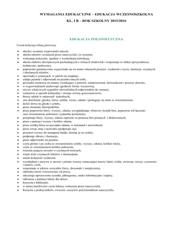 WYMAGANIA EDUKACYJNE – EDUKACJA WCZESNOSZKOLNA KL. I B – ROK SZKOLNY 2015/2016 EDUKACJA POLONISTYCZNA Uczeń kończący klasę pierwszą: słucha i rozumie wypowiedzi innych, słucha tekstów czytanych przez nauczyciela i je rozumie, wykonuje polecenia, zgodnie z wysłuchaną instrukcją, słucha efektów dźwiękowych pochodzących z różnych środowisk i rozpoznaje te efekty (przyrodnicze, techniczne, społeczne), poprawnie gramatycznie wypowiada się na temat własnych przeżyć, wydarzeń z życia, ilustracji, czytanych i słuchanych tekstów, opowiada o sytuacjach, w jakich się znajduje, zadaje pytania i odpowiada na pytania innych osób, prowadzi rozmowę na tematy wynikające z potrzeb, zainteresowań, doświadczeń i przeżyć dziecka, w wypowiedziach zachowuje zgodność formy wyrazowej, używa właściwych sygnałów niewerbalnych odpowiednio do sytuacji, rozmawia w sposób kulturalny i stosuje zwroty grzecznościowe, bierze udział w zabawach teatralnych, zna określenia: głoska, litera, sylaba, wyraz, zdanie i posługuje się nimi ze zrozumieniem, dzieli słowa na głoski i sylaby, pisze elementy literopodobne, pisze poprawnie litery, wyrazy, zdania, uwzględniając właściwy kształt liter, poprawne ich łączenie oraz równomierne położenie i jednolite pochylenie, przepisuje litery, wyrazy, zdania zapisane za pomocą liter pisanych i drukowanych, pisze z pamięci wyrazy i krótkie zdania, pisze wielką literę na początku zdania, w imionach i nazwiskach, pisze swoje imię i nazwisko (podpisuje się), przenosi wyrazy do następnej linijki, dzieląc je na sylaby, podpisuje obrazy i ilustracje, pisze odpowiedzi na pytania, czyta głośno i po cichu ze zrozumieniem sylaby, wyrazy, zdania, krótkie teksty, czyta ze zrozumieniem krótkie polecenia, rozumie pojęcia zawarte w czytanych treściach, wiąże treść czytanych tekstów z ilustracjami, ustala kolejność wydarzeń, wyodrębnia i nazywa w mowie i piśmie wyrazy oznaczające nazwy ludzi, roślin, zwierząt, rzeczy, czynności i stanów, cech, rozpoznaje w tekście wszystkie litery, dwuznaki i zmiękczenia, odróżnia utwór wierszowany od prozy, odczytuje uproszczone rysunki, piktogramy, znaki informacyjne i napisy, odtwarza z pamięci teksty dla dzieci, korzysta z biblioteki, w miarę możliwości czyta lektury wskazane przez nauczyciela, korzysta z podręczników, ćwiczeń, zeszytów pod kierunkiem nauczyciela. EDUKACJA MATEMATYCZNA Uczeń: rozumie i określa kierunki w przestrzeni, potrafi ustawić przedmiot zgodnie z podanymi warunkami, rozróżnia lewą i prawą stronę swojego ciała, wyprowadza kierunki od siebie i innych osób, określa prawą i lewą stronę drugiej osoby, stojącej tyłem i przodem, dostrzega symetrię i rysuje drugą połowę figury, umie dokończyć wzór szlaczka, układa elementy rosnąco i malejąco, numeruje je, tworzy i klasyfikuje zbiory, rozpoznaje i nazywa figury geometryczne: koło, trójkąt, kwadrat, prostokąt, przelicza zbiory w zakresie 20, korzystając z konkretów lub rysunków, liczy kolejno i wstecz w zakresie 20, posługuje się liczebnikami porządkowymi w zakresie 20, zapisuje liczby cyframi w zakresie 10, czyta liczby zapisane słownie oraz cyframi w zakresie 10, pisze liczby widoczne na zegarze, termometrze, linijce centymetrowej (w zakresie 10), porządkuje i porównuje liczby w zakresie 20, porównuje liczby korzystając z konkretów lub rysunków, pisze znaki matematyczne: +, –, <, >, =. rozumie pojęcia: liczba, cyfra, dodać, odjąć, plus, minus, równa się, tyle samo, większy, mniejszy, dodaje i odejmuje liczby w zakresie 10 (także w pamięci), korzysta z przemienności dodawania, sprawdza dodawanie za pomocą odejmowania i odwrotnie, dodaje jednakowe składniki w zakresie 10, rozwiązuje łatwe równania jednodziałaniowe z niewiadomą w postaci okienka, czyta ze zrozumieniem proste, krótkie zadania tekstowe, rozwiązuje zadania jednodziałaniowe z treścią i stosuje zapis cyfrowy oraz znaki działań, zna monety i banknoty będące w obiegu, posługuje się pieniędzmi (do 10 zł), mierzy długość różnym miarkami, zna pojęcie – centymetr, mierzy masy, zna pojęcie – kilogram, mierzy ilość płynów (dowolną miarka), zna pojęcie – litr, odczytuje wskazania termometru, posługuje się kalendarzem, nazywa dni tygodnia i miesiące w roku, odczytuje pełne godziny na zegarze, czyta ze zrozumieniem skróty, symbole, tabelki, schematyczne rysunki, piktogramy, wykresy wynikające z realizowanych treści. EDUKACJA SPOŁECZNA Uczeń: ocenia postępowanie swoje i innych jako członków różnych społeczności (domowej, szkolnej) oraz uczestników ruchu drogowego, pasażerów, widzów, potrafi odróżnić, co jest dobre, a co złe, wie, że należy mówić prawdę, dokonuje wyborów, zdając sobie sprawę z ich konsekwencji, stara się panować nad emocjami, przeżywa satysfakcję z własnego działania i osiąganych wyników, wykazuje poczucie przynależności do rodziny, społeczności szkolnej, wykazuje szacunek i zrozumienie dla innych osób i świata przyrody, szanuje pracę własną i innych, akceptuje różnice między ludźmi, przejawia szacunek dla odmienności, dostosowuje swoje zachowanie do obowiązujących umów i zasad, potrafi podać status administracyjny swojej miejscowości (wieś, miasto), zna nazwę miejscowości, w której mieszka, swojej narodowości, stolicy, zna symbole narodowe oraz rozpoznaje flagę i hymn Unii Europejskiej, wie, że Polska znajduje się w Europie, przestrzega przepisów i zasad bezpieczeństwa w szkole, w domu, na ulicy, zna numery telefonów alarmowych, odróżnia i właściwie reaguje na sygnały alarmowe, ostrzegawcze w szkole i najbliższym otoczeniu, wie, jak właściwie się zachowywać w sytuacji zagrożenia. EDUKACJA PRZYRODNICZA Uczeń: rozpoznaje powszechnie znane zwierzęta i rośliny w różnych środowiskach przyrodniczych, jak park, las, pole, sad, ogród i łąka, zna zwyczaje zwie