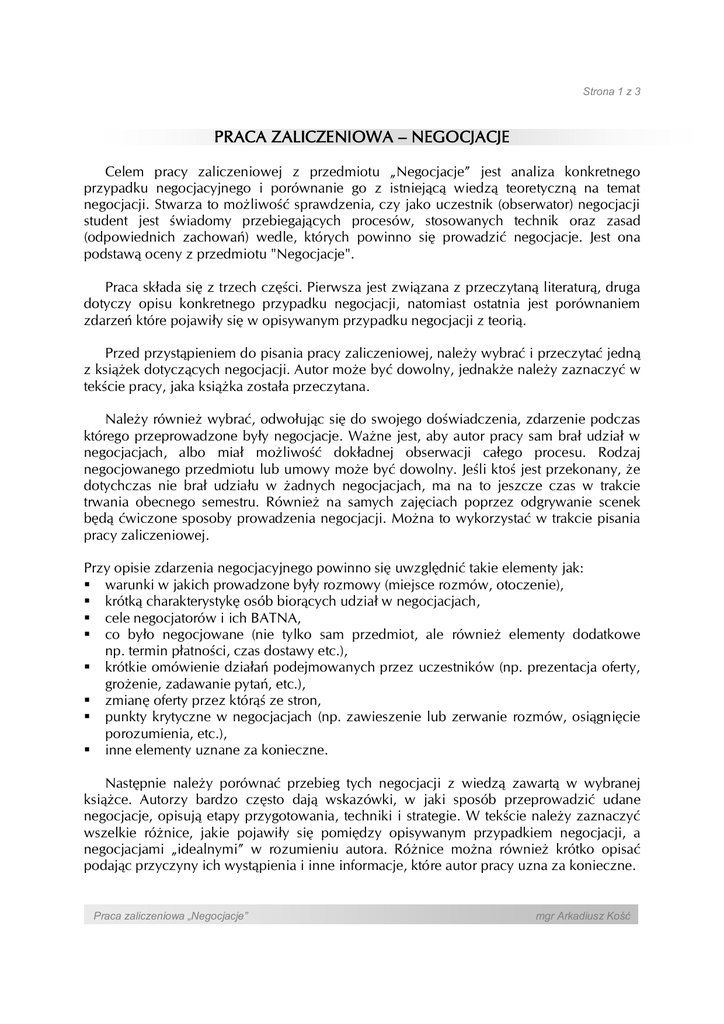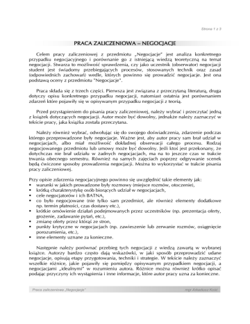 Strona 1 z 3 PRACA ZALICZENIOWA – NEGOCJACJE Celem pracy zaliczeniowej z przedmiotu „Negocjacje” jest analiza konkretnego przypadku negocjacyjnego i porównanie go z istniejącą wiedzą teoretyczną na temat negocjacji. Stwarza to możliwość sprawdzenia, czy jako uczestnik (obserwator) negocjacji student jest świadomy przebiegających procesów, stosowanych technik oraz zasad (odpowiednich zachowań) wedle, których powinno się prowadzić negocjacje. Jest ona podstawą oceny z przedmiotu "Negocjacje". Praca składa się z trzech części. Pierwsza jest związana z przeczytaną literaturą, druga dotyczy opisu konkretnego przypadku negocjacji, natomiast ostatnia jest porównaniem zdarzeń które pojawiły się w opisywanym przypadku negocjacji z teorią. Przed przystąpieniem do pisania pracy zaliczeniowej, należy wybrać i przeczytać jedną z książek dotyczących negocjacji. Autor może być dowolny, jednakże należy zaznaczyć w tekście pracy, jaka książka została przeczytana. Należy również wybrać, odwołując się do swojego doświadczenia, zdarzenie podczas którego przeprowadzone były negocjacje. Ważne jest, aby autor pracy sam brał udział w negocjacjach, albo miał możliwość dokładnej obserwacji całego procesu. Rodzaj negocjowanego przedmiotu lub umowy może być dowolny. Jeśli ktoś jest przekonany, że dotychczas nie brał udziału w żadnych negocjacjach, ma na to jeszcze czas w trakcie trwania obecnego semestru. Również na samych zajęciach poprzez odgrywanie scenek będą ćwiczone sposoby prowadzenia negocjacji. Można to wykorzystać w trakcie pisania pracy zaliczeniowej. Przy opisie zdarzenia negocjacyjnego powinno się uwzględnić takie elementy jak: warunki w jakich prowadzone były rozmowy (miejsce rozmów, otoczenie), krótką charakterystykę osób biorących udział w negocjacjach, cele negocjatorów i ich BATNA, co było negocjowane (nie tylko sam przedmiot, ale również elementy dodatkowe np. termin płatności, czas dostawy etc.), krótkie omówienie działań podejmowanych przez uczestników (np. prezentacja oferty, grożenie, zadawanie pytań, etc.), zmianę oferty przez którąś ze stron, punkty krytyczne w negocjacjach (np. zawieszenie lub zerwanie rozmów, osiągnięcie porozumienia, etc.), inne elementy uznane za konieczne. Następnie należy porównać przebieg tych negocjacji z wiedzą zawartą w wybranej książce. Autorzy bardzo często dają wskazówki, w jaki sposób przeprowadzić udane negocjacje, opisują etapy przygotowania, techniki i strategie. W tekście należy zaznaczyć wszelkie różnice, jakie pojawiły się pomiędzy opisywanym przypadkiem negocjacji, a negocjacjami „idealnymi” w rozumieniu autora. Różnice można również krótko opisać podając przyczyny ich wystąpienia i inne informacje, które autor pracy uzna za konieczne. Praca zaliczeniowa „Negocjacje” mgr Arkadiusz Kość Strona 2 z 3 Ocena pracy Na ocenę pracy składają się następujące elementy: Punkty 1. Umieszczenie przypisu do przeczytanej książki, wraz z jej krótką charakterystyką 2. Opis przypadku zawierającego takie elementy jak: a. opis miejsca negocjacji b. charakterystykę negocjatorów c. cele negocjatorów (obu stron - o ile jest to możliwe) oraz BATNA d. opis przedmiotu negocjacji wraz z elementami negocjowanymi (cena, czas dostawy, sposób zapłaty, sposób wykonania usługi, etc.) e. opis przebiegu negocjacji (w formie dialogu lub omówienia kolejnych etapów) 3. Porównanie przypadku z teorią z książki: a. porównanie poszczególnych etapów negocjacji (zgodnie z podziałem etapów w przeczytanej literaturze) b. scharakteryzowanie strategii, jakimi posługiwali się uczestnicy (strategia siły, negocjacje oparte na zasadach, etc.) c. omówienie zastosowanych taktyk i technik negocjacyjnych d. ocena czy skutki działań w procesie negocjacji były zgodne z uwagami autora książki Suma: 10 4 4 4 4 4 5 5 5 5 50 Proponowana literatura Dawson R. (1999), Sekrety udanych negocjacji, Poznań: Wydaw. Zysk i S-ka Donaldson M., Donaldson M. (1999), Negocjacje, Warszawa: Wydaw. RM Fisher R. (2000), Dochodząc do tak: negocjonowanie bez poddawania się Warszawa: Polskie Wydawnictwo Ekonomiczne Fowler A. (2001) Jak skutecznie negocjować, Warszawa: Wydaw. Petit Hindle T. (2000), Skuteczne negocjacje, Warszawa: Wiedza i Życie Nęcki Z. (2000) Negocjacje w biznesie, Kraków-Kluczbork: Oficyna Wydaw. Antykwa Rządca R. (2003), Negocjacje w interesach: jak negocjują organizacje, Warszawa: Polskie Wydawnictwo Ekonomiczne Steele P., Murphy J., Russill R. (2005) Jak odnieść sukces w negocjacjach, Kraków: Oficyna Ekonomiczna Uniszewski Z. (2000) Konflikty i negocjacje, Warszawa: Prószyński i S-ka Winch A., Winch S. (2005) Negocjacje: jednostka, organizacja, kultura, Warszawa: Difin Istnieje oczywiście możliwość wykorzystania innej literatury. Praca zaliczeniowa „Negocjacje” mgr Arkadiusz Kość Strona 3 z 3 Uwagi końcowe Literatura dotycząca negocjacji pełna jest różnego rodzaju przykładów, które dają potencjalną możliwość wykorzystania ich w punkcie drugim omawianej powyżej pracy. Oczywiście nie jest to dopuszczalne, a prace z takimi przykładami będą oceniane na 0 punktów. W szczególności nie można wykorzystywać przykładów: 1. Negocjacji działki, w której przedstawiciel jednej ze stron jest zmuszony dokonać sprzedaży w wyniku choroby córki. 2. Sprzedaży samochodu, w którym sprzedający umawia trzech kupujących na bliskie sobie terminy licząc na iluzoryczne zwiększenie niedostępności przedmiotu. 3. Negocjacji odszkodowania ubezpieczenia samochodu, gdzie poszkodowany odwołuje się do zewnętrznych zasad oceny samochodu i wykorzystuje to w celu zwiększenia sumy odszkodowania. Praca powinna być oddana na papierze A4, marginesy 2,5cm, czcionka 12pkt., interlinia 1,5 wiersza. Całość pracy nie powinna przekroczyć 6 stron A4. Praca zaliczeniowa „Negocjacje” mgr Arkadi