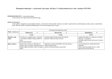 Wymagania edukacyjne z wychowania fizycznego dla klasy V A szkoły podstawowej w roku szkolnym 2015/2016 POZIOM KONIECZNY – ocena dopuszczająca Uczeń wykona 75% zadań z poziomu podstawowego OCENA CELUJĄCA Uczeń spełnia wymagania na poszczególne poziomy , jest kreatywny bierze udział w aktywny zawodach sportowych na szczeblu gminy, powiatu, rejonu, województwa, bierze aktywny udział w zajęciach pozalekcyjnych. Jest zawsze przygotowany do zajęć. WYMAGANIA EDUKACYJNE Działy tematyczne Podstawowy- 3 Uczeń Rozszerzony- 4 Uczeń Muzyka, rytm, taniec - jest aktywny i zaangażowany w zajęciach - z szacunkiem traktuje swojego partnera w tańcu - bawi się przy muzyce - wykonuje improwizację ruchową do muzyki - przejawia własną inwencje twórczą Sporty zimowe - dobiera strój i obuwie w zależności od - organizuje w gronie rówieśników dowolną zabawę z miejsca zajęć i warunków atmosferycznych wykorzystaniem sanek - hartuje organizm podczas zabaw na śniegu i - omawia zasady aktywnego wypoczynku lodzie Dopełniający - 5 Uczeń - wyjaśnia jak należy się zachować na zabawie tanecznej , w dyskotece - wykonuje improwizacje ruchową do wybranej muzyki - omawia podstawowe zasady hartowania organizmu - omawia sposoby postępowania w czasie zagrożenia życia lub zdrowia Trening zdrowia - wykazuje zaangażowanie w zajęcia - wykazuje troskę o własną postawę ciała - bezpiecznie korzysta ze sprzętu i urządzeń sportowych - stosuje zasady asekuracji - dobiera strój i obuwie do ćwiczeń - zna poprawne nazewnictwo pozycji wyjściowych do ćwiczeń kształtujących - utrzymuje równowagę, przechodząc po odwróconej ławeczce - jest bardzo aktywny i zaangażowany na zajęciach - pomaga kolegom prawidłowo wykonać ćwiczenie -starannie i dokładnie wykonuje zlecone ćwiczenia - asekuruje kolegę podczas ćwiczeń - wykonuje leżenie przewrotne i przerzutne - wyskoczy obunóż na skrzynie do przysiadu podpartego - zna podstawową terminologie gimnastyczną - wykonuje w domu ćwiczenia zlecone przez nauczyciele - wymienia podstawowe wady postawy ciała - wykona przewrót w przód i w tył z przysiadu podpartego do przysiadu podpartego - wyskoczy obunóż na skrzynie do przysiadu podpartego -zna ćwiczenia wzmacniające mm wysklepiające stopę - wyjaśnia czym różni się leżenie przewrotne od przerzutnego Ocena poziomu sprawności będzie stosowana według tabel. lekkoatletyka Celująca Chł. B. dobra Chł. Dz. Dobra Chł. Dz. Dopuszczająca Dostateczna Chł. Dz. Chł. Dz. Niedostateczna Dz. Bieg na 60m(sek) 9,90 10,17 10,20 10,40 10,80 11,10 11,25 11,75 11,80 12,10 < 600 m\ (min ) 2,22 2,26 2,25 2,32 2,37 2,52 2,52 3,08 2,55 3,15 > 1000 m ( min ) 3,37 3,56 4,09 4,29 4,34 5,10 4,52 5,27 5,17 5,50 > Test Coopera ( m) 2700 2400 2400 2100 2200 1800 1700 1400 1300 1000 > Skok w dal z miejsca ( m) 1,92 1,88 1,80 1,78 1,74 1,65 1,58 1,55 1,42 1,34 < Skok w dal ( m.) 3,80 3,40 3,60 3,15 3,30 3,00 3,10 2,85 2,95 2,60 < Rzut p. palantową (m) 40 30 33 25 30 23 26 20 25 18 < 7,70 6,80 6,20 5,50 5,50 5,00 5,00 4,60 4,70 4,30 < Rzut piłką lekarską(m) Sporty całego życia i wypoczynek Piłka siatkowa - jest aktywny na zajęciach - zachowuje zasady bezpieczeństwa podczas gry - przyjmuje postawę siatkarską oraz poprawnie porusza się po boisku - podporządkowuje się decyzjom sędziego - potrafi rzucać piłkę układając prawidłowo dłonie do odbicia górnego i dolnego - wykona zagrywkę sposobem dolnym z linii 3m - prawidłowo wykona 4 z 7 zagrywek sposobem dolnym - stara się podnieść swoje umiejętności - wykona odbicia sposobem górnym i dolnym - zna technikę zagrywki tenisowej - uprawia siatkówkę w czasie wolnym - stosuje w grze odbicia piłki sposobem oburącz dolnym - omawia podstawową technikę poszczególnych elementów gry - potrafi wykonać zagrywkę tenisową Piłka ręczna - jest odpowiedzialny w czasie gry - współpracuje w zespole - zachowuje bezpieczeństwo w czasie gry - podporządkowuje się decyzjom sędziego - kozłuje piłkę ze zmiana tempa kierunku i ręki kozłującej - wykonuje celny rzut na bramkę dowolnym sposobem - wymienia podstawowe przepisy gry w piłkę ręczną - dokonuje próby rzutu piłką na bramkę z wyskoku - wykonuje podania i chwyty piłki w parach - potrafi ustawić się prawidłowo w czasie ataku pozycyjnego - wykonuje zwody z piłką - wyjaśnia dlaczego należy przestrzegać ustalonych reguł w trakcie rywalizacji - stosuje w grze prowadzenie piłki w biegu; podania piłki jednorącz, rzuty piłki do bramki - zna różnicę między obroną każdy swego a obroną strefą Piłka nożna - jest aktywny i zaangażowany na zajęciach - zachowuje bezpieczeństwo podczas gry - przyjmuje i uderza piłkę nogą w miejscu - prowadzi piłkę wewnętrzną i zewnętrzną częścią stopy - przyjmuje i podaje piłkę zewnętrzną i wewnętrzną częścią stopy - przyjmuje i uderza piłkę głową - wymienia podstawowe przepisy gry - celnie uderza piłkę na bramkę dwoma sposobami - prowadzi piłkę prawą i lewą noga slalomem - samodzielnie doskonali swoje umiejętności w czasie wolnym - wykonuje zwody z piłką - przyjmuje i podaje piłkę w truchcie w parach - zna podstawową terminologie piłkarską - stosuje w grze prowadzenie piłki noga w biegu i strzały do bramki Piłka koszykowa - przestrzega zasad bezpieczeństwa podczas - podaje piłkę oburącz sprzed klatki piersiowej półgórnie i meczu kozłem w ruchu - angażuje się w dokładne wykonanie zadania - stosuje obronę każdy swego - prawidłowo porusza się po boisku bez piłki - wymienia podstawowe przepisy gry i z piłką - kozłuje piłkę prawą i lewą ręką slalomem - podaje piłkę oburącz sprzed klatki - wykonuje poprawnie technicznie rzut do kosza i trafia 2 z 5 piersiowej półgórnie i kozłem w miejscu rzutów - kozłuje piłkę prawą i lewą ręką ze zmianą - organizuje dowolną zabawę wykorzystując piłki koszykowe - stosuje w grze kozłowanie p