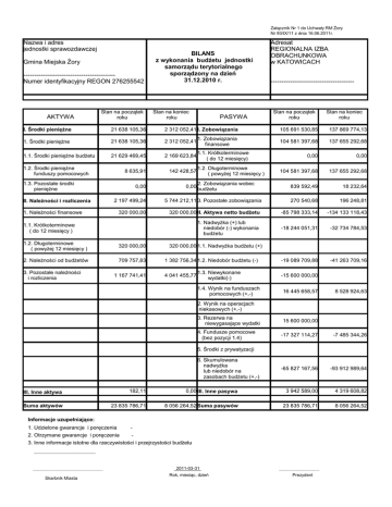 Załącznik Nr 1 do Uchwały RM Żory Nr 93/IX/11 z dnia 16.06.2011r. Nazwa i adres jednostki sprawozdawczej ------------------------ ---------Gmina Miejska Żory -- ---- ------------------------------------------Numer identyfikacyjny REGON 276255542 AKTYWA Stan na początek roku BILANS z wykonania budżetu jednostki samorządu terytorialnego sporządzony na dzień 31.12.2010 r. Stan na koniec roku PASYWA Adresat REGIONALNA IZBA OBRACHUNKOWA w KATOWICACH --------------------------------------- Stan na początek roku Stan na koniec roku I. Środki pieniężne 21 638 105,36 2 312 052,41 I. Zobowiązania 105 691 530,85 137 869 774,13 1. Środki pieniężne 21 638 105,36 2 312 052,41 1. Zobowiązania finansowe 104 581 397,68 137 655 292,68 1.1. Środki pieniężne budżetu 21 629 469,45 2 169 623,84 1.1. Krótkoterminowe ( do 12 miesięcy) 0,00 0,00 8 635,91 142 428,57 104 581 397,68 137 655 292,68 0,00 0,00 839 592,49 18 232,64 1.2. Środki pieniężne funduszy pomocowych 1.3. Pozostałe środki pieniężne II. Należności i rozliczenia 1. Należności finansowe 2. Zobowiązania wobec budżetu 2 197 499,24 5 744 212,11 3. Pozostałe zobowiązania 270 540,68 196 248,81 320 000,00 320 000,00 II. Aktywa netto budżetu -85 798 333,14 -134 133 118,43 1. Nadwyżka (+) lub niedobór (-) wykonania budżetu -18 244 051,31 -32 734 784,53 -19 089 709,88 -41 263 709,16 1.1. Krótkoterminowe ( do 12 miesięcy ) 1.2. Długoterminowe ( powyżej 12 miesięcy ) 320 000,00 2. Należności od budżetów 709 757,83 3. Pozostałe należności i rozliczenia 1.2. Długoterminowe ( powyżej 12 miesięcy ) 1 167 741,41 320 000,00 1.1. Nadwyżka budżetu (+) 1 382 756,34 1.2. Niedobór budżetu (-) 4 041 455,77 1.3. Niewykonane wydatki(-) 1.4. Wynik na funduszach pomocowych (+,-) -15 600 000,00 16 445 658,57 8 528 924,63 2. Wynik na operacjach niekasowych (+,-) 3. Rezerwa na niewygasające wydatki 4. Fundusze pomocowe (bez pozycji 1.4) 15 600 000,00 -17 327 114,27 -7 485 344,26 -65 827 167,56 -93 912 989,64 5. Środki z prywatyzacji 6. Skumulowana nadwyżka lub niedobór na zasobach budżetu (+,-) III. Inne aktywa 182,11 0,00 III. Inne pasywa 3 942 589,00 4 319 608,82 Suma aktywów 23 835 786,71 8 056 264,52 Suma pasywów 23 835 786,71 8 056 264,52 Informacje uzupełniające: 1. Udzielone gwarancje i poręczenia 2. Otrzymane gwarancje i poręczenia 3. Inne informacje istotne dla rzeczywistości i przejrzystości budżetu ----------------------------------------------------------- --------------------------------------------------------------------------------- Skarbnik Miasta 2011-03-31 Rok, miesiąc, dzień ----------------------------------------------- Prezydent ---------------------