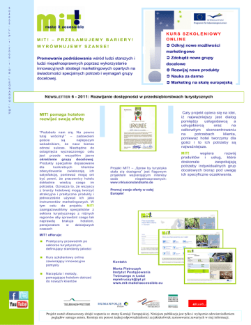 5 0 4 6 5 5 L L P 1 2 0 0 9 1 D E L E O N A R D O L M P MIT! – PRZEŁAMUJEMY BARIERY! KURS S ZKOL E NIO WY ONLINE WYRÓWNUJEMY SZANSE! Odkryj nowe możliwości marketingowe Promowanie podróżowania wśród ludzi starszych i ludzi niepełnosprawnych poprzez wykorzystanie innowacyjnych strategii marketingowych opartych na świadomości specjalnych potrzeb i wymagań grupy docelowej. Zdobądź nowe grupy docelowe Rozwijaj nowe produkty Nauka za darmo Marketing na skalę europejską N EWSLETTER 6 - 2011: Rozwijanie dostępności w przedsiębiorstwach turystycznych Cały projekt opiera się na idei, iż najważniejszy jest dialog pomiędzy usługodawcą a usługobiorcą oraz na całkowitym skoncentrowaniu na potrzebach klienta, ponieważ hotel tworzymy dla gości i to ich potrzeby są najważniejsze. MIT! pomaga hotelom rozwijać swoją ofertę “Podobało nam się. Na pewno tutaj wrócimy!” – zadowoleni goście są najlepszym wskaźnikiem, że nasz biznes odnosi sukces. Niezbędne do osiagnięcia wyznaczonego celu jest przede wszystkim jasne określenie grupy docelowej. Produkty specjalnie dopasowane dla konkretnych klientów zdecydowanie zwiekszają ich satysfakcję, ponieważ mogą oni być pewni, że pracownicy hotelu dokładnie wiedzą czego im potrzeba. Oznacza to, że wszyscy z branży hotelowej mogą tworzyć atrakcyjne i praktyczne produkty i jednocześnie używać ich jako instrumentów marketingowych. W tym celu do projektu MIT! zaangażowaliśmy specjalistów z sektora turystycznego z różnych regionów aby sprawdzić czego tak naprawdę brakuje hotelom, pensjonatom w dzisiejszych czasach Projekt MIT! – „Spraw by turystyka stała się dostępna” jest flagowym projektem wspierającym interesy osób niepełnosprawnych: www.inklusionslandkarte.de MIT! wspiera rozwój produktów i usług, które doskonale zaspokajają potrzeby indywidualnych grup docelowych biorąc pod uwagę ich specyficzne oczekiwania. Promuj swoje oferty w całej Europie! MIT! offeruje: Praktyczny przewodnik po sektorze turystycznym, definiujący standardy jakości Kurs szkoleniowy online zawierający innowacyjne pomysły Narzędzia i metody, pomagające hotelom dotrzeć do nowych klientów Kontakt: Marta Pietruczyk Instytut Postępowania Twórczego w Łodzi [email protected] www.mit-makeitaccessible.eu Projekt został sfinansowany dzięki wsparciu ze strony Komisji Europejskiej. Niniejsza publikacja jest tylko i wyłącznie odzwierciedleniem poglądów samego autora. Komisja nie ponosi żadnej odpowiedzialności za jakiekolwiek zastosowanie zawartych w niej informacji.