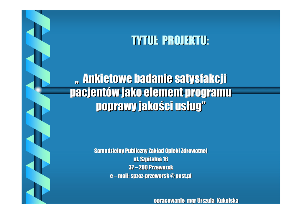 TYTUŁ PROJEKTU: ,, Ankietowe badanie satysfakcji pacjentów jako element programu poprawy jakości usług” Samodzielny Publiczny Zakład Opieki Zdrowotnej ul. Szpitalna 16 37 – 200 Przeworsk e – mail: spzoz-przeworsk @ post.pl opracowanie mgr Urszula Kukulska Skład Zespołu ds. Jakości Usług Dyrektor Naczelny SP ZOZ Przeworsk Dyrektor ds. Lecznictwa SP ZOZ Przeworsk Pielęgniarka Naczelna Młodszy Asystent ds. Jakości i Opieki Socjalnej Pielęgniarka Epidemiologiczna Kierownik Działu SłuŜb Pracowniczych Kierownik Apteki Kierownik Laboratorium Kierownik Centralnej Sterylizacji PołoŜna Oddziałowa Pielęgniarka Oddziałowa Oddziału Noworodkowego Pielęgniarka Oddziałowa Oddziału Kardiologicznego Przebieg ankietyzacji pacjentów hospitalizowanych w oddziałach szpitalnych SP ZOZ w Przeworsku w okresie od 09.10 - 09.11.2007 roku Placówka Geriatria Liczba Liczba pacjentów ankiet wypisanych wydanych 36 34 Ortopedia 92 Chirurgia Liczba Wskaźnik % ankiet zwróconych 27 79,4% 88 62 70,4% 97 84 45 53,5% Urologia 89 58 40 68,9% Wewnętrzny 129 73 51 69,8% Kardiologia 122 95 65 68,4% Przebieg ankietyzacji pacjentów hospitalizowanych w oddziałach szpitalnych SP ZOZ w Przeworsku w okresie od 18.09 - 20.10.2006 roku Neurologia 111 85 68 80% Dziecięcy 125 77 72 93,5% PołoŜniczo/ Ginekologiczny 197 124 83 66,9% 71 68 64 94,1% 1069 786 575 73,1% Rehabilitacja Razem Charakterystyka Grupy Badawczej – Metryczka: Miejsce zamieszkania miasto 26,7% brak danych 6,5% w ieś 66,7% Charakterystyka Grupy Badawczej – Metryczka: Płeć męŜczyzna 42,3% brak danych 6,3% kobieta 51,4% Charakterystyka Grupy Badawczej – Metryczka: Wykształcenie średnie 26,5% w yŜsze 9,5% zaw odow e 27,7% brak danych 7,0% podstaw ow e 29,3% Charakterystyka Grupy Badawczej – Metryczka: Źródło utrzymania gospod_rolne 4,7% praca na w łasny rach 4,4% uczeń 5,8% bezrobotny 5,6% umow a o pracę 19,3% brak danych 7,0% renta lub emerytura 53,3% Problemy Analiza Pareto 90,0% 120 80,0% 100 70,0% 60,0% 80 60 50,0% 102 40 40,0% 81 44 20 0 30,0% 67 1 2 3 4 43 5 20,0% 38 33 31 29 6 7 8 9 21 21 10 11 10,0% 0,0% 1. Trudnoś Trudności z rozró rozróŜnieniem personelu medycznego (lub niektó niektórych lekarzy, pielę pielęgniarek) 2. Lekarz nie omawiał omawiał z pacjentem wynikó wyników badań badań (lub omawiał omawiał tylko na wł własną asną proś prośbę pacjenta) 3. Dł Długi czas oczekiwania na przyję przyjęcie do szpitala 4. Zł ł a (ś ś rednia) ocena moŜ Ŝ liwoś Z ( mo liwości uzyskania pomocy lekarskiej w czasie pobytu na oddziale w nocy 5. Brak moŜ moŜliwoś liwości rozmowy z lekarzem prowadzą prowadzącym na temat swojego stanu zdrowia poza ranną ranną wizytą wizytą w oddziale 6. Zł Zła (ś (średnia) ocena moŜ moŜliwoś liwości uzyskania pomocy lekarskiej w czasie pobytu na oddziale po poł południu 7. Za kró krótki lub zdecydowanie za kró krótki czas poś poświę więcony pacjentowi przez lekarza 8. Nieodpowiednia jakość jakość posił posiłków 9. Nieodpowiednia temperatura posił posiłków 10. Zł Zła (ś (średnia) ocena moŜ moŜliwoś liwości uzyskania pomocy lekarskiej w czasie pobytu na oddziale do poł południa 11. Pielę Pielęgniarki na oddziale nie zapoznają zapoznają przy przyję przyjęciu z umiejscowieniem dyŜ dyŜurki, łazienki, wc Problem nr 1 12a. Czy m iał/a Pan/i: - trudności z rozróŜnianiem personelu m edycznego (lekarzy, pielęgniarek)? Nie 73,0% Niektórych 6,7% Brak danych 3,3% Tak 17,0% Problem nr 1 w poszczególnych oddziałach 12a. Czy m iał/a Pan/i: - trudności z rozróŜnianiem personelu m edycznego (lekarzy, pielęgniarek)? Wew nętrzny 3 Urologia 2 5 Ortopedia 3 8 11 35 32 Kardiologia 4 Geriatria 2 Chirurgia 0% 4 43 12 4 42 1 7 20 7 Dziecięcy 1 47 21 Neurologia 2 4 60 8 10% 5 35 20% 30% 40% Brak danych 50% Tak 2 60% Nie 70% Niektórych 80% 90% 100% Problem nr 2 12b. Czy m iał/a Pan/i: - czy lekarz om aw iał z Panem /ią w yniki badań? Nie 14,4% Na w łasną prośbę 4,4% Brak danych 3,0% Tak 78,1% Problem nr 2 w poszczególnych oddziałach 12b. Czy m iał/a Pan/i: - czy lekarz om aw iał z Panem /ią w yniki badań? Wew nętrzny 1 41 Urologia 1 Ortopedia 33 2 Geriatria 2 13 5 58 6 7 54 1 2 50 18 Chirurgia 1 36 10% 20% 30% 40% Brak danych Tak Nie 60% 70% 80% Na w łasną prośbę 2 4 7 50% 2 3 2 22 Dziecięcy 0% 1 4 42 Neurologia 1 Kardiologia 8 90% 1 100% Problem nr 3 1. Czy krótko czekał/a Pan/i na przyjęcie do szpitala w Izbie Przyjęć? Nie 15,6% Nie mam zdania 2,1% Brak danych 0,7% Tak 81,6% Problem nr 3 w poszczególnych oddziałach 1. Czy krótko czekał/a Pan/i na przyjęcie do szpitala w Izbie Przyjęć? Wew nętrzny 41 35 Urologia Ortopedia 1 2 12 59 Dziecięcy 56 Chirurgia 35 0% 10% 20% 30% 40% Brak danych 2 8 25 Geriatria 1 8 53 2 1 4 47 Neurologia Kardiologia 2 8 2 15 1 10 50% Tak Nie 60% 70% Nie mam zdania 80% 90% 100% Problem nr 4 9c. Jak ocenia Pan/i m oŜliw ość uzyskania pom ocy lekarskiej w czasie pobytu na oddziale? w nocy Średnio 8,8% Źle 1,4% Dobrze 75,3% Nie mam zdania 4,0% Brak danych 10,5% Problem nr 4 w poszczególnych oddziałach 9c. Jak ocenia Pan/i m oŜliw ość uzyskania pom ocy lekarskiej w czasie pobytu na oddziale? w nocy Wew nętrzny 8 4 Urologia Ortopedia 27 9 Kardiologia 0% 1 20% 30% Brak danych 40% 10 Dobrze 50% Średnio 2 3 1 40 10% 3 7 52 3 4 4 20 3 2 4 7 46 4 Chirurgia 2 57 10 Geriatria 3 41 4 Neurologia Dziecięcy 41 6 2 60% Źle 70% 80% Nie mam zdania 90% 100% Problem nr 5 12c. Czy m iał/a Pan/i: - m oŜliw ość rozm ow y z lekarzem prow adzącym na tem at sw ojego stanu zdrow ia poza ranną w izytą w oddziale? Nie 9,5% Zaw sze 5,1% Nigdy 0,5% Tak 80,7% Brak danych 4,2% Problem nr 5 w poszczególnych oddziałach 12c. Czy m iał/a Pan/i: - m oŜliw ość rozm ow y z lekarzem prow adzącym na tem at sw ojego stanu zdrow ia poza ranną w izytą w oddziale? Wew nętrzny 2 Urologia 2 Ortopedia 4 Neurologia 4 4 8 46 54 Geriatria 1 22 Dziecięcy 2 20% 30% 21 13