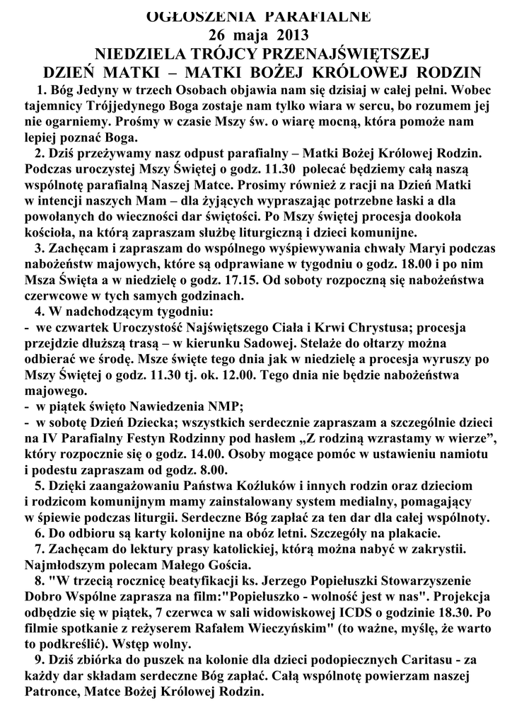 OGŁOSZENIA PARAFIALNE 26 maja 2013 NIEDZIELA TRÓJCY PRZENAJŚWIĘTSZEJ DZIEŃ MATKI – MATKI BOŻEJ KRÓLOWEJ RODZIN 1. Bóg Jedyny w trzech Osobach objawia nam się dzisiaj w całej pełni. Wobec tajemnicy Trójjedynego Boga zostaje nam tylko wiara w sercu, bo rozumem jej nie ogarniemy. Prośmy w czasie Mszy św. o wiarę mocną, która pomoże nam lepiej poznać Boga. 2. Dziś przeżywamy nasz odpust parafialny – Matki Bożej Królowej Rodzin. Podczas uroczystej Mszy Świętej o godz. 11.30 polecać będziemy całą naszą wspólnotę parafialną Naszej Matce. Prosimy również z racji na Dzień Matki w intencji naszych Mam – dla żyjących wypraszając potrzebne łaski a dla powołanych do wieczności dar świętości. Po Mszy świętej procesja dookoła kościoła, na którą zapraszam służbę liturgiczną i dzieci komunijne. 3. Zachęcam i zapraszam do wspólnego wyśpiewywania chwały Maryi podczas nabożeństw majowych, które są odprawiane w tygodniu o godz. 18.00 i po nim Msza Święta a w niedzielę o godz. 17.15. Od soboty rozpoczną się nabożeństwa czerwcowe w tych samych godzinach. 4. W nadchodzącym tygodniu: - we czwartek Uroczystość Najświętszego Ciała i Krwi Chrystusa; procesja przejdzie dłuższą trasą – w kierunku Sadowej. Stelaże do ołtarzy można odbierać we środę. Msze święte tego dnia jak w niedzielę a procesja wyruszy po Mszy Świętej o godz. 11.30 tj. ok. 12.00. Tego dnia nie będzie nabożeństwa majowego. - w piątek święto Nawiedzenia NMP; - w sobotę Dzień Dziecka; wszystkich serdecznie zapraszam a szczególnie dzieci na IV Parafialny Festyn Rodzinny pod hasłem „Z rodziną wzrastamy w wierze”, który rozpocznie się o godz. 14.00. Osoby mogące pomóc w ustawieniu namiotu i podestu zapraszam od godz. 8.00. 5. Dzięki zaangażowaniu Państwa Koźluków i innych rodzin oraz dzieciom i rodzicom komunijnym mamy zainstalowany system medialny, pomagający w śpiewie podczas liturgii. Serdeczne Bóg zapłać za ten dar dla całej wspólnoty. 6. Do odbioru są karty kolonijne na obóz letni. Szczegóły na plakacie. 7. Zachęcam do lektury prasy katolickiej, którą można nabyć w zakrystii. Najmłodszym polecam Małego Gościa. 8. "W trzecią rocznicę beatyfikacji ks. Jerzego Popiełuszki Stowarzyszenie Dobro Wspólne zaprasza na film:"Popiełuszko - wolność jest w nas". Projekcja odbędzie się w piątek, 7 czerwca w sali widowiskowej ICDS o godzinie 18.30. Po filmie spotkanie z reżyserem Rafałem Wieczyńskim" (to ważne, myślę, że warto to podkreślić). Wstęp wolny. 9. Dziś zbiórka do puszek na kolonie dla dzieci podopiecznych Caritasu - za każdy dar składam serdeczne Bóg zapłać. Całą wspólnotę powierzam naszej Patronce, Matce Bożej Królowej Rodzin.