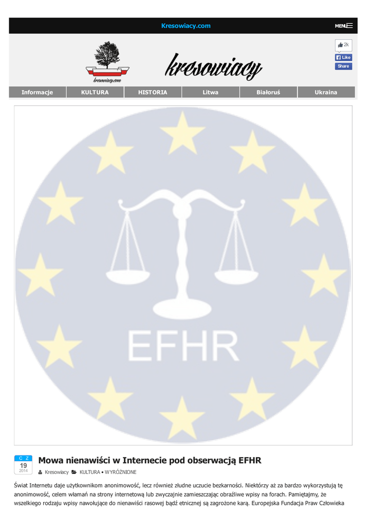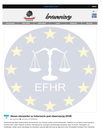 Kresowiacy.com MENU 2k Like Share Informacje C Z E 19 2014 KULTURA HISTORIA Litwa Białoruś Ukraina Mowa nienawiści w Internecie pod obserwacją EFHR Kresowiacy KULTURA • WYRÓŻNIONE Świat Internetu daje użytkownikom anonimowość, lecz również złudne uczucie bezkarności. Niektórzy aż za bardzo wykorzystują tę anonimowość, celem włamań na strony internetową lub zwyczajnie zamieszczając obraźliwe wpisy na forach. Pamiętajmy, że wszelkiego rodzaju wpisy nawołujące do nienawiści rasowej bądź etnicznej są zagrożone karą. Europejska Fundacja Praw Człowieka (EFHR) od kilku lat prowadzi kampanię mającą na celu zmianę poczucia bezkarności osób, które swoimi działaniami w sieci naruszają godność innych. Przykładem skuteczność w wykrywaniu takich osób jest sprawa 20-letniego hakera z Kowna. Chodzi o włamanie się w 2010r. na stronę internetową Szkoły Średniej im. Władysława Syrokomli w Wilnie. Hakera skazano zgodnie z art. 196 ust. 1 Kodeksu Karnego Republiki Litewskiej na karę 50 godzin prac społecznych oraz zwrócenie szkole kosztów tworzenia nowej strony internetowej w wysokości 10 tyś. litów. Jak dotychczas na Litwie ukarano autorów 35 tego typu wybryków, co daje nadzieje na ukrócenie tego zjawiska. Ponadto EFHR przypomina, że obraźliwe wpisy na forach internetowych również są zagrożone taką samą karą jaką zastosowano w przypadku 20-letniego hakera z Kowna. W swym komunikacie EFHR zachęca do przesyłania przykłady obraźliwych wpisów i komentarzy dyskryminujących na adres Fundacji. Jeśli nie będziemy obojętnie patrzeć na mowę nienawiści w Internecie możliwe, że takie zjawisko zniknie. Dariusz Zawadzki Like 3 people like this. Sign Up to see what your friends like. Send Zacieranie śladów o zbrodni wołyńskiej nadal trwa… Premier apeluje o publikację materiałów z podsłuchów; nie poda się do dymisji Add a comment... Comment F acebook social plugin Wyszukaj Aktualności Wimbledon: Agnieszka Radwańska odpadła w 1/8 finału read more Aktorka Keira Knightley w swoim najnowszym filmie również śpiewa read more Propozycja PiS dla prawicy: deklaracja programowa, wspólny kongres i listy read more OBWE ogranicza misję obserwacyjną na Ukrainie read more Start Heweliusza, polskiego satelity naukowego przełożony na 19 sierpnia read more Kasia Smutniak otrzymała jedną z najważniejszych włoskich nagród filmowych read more Get th Zobacz pełen katalog uczelni PATRONAT Dziś jest: 01 lipca 2014r. 1 lipca 30 czerwca 29 czerwca 28 czerwca 27 czerwca Zobacz także Find us on Facebook Kresowiacy Like 2,040 Kresowiacy 21 mins Cerkiew w Wistyczach- dawny kościół św. Zofii http://wp.me/p4AZyr-93s Cerkiew w Wistyczach- dawny kościół św. Zofii kresowiacy.com portal informujący o ważnych wydarzeniach z życia Polaków i Polonii, wspierający ich w walce o utrzymanie polskości na obczyźnie Uczelnie odpowiadają Akademia Muzyczna im. Grażyny i Kiejstuta Bacewiczów w Łodzi odpowiada na pytania Uniwersytet Rzeszowski PWSZ Suwałki Akademia Sztuk Pięknych w Krakowie Uniwersytet Ekonomiczny w Katowicach Najnowsze Archiwum Litwa kupuje polskie zestawy przeciwlotnicze GROM 1 lipca MaxTV: Tusk - czy to koniec? Wimbledon: Agnieszka Radwańska odpadła w 1/8 finału Слонимскую Aktorka Keira Knightley w swoim najnowszym filmie również śpiewa Bitwa pod Trebbią 1799r. – masakra polskich legionistów „Święte молодёжь веселили артисты из Мостов Miejsca na Kresach… nie tylko dla Polaków” – Antoni Soduła [odcinek 32] Propozycja PiS dla prawicy: deklaracja programowa, wspólny kongres i listy Tadania koło Kamionki Buskiej - Mogiłę pradziada ocal od zapomnienia © 2014 Kresowiacy.com Xin Magazine Theme