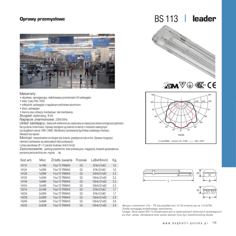 p yp leader BS 113 Oprawy przemysłowe y Materiały: Materiały: ••obudowa: obudowa:samogasnący, samogasnący,stabilizowany stabilizowanypromieniami promieniami UV UV poliwęglan poliwęglan ••kolor: szary RAL 7035 kolor: szary RAL 7035 ••odbłyśnik: odbłyśnik:poliwęglan poliwęglanzznapylanym napylanympróżniowo próżniowoaluminium aluminium • klosz: poliwęglan • klosz: poliwęglan • klamry oraz uchwyty montażowe: stal nierdzewna • klamry oraz uchwyty montażowe: stal nierdzewna Stopień ochrony: IP 65 Stopień ochrony: IP 65 Napięcie znamionowe: 230V/50Hz Napięcie znamionowe: Układ zasilający: statecznik230V/50Hz elektroniczny wykonany w najwyższej klasie energooszczędności. Na życzenie ściemniany. Oprawy dostępne są również w wersji z modułem awaryjnym Układ zasilający: statecznik elektroniczny wykonany w najwyższej klasie energoosz(za wyjątkiem 14W i 24W). Możliwość zamówienia łączników szybkiego montażu czędności. Na wersji życzenie ściemniany. Oprawy dostępne są również w wersji z modułem awaryjWieland lub Apollo.wersji 14W i 24W). Możliwość zamówienia łączników szybkiego montażu nym (za wyjątkiem Montaż: bezpośrednio na stropie lub ścianie, pojedynczo lub w linii. Oprawy mogą być Wieland lub Apollo. również montowane na zwieszakach Montaż: bezpośrednio na stropiełańcuszkowych. lub ścianie, pojedynczo lub w linii. Oprawy mogą być Listwa zaciskowa 2P+T (zaciski śrubowe 3x4,0 mm2). również montowane na zwieszakach łańcuszkowych. Zastosowanie: parkingi podziemne, hale produkcyjne, magazyny, budynki gospodarcze, Listwa zaciskowa 2P+T (zaciski śrubowe 3x4,0 mm2). pomieszczenia techniczne, myjnie… itp. 50 100 150 200 14235 Zastosowanie: parkingi podziemne, hale produkcyjne, magazyny, budynki gospodarcze, pomieszczenia myjnie… itp. Kod art. Moctechniczne, Źródło światła 14114 Kod art. 14124 14114 14128 14124 14135 14128 14149 14135 14154 14214 14149 14224 14154 14228 14214 14249 14224 14235 14228 14249 14235 1x14W Fluo T5 TRIMAX 1x14W 1x28W 1x24W 1x35W 1x28W 1x49W 1x35W 1x54W 2x14W 1x49W 2x24W 1x54W 2x28W 2x14W 2x49W 2x24W 2x35W 2x28W 2x49W 2x35W FluoFluo T5 TRIMAX T5 TRIMAX FluoFluo T5 TRIMAX T5 TRIMAX FluoFluo T5 TRIMAX T5 TRIMAX FluoFluo T5 TRIMAX T5 TRIMAX T5 TRIMAX FluoFluo T5 TRIMAX T5 TRIMAX FluoFluo T5 TRIMAX T5 TRIMAX FluoFluo T5 TRIMAX T5 TRIMAX FluoFluo T5 TRIMAX T5 TRIMAX FluoFluo T5 TRIMAX Fluo T5 TRIMAX Fluo T5 TRIMAX Trzonek LxBxH[mm] Kg G5 674x121x82 1,6 G5 G5 G5 G5 G5 G5 G5 G5 G5 674x121x82 1264x121x82 674x121x82 1564x121x82 1264x121x82 1564x121x82 1564x121x82 1264x121x82 674x121x82 1564x121x82 674x121x82 1264x121x82 1264x121x82 674x121x82 1564x121x82 674x121x82 1564x121x82 1264x121x82 1564x121x82 1564x121x82 1,6 2,3 1,6 3,2 2,3 3,2 3,2 2,3 3,2 1,7 2,3 1,7 1,7 2,9 1,7 3,9 2,9 3,9 3,9 3,9 Moc Źródło światła Trzonek LxBxH (mm) Kg 1,6 1x24W Fluo T5 TRIMAX G5 674x121x82 G5 G5 G5 G5 G5 G5 G5 G5 G5 G5 G5 Wersja z inwerterem TRprzykład (na przykład kod 14135 się na 14135TR). Wersja z inwerterem (1h) (1h) – TR –(na kod 14135 zmieniazmienia się na 14135TR). Źródła wymagają dodatkowego zamówienia. Źródła wymagają dodatkowego zamówienia. Uwaga: opraw dostarczana jest w opakowaniach zawierających Uwaga: SeriaSeria opraw BS113BS113 dostarczana jest w opakowaniach zbiorczychzbiorczych zawierających 2szt. opraw. Zamawiana ilość opraw być wielokrotnością po po 2szt. opraw. Zamawiana ilość opraw zawszezawsze musi byćmusi wielokrotnością dwójki. dwójki. 115