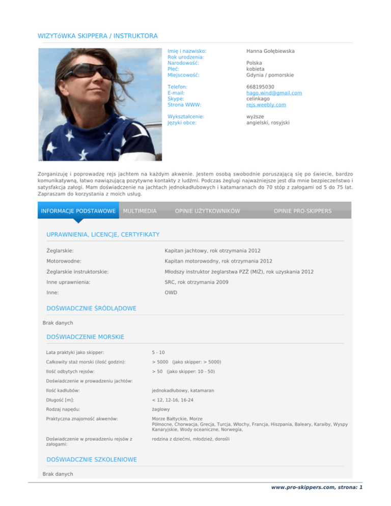 WIZYTóWKA SKIPPERA / INSTRUKTORA Imię i nazwisko: Rok urodzenia: Narodowość: Płeć: Miejscowość: Hanna Gołębiewska Telefon: E-mail: Skype: Strona WWW: 668195030 [email protected] celinkago rejs.weebly.com Wykształcenie: Języki obce: wyższe angielski, rosyjski Polska kobieta Gdynia / pomorskie Zorganizuję i poprowadzę rejs jachtem na każdym akwenie. Jestem osobą swobodnie poruszającą się po świecie, bardzo komunikatywną, łatwo nawiązującą pozytywne kontakty z ludźmi. Podczas żeglugi najważniejsze jest dla mnie bezpieczeństwo i satysfakcja załogi. Mam doświadczenie na jachtach jednokadłubowych i katamaranach do 70 stóp z załogami od 5 do 75 lat. Zapraszam do korzystania z moich usług. INFORMACJE PODSTAWOWE MULTIMEDIA OPINIE UŻYTKOWNIKÓW OPINIE PRO-SKIPPERS UPRAWNIENIA, LICENCJE, CERTYFIKATY Żeglarskie: Kapitan jachtowy, rok otrzymania 2012 Motorowodne: Kapitan motorowodny, rok otrzymania 2012 Żeglarskie instruktorskie: Młodszy instruktor żeglarstwa PZŻ (MIŻ), rok uzyskania 2012 Inne uprawnienia: SRC, rok otrzymania 2009 Inne: OWD DOŚWIADCZNIE ŚRÓDLĄDOWE Brak danych DOŚWIADCZENIE MORSKIE Lata praktyki jako skipper: 5 - 10 Całkowity staż morski (ilość godzin): > 5000 (jako skipper: > 5000) Ilość odbytych rejsów: > 50 (jako skipper: 10 - 50) Doświadczenie w prowadzeniu jachtów: Ilość kadłubów: jednokadłubowy, katamaran Długość [m]: < 12, 12-16, 16-24 Rodzaj napędu: żaglowy Praktyczna znajomość akwenów: Morze Bałtyckie, Morze Północne, Chorwacja, Grecja, Turcja, Włochy, Francja, Hiszpania, Baleary, Karaiby, Wyspy Kanaryjskie, Wody oceaniczne, Norwegia, Doświadczenie w prowadzeniu rejsów z załogami: rodzina z dziećmi, młodzież, dorośli DOŚWIADCZNIE SZKOLENIOWE Brak danych www.pro-skippers.com, strona: 1 DOŚWIADCZENIE REGATOWE Rodzaj doświadczenia regatowego: turystyczne Rodzaj regat ze względu na akwen: morskie przybrzeżne Ilość udziałów w regatach: 5-10 w tym w ostatnich 5 latach: 5-10 Pełnione funkcje podczas regat: załoga www.pro-skippers.com, strona: 2