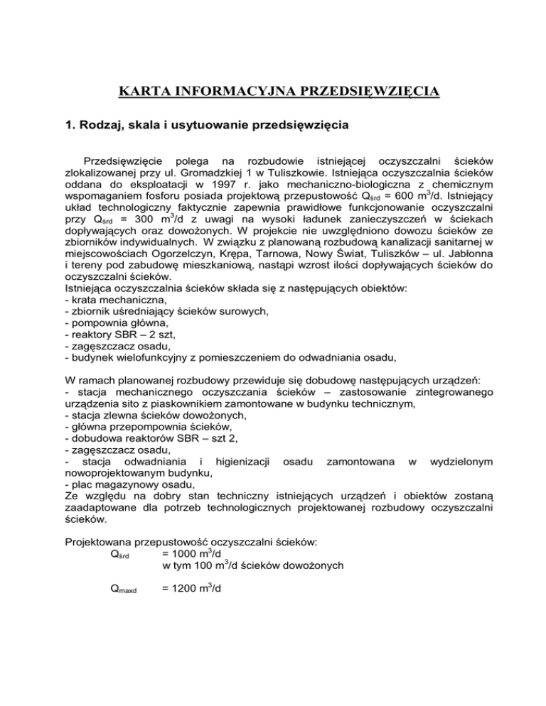 KARTA INFORMACYJNA PRZEDSIĉWZIĉCIA 1. Rodzaj, skala i usytuowanie przedsiĊwziĊcia PrzedsiĊwziĊcie polega na rozbudowie istniejącej oczyszczalni Ğcieków zlokalizowanej przy ul. Gromadzkiej 1 w Tuliszkowie. Istniejąca oczyszczalnia Ğcieków oddana do eksploatacji w 1997 r. jako mechaniczno-biologiczna z chemicznym wspomaganiem fosforu posiada projektową przepustowoĞü QĞrd = 600 m3/d. Istniejący ukáad technologiczny faktycznie zapewnia prawidáowe funkcjonowanie oczyszczalni przy QĞrd = 300 m3/d z uwagi na wysoki áadunek zanieczyszczeĔ w Ğciekach dopáywających oraz dowoĪonych. W projekcie nie uwzglĊdniono dowozu Ğcieków ze zbiorników indywidualnych. W związku z planowaną rozbudową kanalizacji sanitarnej w miejscowoĞciach Ogorzelczyn, KrĊpa, Tarnowa, Nowy ĝwiat, Tuliszków – ul. Jabáonna i tereny pod zabudowĊ mieszkaniową, nastąpi wzrost iloĞci dopáywających Ğcieków do oczyszczalni Ğcieków. Istniejąca oczyszczalnia Ğcieków skáada siĊ z nastĊpujących obiektów: - krata mechaniczna, - zbiornik uĞredniający Ğcieków surowych, - pompownia gáówna, - reaktory SBR – 2 szt, - zagĊszczacz osadu, - budynek wielofunkcyjny z pomieszczeniem do odwadniania osadu, W ramach planowanej rozbudowy przewiduje siĊ dobudowĊ nastĊpujących urządzeĔ: - stacja mechanicznego oczyszczania Ğcieków – zastosowanie zintegrowanego urządzenia sito z piaskownikiem zamontowane w budynku technicznym, - stacja zlewna Ğcieków dowoĪonych, - gáówna przepompownia Ğcieków, - dobudowa reaktorów SBR – szt 2, - zagĊszczacz osadu, - stacja odwadniania i higienizacji osadu zamontowana w wydzielonym nowoprojektowanym budynku, - plac magazynowy osadu, Ze wzglĊdu na dobry stan techniczny istniejących urządzeĔ i obiektów zostaną zaadaptowane dla potrzeb technologicznych projektowanej rozbudowy oczyszczalni Ğcieków. Projektowana przepustowoĞü oczyszczalni Ğcieków: QĞrd = 1000 m3/d w tym 100 m3/d Ğcieków dowoĪonych Qmaxd = 1200 m3/d Bilans jakoĞciowy Ğcieków dopáywających: Na podstawie analiz Ğcieków przeprowadzanych na oczyszczalni Ğcieków zostaną przyjĊte nastĊpujące stĊĪenia zanieczyszczeĔ w Ğciekach dopáywających: StĊĪenia L.p. WskaĨnik zanieczyszczeĔ [ g/m3 ] 1. BZT5 425,0 2. CHZT 800,0 3. Zawiesina ogólna 370,0 Dla w/w zaáRĪHĔ równowaĪna liczba mieszkaĔców RLM wynosi : RLM = 425 [kg O2/d] : 60 [g O2/Mk] = 7083 RLM StĊĪenia zanieczyszczeĔ w Ğciekach oczyszczonych odprowadzanych do odbiornika rzeka Pokrzywnica bĊGą wynosiáy: BZT5 d 25 mg O2/l CHZT d 125 mg O2/l Zawiesina og. d 35 mg/l Planowane przedsiĊwziĊcie zlokalizowane bĊdzie w Tuliszkowie przy ul. Gromadzkiej 1 na dziaákach oznaczonych numerami ewidencyjnymi 518, 519, 520 i 521. Dziaáki te stanowią wáasnoĞü Gminy Tuliszków. 2. Powierzchnia zajmowanej nieruchomoĞci, a takĪe obiektu budowlanego oraz dotychczasowy sposób ich wykorzystania i pokryciu nieruchomoĞci szatą roĞlinną. PrzedsiĊwziĊcie obejmuje dziaáki o numerach ewidencyjnych 518, 519, 520 i 521 zlokalizowane w Tuliszkowie przy ul. Gromadzkiej 1 o powierzchni 1,70 ha. Dotychczasowe wykorzystanie terenu nie ulegnie zmianie, gdyĪ w dalszym ciągu obiekt EĊdzie peániá funkcjĊ oczyszczalni Ğcieków dla miasta i czĊĞciowo gminy Tuliszków, dla terenów objĊtych aglomeracją Tuliszków. W obrĊbie planowanego przedsiĊwziĊcia istnieją pojedyncze drzewa i krzewy. Nie przewiduje siĊ zmiany struktury roĞlinnoĞci i wycinki drzew. Na etapie inwestycji zostanie dodatkowo przewidziana roĞlinnoĞü wysoka i niska. 3. Rodzaj technologii Planuje siĊ rozbudowĊ obiektu w technologii oczyszczalni mechanicznobiologicznej opartej na metodzie osadu czynnego o przepustowoĞci QĞrd = 1000 m3/d. W projektowanym rozwiązaniu proces ten bĊdzie odbywaá siĊ w reaktorach biologicznych, sekwencyjnych typu SBR. Reaktory bĊGą pracowaáy w sposób cykliczny, zakáada siĊ czas trwania jednego cyklu 12 godzin. NaleĪy zaznaczyü, Īe dáugoĞü trwania cyklu ustalana jest w czasie rozruchu technologicznego, biorąc pod uwagĊ jakoĞü dopáywających do oczyszczalni Ğcieków. Ponadto w początkowym okresie eksploatacji, naleĪy dostosowaü dáugoĞü cyklu do skáadu dopáywających Ğcieków. Szczególnie naleĪy zwróciü uwagĊ na iloĞci dowoĪonych Ğcieków. W cyklu pracy kaĪdego reaktora zachodziáy bĊGą wáDĞciwe procesy oczyszczania Ğcieków w nastĊpujących po sobie fazach: I faza – napeánianie reaktora Ğciekami dopáywającymi po mechanicznym oczyszczaniu. W tej fazie zawartoĞü reaktora mieszana jest w warunkach beztlenowych. II faza – w dalszym ciągu reaktor jest napeániany dopáywającymi Ğciekami. JednoczeĞnie nastĊpuje intensywne natlenianie Ğcieków. Podczas tej fazy wystĊpują procesy nitryfikacji i denitryfikacji w zaleĪnoĞci od zawartoĞci tlenu w reaktorze. III faza – jest to faza reakcji. NastĊpuje napowietrzanie i mieszanie zawartoĞci reaktora do chwili zakoĔczenia procesu nitryfikacji i denitryfikacji. IV faza – faza sedymentacji. W tym czasie nastĊpuje zamkniĊcie dopáywu Ğcieków do reaktora. ĝcieki spáywające kanalizacją kierowane są na kolejny reaktor, wzglĊdnie mogą byü retencjonowane w przepompowni gáównej, która posiada niezbĊdną pojemnoĞü. V faza – faza odprowadzania Ğcieków oczyszczonych do rzeki Pokrzywnicy. Po odprowadzeniu Ğcieków oczyszczonych z reaktora, nastĊpuje pompowanie osadu nadmiernego do zagĊszczacza. W skáad projektowanej oczyszczalni Ğcieków, po jej rozbudowie bĊGą wchodziáy nastĊpujące obiekty: Stacja zlewna Ğcieków dowoĪonych, Zbiornik uĞredniający Ğcieków surowych, Gáówna przepompownia Ğcieków, Zintegrowane urządzenie do mechanicznego oczyszczania Ğcieków skáadające siĊ z sita oraz piaskownika zamontowane w budynku technicznym, - Reaktory biologiczna SBR – 4 szt, - ZagĊszczacz osadu, - Stacja odwadniania osadu zamontowana w budynku technicznym, - Komor