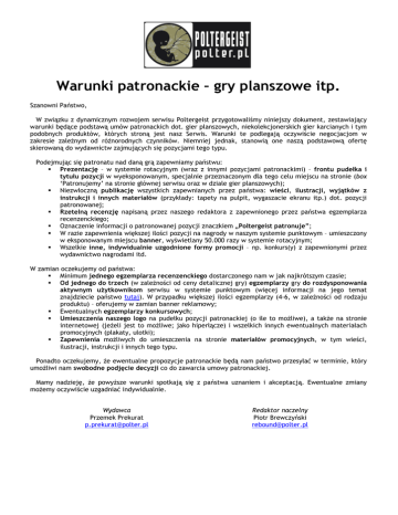 Warunki patronackie – gry planszowe itp. Szanowni Państwo, W związku z dynamicznym rozwojem serwisu Poltergeist przygotowaliśmy niniejszy dokument, zestawiający warunki będące podstawą umów patronackich dot. gier planszowych, niekolekcjonerskich gier karcianych i tym podobnych produktów, których stroną jest nasz Serwis. Warunki te podlegają oczywiście negocjacjom w zakresie zależnym od różnorodnych czynników. Niemniej jednak, stanowią one naszą podstawową ofertę skierowaną do wydawnictw zajmujących się pozycjami tego typu. Podejmując się patronatu nad daną grą zapewniamy państwu: Prezentację – w systemie rotacyjnym (wraz z innymi pozycjami patronackimi) – frontu pudełka i tytułu pozycji w wyeksponowanym, specjalnie przeznaczonym dla tego celu miejscu na stronie (box ‘Patronujemy’ na stronie głównej serwisu oraz w dziale gier planszowych); Niezwłoczną publikację wszystkich zapewnianych przez państwa: wieści, ilustracji, wyjątków z instrukcji i innych materiałów (przykłady: tapety na pulpit, wygaszacie ekranu itp.) dot. pozycji patronowanej; Rzetelną recenzję napisaną przez naszego redaktora z zapewnionego przez państwa egzemplarza recenzenckiego; Oznaczenie informacji o patronowanej pozycji znaczkiem „Poltergeist patronuje”; W razie zapewnienia większej ilości pozycji na nagrody w naszym systemie punktowym – umieszczony w eksponowanym miejscu banner, wyświetlany 50.000 razy w systemie rotacyjnym; Wszelkie inne, indywidualnie uzgodnione formy promocji – np. konkurs(y) z zapewnionymi przez wydawnictwo nagrodami itd. W zamian oczekujemy od państwa: Minimum jednego egzemplarza recenzenckiego dostarczonego nam w jak najkrótszym czasie; Od jednego do trzech (w zależności od ceny detalicznej gry) egzemplarzy gry do rozdysponowania aktywnym użytkownikom serwisu w systemie punktowym (więcej informacji na jego temat znajdziecie państwo tutaj). W przypadku większej ilości egzemplarzy (4-6, w zależności od rodzaju produktu) – oferujemy w zamian banner reklamowy; Ewentualnych egzemplarzy konkursowych; Umieszczenia naszego logo na pudełku pozycji patronackiej (o ile to możliwe), a także na stronie internetowej (jeżeli jest to możliwe; jako hiperłącze) i wszelkich innych ewentualnych materiałach promocyjnych (plakaty, ulotki); Zapewnienia możliwych do umieszczenia na stronie materiałów promocyjnych, w tym wieści, ilustracji, instrukcji i innych tego typu. Ponadto oczekujemy, że ewentualne propozycje patronackie będą nam państwo przesyłać w terminie, który umożliwi nam swobodne podjęcie decyzji co do zawarcia umowy patronackiej. Mamy nadzieję, że powyższe warunki spotkają się z państwa uznaniem i akceptacją. Ewentualne zmiany możemy oczywiście uzgadniać indywidualnie. Wydawca Przemek Prekurat [email protected] Redaktor naczelny Piotr Brewczyński [email protected]