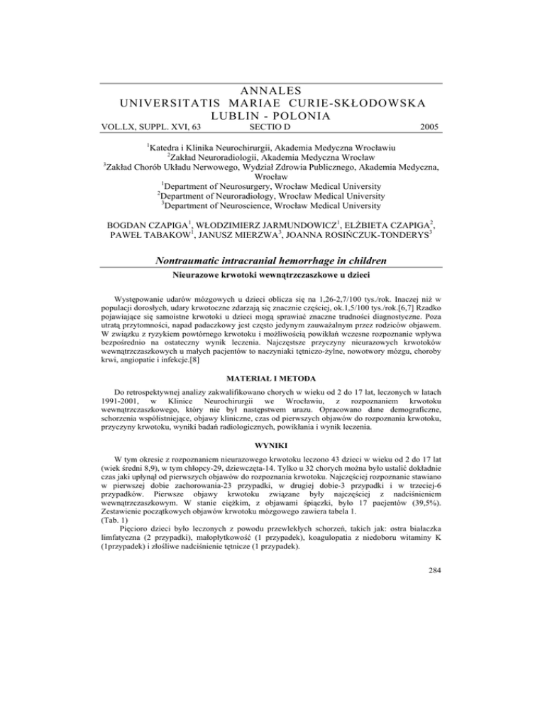 ANNALES UNIVERSITATIS MARIAE CURIE-SKŁODOWSKA LUBLIN - POLONIA VOL.LX, SUPPL. XVI, 63 SECTIO D 2005 1 Katedra i Klinika Neurochirurgii, Akademia Medyczna Wrocławiu 2 Zakład Neuroradiologii, Akademia Medyczna Wrocław 3 Zakład Chorób Układu Nerwowego, Wydział Zdrowia Publicznego, Akademia Medyczna, Wrocław 1 Department of Neurosurgery, Wrocław Medical University 2 Department of Neuroradiology, Wrocław Medical University 3 Department of Neuroscience, Wrocław Medical University BOGDAN CZAPIGA1, WŁODZIMIERZ JARMUNDOWICZ1, ELŻBIETA CZAPIGA2, PAWEŁ TABAKOW1, JANUSZ MIERZWA3, JOANNA ROSIŃCZUK-TONDERYS3 Nontraumatic intracranial hemorrhage in children Nieurazowe krwotoki wewnątrzczaszkowe u dzieci Występowanie udarów mózgowych u dzieci oblicza się na 1,26-2,7/100 tys./rok. Inaczej niż w populacji dorosłych, udary krwotoczne zdarzają się znacznie częściej, ok.1,5/100 tys./rok.[6,7] Rzadko pojawiające się samoistne krwotoki u dzieci mogą sprawiać znaczne trudności diagnostyczne. Poza utratą przytomności, napad padaczkowy jest często jedynym zauważalnym przez rodziców objawem. W związku z ryzykiem powtórnego krwotoku i możliwością powikłań wczesne rozpoznanie wpływa bezpośrednio na ostateczny wynik leczenia. Najczęstsze przyczyny nieurazowych krwotoków wewnątrzczaszkowych u małych pacjentów to naczyniaki tętniczo-żylne, nowotwory mózgu, choroby krwi, angiopatie i infekcje.[8] MATERIAŁ I METODA Do retrospektywnej analizy zakwalifikowano chorych w wieku od 2 do 17 lat, leczonych w latach 1991-2001, w Klinice Neurochirurgii we Wrocławiu, z rozpoznaniem krwotoku wewnątrzczaszkowego, który nie był następstwem urazu. Opracowano dane demograficzne, schorzenia współistniejące, objawy kliniczne, czas od pierwszych objawów do rozpoznania krwotoku, przyczyny krwotoku, wyniki badań radiologicznych, powikłania i wynik leczenia. WYNIKI W tym okresie z rozpoznaniem nieurazowego krwotoku leczono 43 dzieci w wieku od 2 do 17 lat (wiek średni 8,9), w tym chłopcy-29, dziewczęta-14. Tylko u 32 chorych można było ustalić dokładnie czas jaki upłynął od pierwszych objawów do rozpoznania krwotoku. Najczęściej rozpoznanie stawiano w pierwszej dobie zachorowania-23 przypadki, w drugiej dobie-3 przypadki i w trzeciej-6 przypadków. Pierwsze objawy krwotoku związane były najczęściej z nadciśnieniem wewnątrzczaszkowym. W stanie ciężkim, z objawami śpiączki, było 17 pacjentów (39,5%). Zestawienie początkowych objawów krwotoku mózgowego zawiera tabela 1. (Tab. 1) Pięcioro dzieci było leczonych z powodu przewlekłych schorzeń, takich jak: ostra białaczka limfatyczna (2 przypadki), małopłytkowość (1 przypadek), koagulopatia z niedoboru witaminy K (1przypadek) i złośliwe nadciśnienie tętnicze (1 przypadek). 284 Jako pierwsze badanie obrazowe u 41 chorych (95,3%) wykonano tomografię komputerową (TK), jedynie u dwojga dzieci diagnostykę rozpoczęto od rezonansu magnetycznego (MR). W celu zidentyfikowania przyczyny krwotoku wykonywano angiografię klasyczną lub angiografię w tomografii komputerowej (angio-TK). Ogółem wykonano 29 angiografii i 13 badań angio-TK. W 5 przypadkach, z dużym krwiakiem śródmózgowym i szybko pogarszającym się stanem neurologicznym, zdecydowano o leczeniu operacyjnym bez badań naczyniowych. Wszystkie negatywne wyniki badań naczyniowych (brak malformacji naczyń mózgowych) były kontrolowane badaniem MR i angio-MR lub angio-TK. Badania te przeprowadzano w różnych okresach po krwotoku, od 3 miesięcy do 4 lat. Tylko u jednego dziecka, po 11 miesiącach od krwotoku, udało się wykryć naczyniak zlokalizowany w szyjnym odcinku rdzenia kręgowego, który wcześniej był przyczyną krwotoku do układu komorowego z ostrym wodogłowiem. W pozostałych przypadkach badania kontrolne nie wykazały przyczyny krwawienia. W prezentowanej grupie wystąpiły różne rodzaje krwotoków. Najwięcej było krwiaków śródmiąższowych-31 przypadków, z czego tylko jeden w obszarze podnamiotowym, 7 krwotoków dokomorowych. Reszta to krwotoki podpajęczynówkowe-5 przypadków. Na podstawie badań naczyniowych i układu krzepnięcia udało się wykazać przyczynę krwawienia w 32 (74,4%) przypadkach, 11 (25,5%) krwotoków zakwalifikowano jako niewyjaśnione. Przyczyny krwotoków zawiera (Tab. 2. tabela ) 2. Do leczenia operacyjnego zakwalifikowano 35 chorych. Ewakuacja krwiaka z wycięciem naczyniaka lub klipsowaniem tętniaka została wykonana w 30 przypadkach. W pozostałych 5 wykonano drenaż komorowy. Dwóch chorych z naczyniakami tętniczo-żylnymi mózgu i szyjnego odcinka rdzenia kręgowego, zostało poddanych embolizacji. Natomiast w innym przypadku naczyniaka mózgu zastosowano radiochirurgię w ośrodku zagranicznym. Ze względu na ciężki stan (objawy głębokiego uszkodzenia pnia mózgu) nie wykonywano zabiegów u 6 chorych. Najcięższym powikłaniem był powtórny, śmiertelny krwotok, który wystąpił 14 miesięcy po zabiegu radiochirurgii głębokiego naczyniaka mózgu. Z całej grupy 43 chorych zmarło 8 (18,6%) pacjentów. Byli to chorzy z zaburzeniami krzepnięcia w przebiegu anemii aplastycznej, trombocytopenii, hypoprotrombinemii oraz dwoje chorych z naczyniakami mózgu i po jednym chorym z tętniakiem i krwiakiem śródmózgowym o niewyjaśnionej etiologii. OMÓWIENIE Nieurazowy krwotok wewnątrzczaszkowy występuje rzadko u dzieci. Piśmiennictwo na temat krwotoków u dorosłych jest bardzo bogate, natomiast prac analizujących to zjawisko u dzieci jest niewiele. Publikowane serie przypadków obejmują stosunkowo niewielu chorych, zbieranych przez wiele lat. [4,7] Podstawowym niebezpieczeństwem wynikającym z opóźnienia rozpoznania jest możliwość powtórnego krwotoku, często tragicznego w skutkach. W tętniakach ryzyko powtórnego krwotoku u dzieci jest znacznie większe niż u dorosłych i wynosi aż 52%.[5] Objawy krwotoku rozwijają się w ciągu 1 godziny lub szybciej.[7] D
