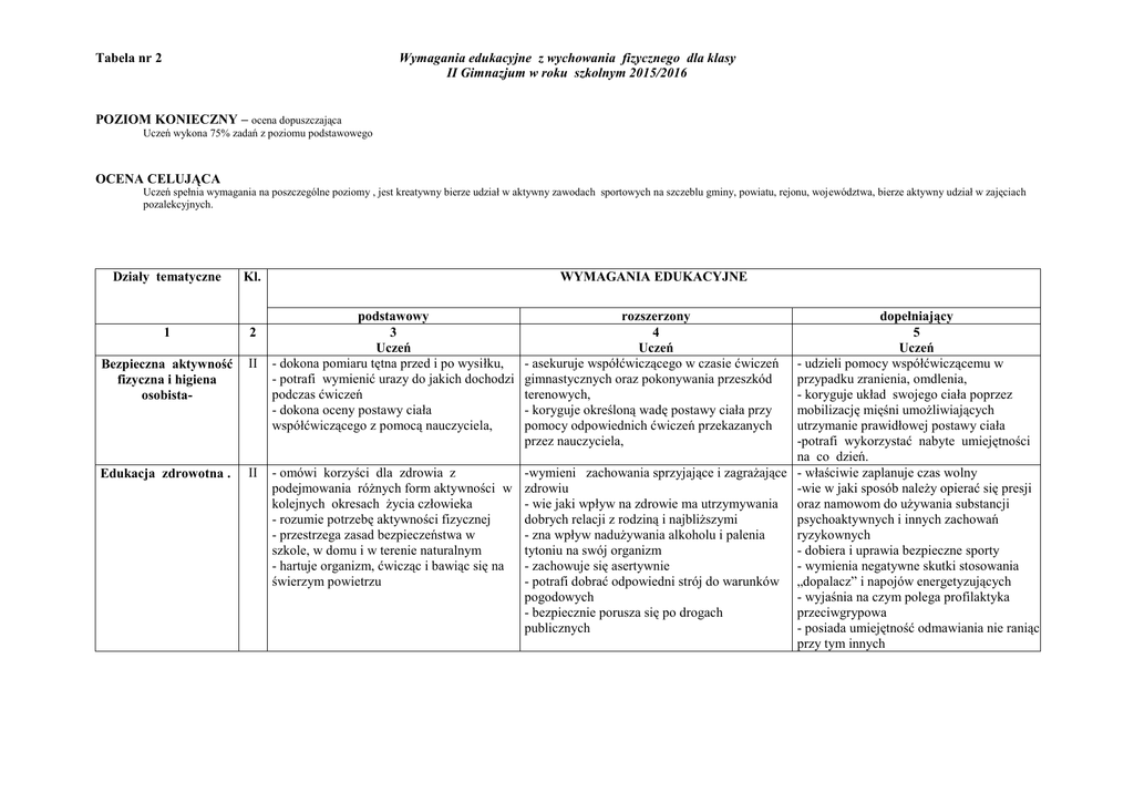 Tabela nr 2 Wymagania edukacyjne z wychowania fizycznego dla klasy II Gimnazjum w roku szkolnym 2015/2016 POZIOM KONIECZNY – ocena dopuszczająca Uczeń wykona 75% zadań z poziomu podstawowego OCENA CELUJĄCA Uczeń spełnia wymagania na poszczególne poziomy , jest kreatywny bierze udział w aktywny zawodach sportowych na szczeblu gminy, powiatu, rejonu, województwa, bierze aktywny udział w zajęciach pozalekcyjnych. Działy tematyczne Kl. 1 2 Bezpieczna aktywność fizyczna i higiena osobista- II Edukacja zdrowotna . II WYMAGANIA EDUKACYJNE dopełniający 5 Uczeń - udzieli pomocy współćwiczącemu w przypadku zranienia, omdlenia, - koryguje układ swojego ciała poprzez mobilizację mięśni umożliwiających utrzymanie prawidłowej postawy ciała -potrafi wykorzystać nabyte umiejętności na co dzień. - omówi korzyści dla zdrowia z -wymieni zachowania sprzyjające i zagrażające - właściwie zaplanuje czas wolny podejmowania różnych form aktywności w zdrowiu -wie w jaki sposób należy opierać się presji kolejnych okresach życia człowieka - wie jaki wpływ na zdrowie ma utrzymywania oraz namowom do używania substancji - rozumie potrzebę aktywności fizycznej dobrych relacji z rodziną i najbliższymi psychoaktywnych i innych zachowań - przestrzega zasad bezpieczeństwa w - zna wpływ nadużywania alkoholu i palenia ryzykownych szkole, w domu i w terenie naturalnym tytoniu na swój organizm - dobiera i uprawia bezpieczne sporty - hartuje organizm, ćwicząc i bawiąc się na - zachowuje się asertywnie - wymienia negatywne skutki stosowania świerzym powietrzu - potrafi dobrać odpowiedni strój do warunków „dopalacz” i napojów energetyzujących pogodowych - wyjaśnia na czym polega profilaktyka - bezpiecznie porusza się po drogach przeciwgrypowa publicznych - posiada umiejętność odmawiania nie raniąc przy tym innych podstawowy 3 Uczeń - dokona pomiaru tętna przed i po wysiłku, - potrafi wymienić urazy do jakich dochodzi podczas ćwiczeń - dokona oceny postawy ciała współćwiczącego z pomocą nauczyciela, rozszerzony 4 Uczeń - asekuruje współćwiczącego w czasie ćwiczeń gimnastycznych oraz pokonywania przeszkód terenowych, - koryguje określoną wadę postawy ciała przy pomocy odpowiednich ćwiczeń przekazanych przez nauczyciela, Diagnoza sprawności i aktywności fizycznej oraz rozwoju fizycznego II Trening zdrowia Gimnastyka II - potrafi przyjąć prawidłową postawę do wykonania testu - dokona pomiaru tętna przed i po wysiłku, - potrafi dokonać pomiaru wzrostu i ciężaru oraz prawidłowo dokonać jego odczytu - jest zdyscyplinowany Uczeń - potrafi zorganizować bezpieczne miejsce pracy - wykona kilka ćwiczeń siłowych dostosowując ich intensywność do własnych możliwości -potrafi wykonać poprawną rozgrzewkę przed wykonywaniem testu Uczeń - wzmacnia mięśnie posturalne grzbietu, brzucha i pośladków przy użyciu różnych przyborów - świadomie podejmuje wysiłek w celu uzyskania założonych wyników - wyciąga wnioski na przyszłość do samodoskonalenia Uczeń - zna zasady wykonywania przerzutu bokiem -potrafi wykonać przewroty w przód i w tył - potrafi stanąć na rękach przy drabinkach przy pomocy nauczyciela - potrafi pokonać skrzynię (5 części ) - dokonuje próby wykonania piramidy - właściwie zachowuje się na zajęciach - przestrzega zasad bezpieczeństwa, ćwicząc na przyrządach - szanuje sprzęt sportowy - potrafi wykonać zaproponowane piramidy trójkowe - potrafi wykonać przewrót w przód i w tył z różnych pozycji - przerzut bokiem do rozkroku z ramionami w bok - potrafi przeskoczyć przez skrzynię ( 5 części) poprawnie technicznie - odczuwa radość i zadowolenie z wykonywania zadania - wykonuje prośby i polecenia nauczyciela - zaproponuje i wykona w zespole piramidy trójkowe - wykona łączone przewroty w przód i w tył z różnych pozycji wyjściowych - potrafi stanąć na rękach przy drabinkach z zamachem jednonóż bez pomocy nauczyciela - świadomie kształtuje swoją sylwetkę - pomaga i asekuruje kolegów - omawia technikę wykonywania skoków, przewrotów oraz stania na rękach Lekka atletyka Ocena poziomu sprawności będzie stosowana według tabel. 60 m Celujący Bardzo dobry Dobry Dostateczny Dopuszczający Minimum 8,40 8,90 9,40 9,90 10,40 11,00 100 m 9,30 Celujący 14,00 9,80 Bardzo dobry 14,80 10,30 Dobry 15,80 10,80 Dostateczny 16,80 11,40 Dopuszczający 17,00 11,80 Minimum 17,70 Skok w dal z miejsca Celujący Bardzo dobry Dobry Dostateczny Dopuszczający Minimum 250 225 200 185 175 164 215 200 183 175 167 155 600 m 15,00 Celujący 15,80 Bardzo dobry 16,50 Dobry 17,50 Dostateczny 18,60 Dopuszczający 19,20 Minimum 5,00 4,60 4,10 3,90 3,70 3,45 800 m 2,03 2,34 2,55 3,14 3,45 3,58 Rzut p. lekarską Skok w dal Celujący Bardzo dobry Dobry Dostateczny Dopuszczający Minimum 1,42 1,47 1,50 2,00 2,03 2,10 4,30 4,00 3,60 3,45 3,30 3,10 Celujący Bardzo dobry Dobry Dostateczny Dopuszczający Minimum 10,40 8,50 7,90 6,70 5,80 5,00 Celujący Bardzo dobry Dobry Dostateczny Dopuszczający Minimum 2,50 3,00 3,06 3,33 3,40 4,03 1500 m 8,00 4,50 Celujący 6,40 Bardzo dobry 5,10 6,00 5,25 Dobry 5,20 Dostateczny 5,35 4,90 Dopuszczający 5,50 4,00 6,10 Minimum 1000 m 3,10 3,15 3,30 3,55 4,04 4,12 Celujący Bardzo dobry Dobry Dostateczny Dopuszczający Minimum 3,10 3,45 4,05 4,25 4,50 5,10 4,08 4,25 4,42 5,00 5,22 5,37 Test Coopera (12min) 5,30 2900 Celujący 5,40 Bardzo dobry 2650 6,00 2400 Dobry 6,10 Dostateczny 1900 6,35 Dopuszczający 1500 7,00 Minimum do1450 2550 2250 2000 1550 1150 do1100 Sporty całego życia i wypoczynek Uczeń Uczeń Uczeń II - przyjmuje odpowiednią postawę siatkarską wysoką lub niską -poprawnie wykonuje polecone ćwiczenia - potrafi wystawić piłkę partnerowi wybranym przez siebie sposobem - wykona 3 z 5 prawidłowych zagrywek tenisowych - potrafi przyjąć piłkę z zagrywki - jest ambitny w dążeniu do celu - odbija poprawnie technicznie sp