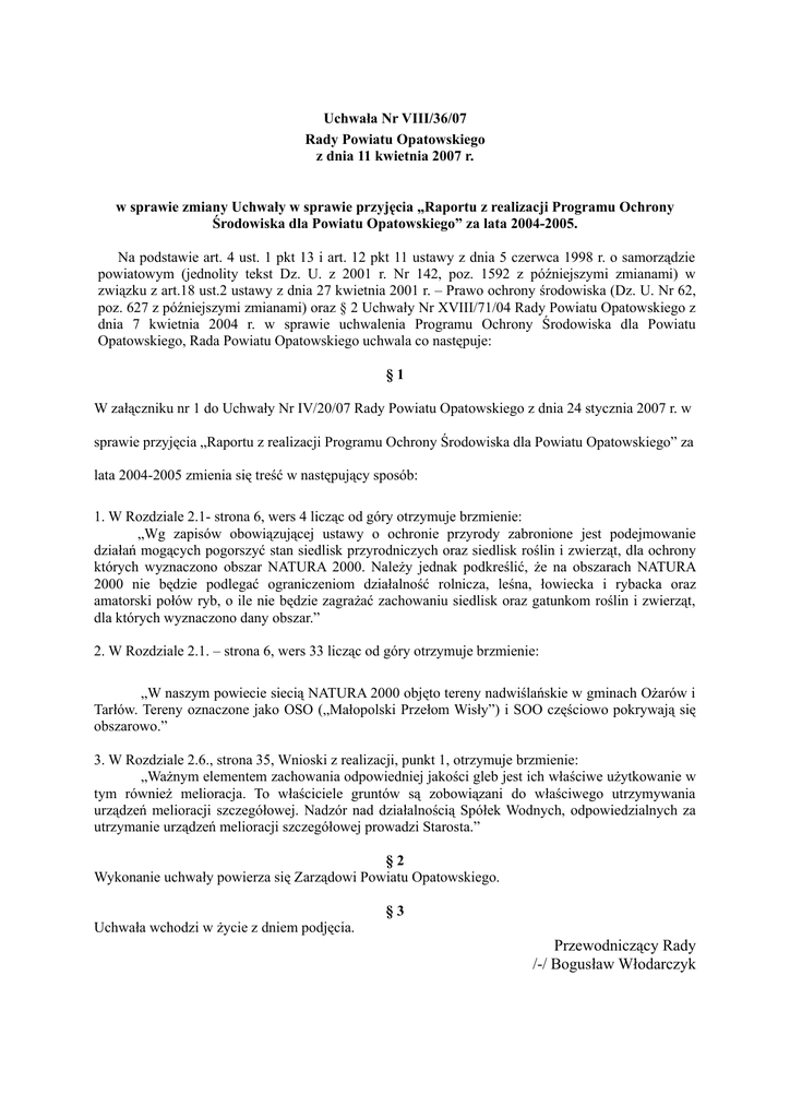 Uchwała Nr VIII/36/07 Rady Powiatu Opatowskiego z dnia 11 kwietnia 2007 r. w sprawie zmiany Uchwały w sprawie przyjęcia „Raportu z realizacji Programu Ochrony Środowiska dla Powiatu Opatowskiego” za lata 2004-2005. Na podstawie art. 4 ust. 1 pkt 13 i art. 12 pkt 11 ustawy z dnia 5 czerwca 1998 r. o samorządzie powiatowym (jednolity tekst Dz. U. z 2001 r. Nr 142, poz. 1592 z późniejszymi zmianami) w związku z art.18 ust.2 ustawy z dnia 27 kwietnia 2001 r. – Prawo ochrony środowiska (Dz. U. Nr 62, poz. 627 z późniejszymi zmianami) oraz § 2 Uchwały Nr XVIII/71/04 Rady Powiatu Opatowskiego z dnia 7 kwietnia 2004 r. w sprawie uchwalenia Programu Ochrony Środowiska dla Powiatu Opatowskiego, Rada Powiatu Opatowskiego uchwala co następuje: §1 W załączniku nr 1 do Uchwały Nr IV/20/07 Rady Powiatu Opatowskiego z dnia 24 stycznia 2007 r. w sprawie przyjęcia „Raportu z realizacji Programu Ochrony Środowiska dla Powiatu Opatowskiego” za lata 2004-2005 zmienia się treść w następujący sposób: 1. W Rozdziale 2.1- strona 6, wers 4 licząc od góry otrzymuje brzmienie: „Wg zapisów obowiązującej ustawy o ochronie przyrody zabronione jest podejmowanie działań mogących pogorszyć stan siedlisk przyrodniczych oraz siedlisk roślin i zwierząt, dla ochrony których wyznaczono obszar NATURA 2000. Należy jednak podkreślić, że na obszarach NATURA 2000 nie będzie podlegać ograniczeniom działalność rolnicza, leśna, łowiecka i rybacka oraz amatorski połów ryb, o ile nie będzie zagrażać zachowaniu siedlisk oraz gatunkom roślin i zwierząt, dla których wyznaczono dany obszar.” 2. W Rozdziale 2.1. – strona 6, wers 33 licząc od góry otrzymuje brzmienie: „W naszym powiecie siecią NATURA 2000 objęto tereny nadwiślańskie w gminach Ożarów i Tarłów. Tereny oznaczone jako OSO („Małopolski Przełom Wisły”) i SOO częściowo pokrywają się obszarowo.” 3. W Rozdziale 2.6., strona 35, Wnioski z realizacji, punkt 1, otrzymuje brzmienie: „Ważnym elementem zachowania odpowiedniej jakości gleb jest ich właściwe użytkowanie w tym również melioracja. To właściciele gruntów są zobowiązani do właściwego utrzymywania urządzeń melioracji szczegółowej. Nadzór nad działalnością Spółek Wodnych, odpowiedzialnych za utrzymanie urządzeń melioracji szczegółowej prowadzi Starosta.” §2 Wykonanie uchwały powierza się Zarządowi Powiatu Opatowskiego. §3 Uchwała wchodzi w życie z dniem podjęcia. Przewodniczący Rady /-/ Bogusław Włodarczyk UZASADNIENIE do projektu zmiany Uchwały w sprawie przyjęcia „Raportu z realizacji Programu Ochrony Środowiska dla Powiatu Opatowskiego” za lata 2004-2005. Uchwałą Nr IV/20/07 Rady Powiatu Opatowskiego z dnia 24 stycznia 2007 r. w sprawie przyjęcia „Raportu z realizacji Programu Ochrony Środowiska dla Powiatu Opatowskiego” za lata 2004-2005 przyjęto „Raport z realizacji Programu Ochrony Środowiska dla Powiatu Opatowskiego za lata 2004-2005 o treści jak w załączniku nr 1 do w/w uchwały. Z powodu zawartych w treści „Raportu…” merytorycznych błędów, należało zmienić dotychczasowy zapis: 1. W Rozdziale 2.1- strona 6, wers 4 licząc od góry: „Wg zapisów projektu nowej ustawy o ochronie przyrody zabronione będzie podejmowanie działań mogących pogorszyć stan siedlisk przyrodniczych oraz siedlisk roślin i zwierząt, dla ochrony których wyznaczono obszar NATURA 2000. Należy jednak podkreślić, że na obszarach NATURA 2000 nie będzie podlegać ograniczeniom działalność rolnicza, leśna, łowiecka i rybacka oraz amatorski połów ryb, o ile nie będą zagrażać zachowaniu siedlisk oraz gatunkom roślin i zwierząt, dla których wyznaczono dany obszar”. na: „Wg zapisów obowiązującej ustawy o ochronie przyrody zabronione jest podejmowanie działań mogących pogorszyć stan siedlisk przyrodniczych oraz siedlisk roślin i zwierząt, dla ochrony których wyznaczono obszar NATURA 2000. Należy jednak podkreślić, że na obszarach NATURA 2000 nie będzie podlegać ograniczeniom działalność rolnicza, leśna, łowiecka i rybacka oraz amatorski połów ryb, o ile nie będzie zagrażać zachowaniu siedlisk oraz gatunkom roślin i zwierząt, dla których wyznaczono dany obszar.” 2. W Rozdziale 2.1. – strona 6, wers 33 licząc od góry: „W naszym powiecie do objęcia siecią NATURA 2000 proponowane są tereny nadwiślańskie w gminach Ożarów i Tarłów.” na: „W naszym powiecie objęto siecią NATURA 2000 tereny nadwiślańskie w gminach Ożarów Tarłów.” 3.W Rozdziale 2.6., strona 35, Wnioski z realizacji, punkt 1: „Ważnym elementem zachowania odpowiedniej jakości gleb jest ich właściwe użytkowanie w tym również melioracja. To właściciele gruntów są zobowiązani do właściwego utrzymywania urządzeń melioracji szczegółowej. Nadzór nad utrzymaniem urządzeń melioracji szczegółowej prowadzi Starosta.” na: „Ważnym elementem zachowania odpowiedniej jakości gleb jest ich właściwe użytkowanie w tym również melioracja. To właściciele gruntów są zobowiązani do właściwego utrzymywania urządzeń melioracji szczegółowej. Nadzór nad działalnością Spółek Wodnych, odpowiedzialnych za utrzymanie urządzeń melioracji szczegółowej prowadzi Starosta.” Opracował: Wydział Rolnictwa i Ochrony Środowiska