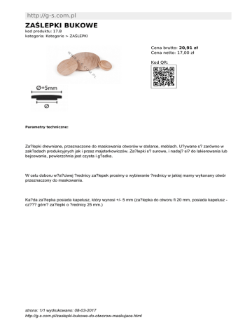 http://g-s.com.pl ZAŚLEPKI BUKOWE kod produktu: 17.B kategoria: Kategorie > ZAŚLEPKI Cena brutto: 20,91 zł Cena netto: 17,00 zł Kod QR: Parametry techniczne: Za?lepki drewniane, przeznaczone do maskowania otworów w stolarce, meblach. U?ywane s? zarówno w zak?adach produkcyjnych jak i przez majsterkowiczów. Za?lepki s? surowe, i nadaj? si? do lakierowania lub bejcowania, powierzchnia jest czysta i g?adka. W celu doboru w?a?ciwej ?rednicy za?lepek prosimy o wybieranie ?rednicy w jakiej mamy wykonany otwór przeznaczony do maskowania. Ka?da za?lepka posiada kapelusz, który wynosi +/- 5 mm (za?lepka do otworu fi 20 mm, posiada kapelusz cz??? górn? za?lepki o ?rednicy 25 mm.) strona: 1/1 wydrukowano: 08-03-2017 http://g-s.com.pl/zaslepki-bukowe-do-otworow-maskujace.html