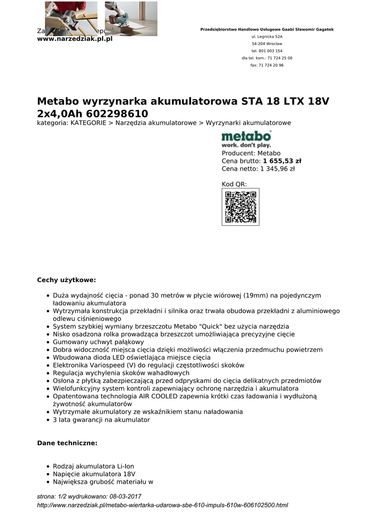 Zapraszamy do sklepu www.narzedziak.pl.pl Przedsiębiorstwo Handlowo Usługowe Gaabi Sławomir Gagatek ul. Legnicka 52A 54-204 Wrocław tel. 801 003 154 dla tel. kom.: 71 724 25 00 fax: 71 724 20 96 Metabo wyrzynarka akumulatorowa STA 18 LTX 18V 2x4,0Ah 602298610 kategoria: KATEGORIE > Narzędzia akumulatorowe > Wyrzynarki akumulatorowe Producent: Metabo Cena brutto: 1 655,53 zł Cena netto: 1 345,96 zł Kod QR: Cechy użytkowe: Duża wydajność cięcia - ponad 30 metrów w płycie wiórowej (19mm) na pojedynczym ładowaniu akumulatora Wytrzymała konstrukcja przekładni i silnika oraz trwała obudowa przekładni z aluminiowego odlewu ciśnieniowego System szybkiej wymiany brzeszczotu Metabo "Quick" bez użycia narzędzia Nisko osadzona rolka prowadząca brzeszczot umożliwiająca precyzyjne cięcie Gumowany uchwyt pałąkowy Dobra widoczność miejsca cięcia dzięki możliwości włączenia przedmuchu powietrzem Wbudowana dioda LED oświetlająca miejsce cięcia Elektronika Variospeed (V) do regulacji częstotliwości skoków Regulacja wychylenia skoków wahadłowych Osłona z płytką zabezpieczającą przed odpryskami do cięcia delikatnych przedmiotów Wielofunkcyjny system kontroli zapewniający ochronę narzędzia i akumulatora Opatentowana technologia AIR COOLED zapewnia krótki czas ładowania i wydłużoną żywotność akumulatorów Wytrzymałe akumulatory ze wskaźnikiem stanu naładowania 3 lata gwarancji na akumulator Dane techniczne: Rodzaj akumulatora Li-Ion Napięcie akumulatora 18V Największa grubość materiału w strona: 1/2 wydrukowano: 08-03-2017 http://www.narzedziak.pl/metabo-wiertarka-udarowa-sbe-610-impuls-610w-606102500.html - drewno 135 mm - metale nieżelazne 35 mm - blacha stalowa 10 mm - 45 °/+ 45 ° Stopnie skoków wahadłowych 4 Częstotliwość skoków na biegu jałowym 0 - 2.700 /min Ciężar (z akumulatorem) 2,8 kg Wyposażenie: nasadzana płytka ochronna z osłoną przed wiórami klucz sześciokątny 2 akumulatory Li-Power Extreme (18 V/4,0 Ah) szybka ładowarka "AIR COOLED" ASC 30 Walizka narzędziowa z tworzywa sztucznego Gwarancja XXL Elektronarzędzia Metabo słyną z wytrzymałości i niezawodności. A ponieważ tak rzadko zawodzą, Metabo wprowadziło dla Państwa rozszerzoną 3-letnią gwarancję XXL. Jeśli zarejestrują Państwo nasz produkt, standardowa gwarancja zostanie wydłużona do 3 lat strona: 2/2 wydrukowano: 08-03-2017 http://www.narzedziak.pl/metabo-wiertarka-udarowa-sbe-610-impuls-610w-606102500.html