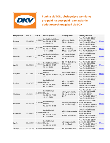 Punkty viaTOLL obsługujące wymianę pre-paid na post-paid i zamawianie dodatkowych urządzeń viaBOX Miejscowość GPS 1 GPS 2 Szczecin 53.385709 14.68520 2 Kielce 50.876694 20.65886 6 Rzeszów 50.055775 21.99156 6 Lipniki 53.086266 17.86115 2 Białystok 53.15085 23.15992 Przylep 51.977677 15.44450 3 Mogilany 49.95151 19.89044 7 Katowice 50.264186 18.96709 2 Komorniki 52.348422 16.80453 3 Opole 50.659507 17.96564 Olsztyn 53.781254 20.53356 Nazwa punktu Adres punktu Godziny otwarcia Pon - Pt: 07:00 - 21:00* Punkt Obsługi Klienta ul. Pomorska 88; Sb: 07.00 - 21.00**** tel. 91 480 87 52 70-812 Szczecin Pon - Pt: 08:00 - 18:00** 91 480 87 51 Pon - Pt: 08:00-16:00*** Punkt Obsługi Klienta ul. Rolna 8; Pon - Pt: 07:00 - 21:00** tel. 41 344 70 62 25-950 Kielce; Sb: 07.00 - 21.00**** 41 342 50 08 Miasto przy DK 74 Pon - Pt: 08:00-16:00*** Pon - Pt: całodobowo* Punkt Obsługi Klienta Al. Wyzwolenia 6; Sb: 07.00 - 21.00**** tel. 17 860 32 48 35-959 Rzeszów; Pon - Pt: 08:00 - 18:00** 17 860 32 49 DK 9 Pon - Pt: 08:00-16:00*** 86-005 Białe Błota Pon - Pt: 07:00 - 21:00* Punkt Obsługi Klienta k/Bygoszczy Sb: 07.00 - 21.00**** tel. 52 381 49 94 z siedzibą w Pon - Pt: 08:00 - 18:00** 52 349 41 64 Lipnikach Pon - Pt: 08:00-16:00*** Punkt Obsługi Pon - Pt: całodobowo* Klienta ul. Kombatantów 4; Sb: 07.00 - 21.00**** tel. 85 664 31 43 w. 146, 15-102 Białystok Pon - Pt: 08:00 - 18:00** 147 Pon - Pt: 08:00-16:00*** Pon - Pt: 07:00 - 21:00* Punkt Obsługi ul. 22 Lipca 86B; Sb: 07.00 - 21.00**** Klienta 66-015 Przylep; Sb: 08.00 - 14.00* tel. 68 328 34 70 Droga 280 Pon - Pt: 08:00 - 18:00** 68 328 34 71 Pon - Pt: 08:00-16:00*** Pon - Pt: całodobowo* Punkt Obsługi ul. Myslenicka 19; Sb: 07.00 - 21.00**** Klienta 32-031 Mogilany; Sb: 08.00 - 14.00* tel. 12 372 70 80 DK 7 Pon - Pt: 08:00 - 18:00** 12 372 70 81 Pon - Pt: 08:00-16:00*** Pon - Pt: 07:00 - 21:00* Punkt Obsługi ul. Henryka Dulęby 7; Sb: 08.00 - 14.00* Klienta 40-833 Katowice Pon - Pt: 08:00 - 18:00** tel. 32 601 25 93 Pon - Pt: 08:00-16:00*** Pon - Pt: całodobowo* Punkt Obsługi ul. Ks.Wawrzyniaka Sb: 07.00 - 21.00**** Klienta 1; Sb: 08.00 - 14.00* tel. 61 810 72 25 62-052 Komorniki Pon - Pt: 08:00 - 18:00** 61 810 78 45 Pon - Pt: 08:00-16:00*** Pon - Pt: 07:00 - 21:00* Punkt Obsługi ul. Głogowska 35; Sb: 07.00 - 21.00**** Klienta 45-315 Opole Pon - Pt: 08:00 - 18:00** tel. 77 410 82 08 Pon - Pt: 08:00-16:00*** Punkt Obsługi ul. Towarowa 20A; Pon - Pt: 07:00 - 21:00* Mapa Mapa Mapa Mapa Mapa Mapa Mapa Mapa Mapa Mapa Mapa 5 Klienta tel. 895 261 063 10-417 Olsztyn; przy DK 16 Punkt Obsługi Klienta 19.59707 tel. 42 280 24 85 42 280 24 87 Smolice 1L; 95-010 Stryków; A2 Smolice k. Strykowa 51.89570 Biała-Podlaska Punkt Obsługi Klienta 23.11669 52.045312 tel. 83 344 47 34 w. 22, 3 23 507 802 276 Punkt Obsługi Ołtarzew, k 20.74686 Klienta Ożarowa 52.210782 5 tel. 22 733 52 85 Mazowieckiego 22 733 52 86 Wrocław Punkt Obsługi 16.95034 51.092327 Klienta 9 tel. 71 341 34 33 Gdynia Punkt Obsługi 18.49610 Klienta 54.537564 6 tel. 58 663 69 93 wew.41 Budzisk 54.30623 Kuźnica 53.521808 Bobrowniki WAMAR Budynek 23.11702 usługowy przy wjeździe Kukuryki Chełm 51.145703 Korczowa Barwinek Słowacja Chyżne 23.50149 2 23.11211 49.956675 1 21.69580 49.418961 6 Pon - Pt: całodobowo* Sb: 07.00 - 21.00**** Pon - Pt: 08:00 - 18:00** Pon - Pt: 08:00-16:00*** Mapa ul. Poznańska 343; 05-850, Ołtarzew; Ożarów Mazowiecki; przy DK 2 Pon - Pt: całodobowo* Sb: 07.00 - 21.00**** Pon - Pt: 08:00-18:00** Pon - Pt: 08:00-16:00*** Mapa Pon - Pt: 07:00 - 21:00* ul. IbnSiny Avicenny Sb: 07.00 - 21.00**** 18/1; Pon - Pt: 08:00 - 18:00** 54-611 Wrocław Pon - Pt: 08:00-16:00*** Pon - Pt: 07:00 - 21:00* ul. Hutnicza 1; Sb: 07.00 - 21.00**** 81-212 Gdynia Pon - Pt: 08:00 - 18:00** Pon - Pt: 08:00-16:00*** Pon - Nd: Przejście Graniczne całodobowo****** w Budzisku Pon - Sob: 07:00 19:00*** 21-550 Kukuryki Hutnicza 3, Chełm 22-100 PKS Cargo International Przejście Graniczne S.A. Korczowa JAS FBG Cracow Financial Service 38-450 Barwinek 19.65733 49.406056 JAS FBG 6 34-481 Chyżne, słowacka strona granicy 18.60951 PZM 7 Mapa Mapa Mapa Pon - Nd: całodobowo Mapa Pon - Nd: całodobowo Mapa Pon - Nd: całodobowo****** Pon - Sob: 07:00 19:00*** Mapa Pon - Nd: całodobowo Mapa Pon - Nd: całodobowo Mapa Pon - Sob: całodobowo Mapa Pon - Nd: całodobowo****** Pon - Sob: 07:00 19:00*** Mapa Graniczna; 43-400 Cieszyn, Pon - Nd: całodobowo czeska strona granicy Graniczna; 43-400 18.60951 Czechy - Cieszyn 49.761861 Customs Agency Cieszyn Cieszyn, całodobowo 7 czeska strona Czechy - Cieszyn 49.761861 Mapa ul. Janowska 66; 21-500 Biała Podlaska; miast o przy DK 2 23.65584 Agencja celna terminus 16-123 Kuźnica 7 23.88940 53.123758 Agencja celna terminus 16-040 Borbowniki 3 23.56071 52.110497 PBS 4 Sb: 07.00 - 21.00**** Pon - Pt: 08:00 - 18:00** Pon - Pt: 08:00-16:00*** Pon - Pt: całodobowo***** Sb: 07.00 - 21.00**** Pon - Pt: 08:00 - 18:00** Pon - Pt: 08:00-16:00*** Mapa Mapa Czechy Bartultovice 50.277147 17.5884 Dystrybucja Kart Opłat Drogowych Olszyna 51.666953 14.75992 PZM 5 Świecko 52.3096 14.64338 JAS FBG Świnoujście 53.90249 14.26759 Niemcy - k. Jędrzychowic 51.185476 14.99050 Dystrybucja Kart Opłat 1 Drogowych Niemcy - k. Jędrzychowic 51.187252 14.99054 Kantor 4 Niemcy - k. Kołbaskowa 53.334 14.40191 ZMPD 7 Grzechotki 54.418992 20.06189 ZMPD 3 MINI MARKET FERRY S.C. * w okresie 01.06.2011-31.07.2011 ** w okresie 01.08.2011-31.08.2011 *** od 1.09.2011 **** w okresie 25.06.2011-16.07.2011 ***** w okresie 24.06.2011-23.07.2011 ****** w okresie 02.05.2011-31.08.2011 granicy, budynki przejścia granicznego 793-99 Bartultovice, Czechy Pon - Sob: 07:00 - 19:00 Bartultovice 104 Przejście Graniczne Pon - Nd: całodobowo Olszyna Pon - Nd: Świecko Terminal; całodobowo****** 69-105 Świecko Pon - Sob: 07:00 19:00*** ul. Duńska 1; Pon - Sob: 07:00 - 19:00 72-602 Świnoujście Jędrzychowice; Autostrada 10/A4; Pon - Nd: całodobowo po niemieckiej stronie g