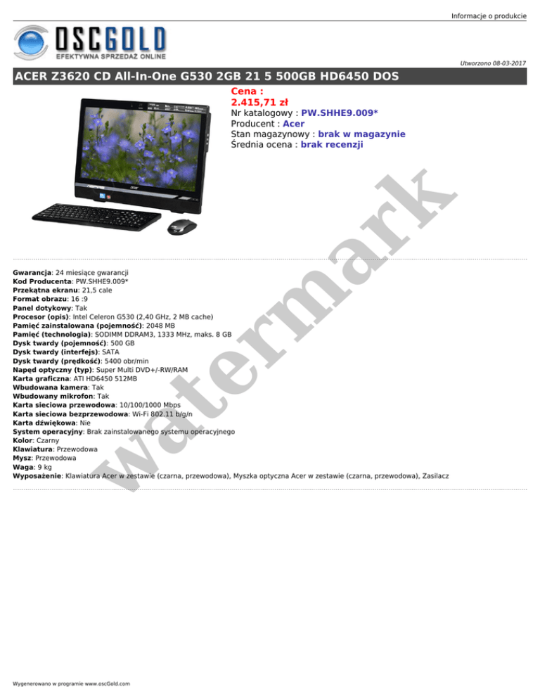 Informacje o produkcie Utworzono 08-03-2017 ACER Z3620 CD All-In-One G530 2GB 21 5 500GB HD6450 DOS Cena : 2.415,71 zł er m ar k Nr katalogowy : PW.SHHE9.009* Producent : Acer Stan magazynowy : brak w magazynie Średnia ocena : brak recenzji w at Gwarancja: 24 miesiące gwarancji Kod Producenta: PW.SHHE9.009* Przekątna ekranu: 21,5 cale Format obrazu: 16 :9 Panel dotykowy: Tak Procesor (opis): Intel Celeron G530 (2,40 GHz, 2 MB cache) Pamięć zainstalowana (pojemność): 2048 MB Pamięć (technologia): SODIMM DDRAM3, 1333 MHz, maks. 8 GB Dysk twardy (pojemność): 500 GB Dysk twardy (interfejs): SATA Dysk twardy (prędkość): 5400 obr/min Napęd optyczny (typ): Super Multi DVD+/-RW/RAM Karta graficzna: ATI HD6450 512MB Wbudowana kamera: Tak Wbudowany mikrofon: Tak Karta sieciowa przewodowa: 10/100/1000 Mbps Karta sieciowa bezprzewodowa: Wi-Fi 802.11 b/g/n Karta dźwiękowa: Nie System operacyjny: Brak zainstalowanego systemu operacyjnego Kolor: Czarny Klawiatura: Przewodowa Mysz: Przewodowa Waga: 9 kg Wyposażenie: Klawiatura Acer w zestawie (czarna, przewodowa), Myszka optyczna Acer w zestawie (czarna, przewodowa), Zasilacz Wygenerowano w programie www.oscGold.com