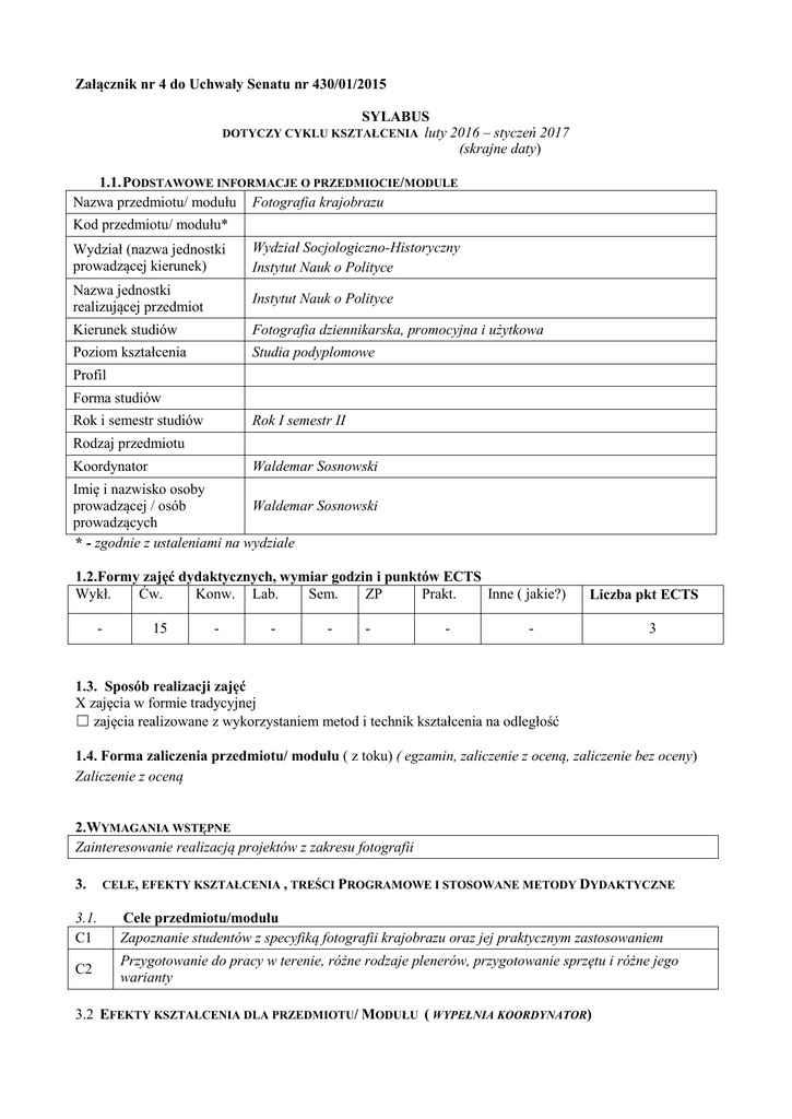 Załącznik nr 4 do Uchwały Senatu nr 430/01/2015 SYLABUS luty 2016 – styczeń 2017 (skrajne daty) DOTYCZY CYKLU KSZTAŁCENIA 1.1. PODSTAWOWE INFORMACJE O PRZEDMIOCIE/MODULE Nazwa przedmiotu/ modułu Fotografia krajobrazu Kod przedmiotu/ modułu* Wydział (nazwa jednostki prowadzącej kierunek) Wydział Socjologiczno-Historyczny Instytut Nauk o Polityce Nazwa jednostki realizującej przedmiot Instytut Nauk o Polityce Kierunek studiów Fotografia dziennikarska, promocyjna i użytkowa Poziom kształcenia Studia podyplomowe Profil Forma studiów Rok i semestr studiów Rok I semestr II Rodzaj przedmiotu Koordynator Waldemar Sosnowski Imię i nazwisko osoby Waldemar Sosnowski prowadzącej / osób prowadzących * - zgodnie z ustaleniami na wydziale 1.2.Formy zajęć dydaktycznych, wymiar godzin i punktów ECTS Wykł. Ćw. Konw. Lab. Sem. ZP Prakt. Inne ( jakie?) - 15 - - - - - Liczba pkt ECTS - 3 1.3. Sposób realizacji zajęć X zajęcia w formie tradycyjnej ☐ zajęcia realizowane z wykorzystaniem metod i technik kształcenia na odległość 1.4. Forma zaliczenia przedmiotu/ modułu ( z toku) ( egzamin, zaliczenie z oceną, zaliczenie bez oceny) Zaliczenie z oceną 2.WYMAGANIA WSTĘPNE Zainteresowanie realizacją projektów z zakresu fotografii 3. CELE, EFEKTY KSZTAŁCENIA , TREŚCI PROGRAMOWE I STOSOWANE METODY DYDAKTYCZNE 3.1. C1 Cele przedmiotu/modułu Zapoznanie studentów z specyfiką fotografii krajobrazu oraz jej praktycznym zastosowaniem C2 Przygotowanie do pracy w terenie, różne rodzaje plenerów, przygotowanie sprzętu i różne jego warianty 3.2 EFEKTY KSZTAŁCENIA DLA PRZEDMIOTU/ MODUŁU ( WYPEŁNIA KOORDYNATOR) EK ( efekt kształcenia) EK_W01 EK_U01 EK_U02 EK_K01 3.3 Treść efektu kształcenia zdefiniowanego dla przedmiotu (modułu) Wiedza: definiuje elementy konieczne do wykonania zadania fotograficznego w zależności od rodzaju fotografii Umiejętności: potrafi w praktyce zastosować różne formy fotograficzne rozpoznaje i poddaje krytyce błędy popełniane przy realizacji projektów fotograficznych Kompetencje społeczne: jest otwarty na innowacyjne rozwiązania Odniesienie do efektów kierunkowych (KEK) SP_W04 SP_U01 SP_U02 SP_K04 TREŚCI PROGRAMOWE (wypełnia koordynator) A. Problematyka ćwiczeń warsztatowych Treści merytoryczne Zagadnienia z podstaw kompozycji, pomiar oraz specyfika światła, temperatura barwowa, dominanta, rozpiętość tonalna, itp. Zagadnienia stabilizacji, stosowanie filtrów oraz ich rodzaje Praca w trudnym terenie oraz bezpieczeństwo fotografa i sprzętu Realizacja wybranych zagadnień fotografii krajobrazu Postprodukcja materiału i jego dobór Tworzenia zdjęć krajobrazu wszystkie etapy realizacji 3.4 METODY DYDAKTYCZNE Zajęcia w pracowni z wyposażeniem audiowizualnym i w plenerze. 4 METODY I KRYTERIA OCENY 4.1 Sposoby weryfikacji efektów kształcenia Symbol efektu EK_W01 EK_U01 EK_U02 EK_K01 Metody oceny efektów kształcenia ( np.: kolokwium, egzamin ustny, egzamin pisemny, projekt, sprawozdanie, obserwacja w trakcie zajęć) ocena projektu zaliczeniowego ocena projektu zaliczeniowego ocena projektu zaliczeniowego obserwacja w trakcie zajęć Forma zajęć dydaktycznych ( w, ćw, …) ćw. ćw. ćw. ćw. 4.2 Warunki zaliczenia przedmiotu (kryteria oceniania) Praktyczna realizacja fotografii krajobrazowej z wykorzystaniem wiedzy zdobytej podczas warsztatów. 5. Całkowity nakład pracy studenta potrzebny do osiągnięcia założonych efektów w godzinach oraz punktach ECTS Aktywność Liczba godzin/ nakład pracy studenta godziny zajęć wg planu z nauczycielem 15 przygotowanie do zajęć 15 samodzielna analiza studiów przypadku w 15 wybranych tytułach prasowych przygotowanie do zaliczenia 15 samodzielne wykonywanie ćwiczeń z zakresu fotografii krajobrazu 15 SUMA GODZIN 75 SUMARYCZNA LICZBA PUNKTÓW ECTS 3 6. PRAKTYKI ZAWODOWE W RAMACH PRZEDMIOTU/ MODUŁU wymiar godzinowy zasady i formy odbywania praktyk - 7. LITERATURA Literatura podstawowa: Szkoła fotografowania National Geographic polskie G J RBA. Krajobrazy. Robert Caputo Wydanie Idealna Ekspozycja. Micheal Freemen. Wydawnictwo National Geographic Krajobraz i przyroda . Wydawnictwo National Geographic Wskazane przez prowadzącego ćwiczenia materiały prasowe, strony internetowe. Literatura uzupełniająca: Roczniki ”National Geographic”. Akceptacja Kierownika Jednostki lub osoby upoważnionej