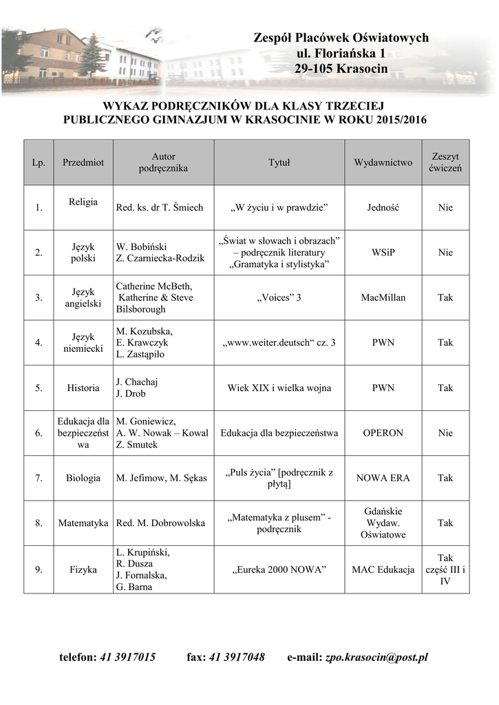Zespół Placówek Oświatowych ul. Floriańska 1 29-105 Krasocin WYKAZ PODRĘCZNIKÓW DLA KLASY TRZECIEJ PUBLICZNEGO GIMNAZJUM W KRASOCINIE W ROKU 2015/2016 Lp. Przedmiot Autor podręcznika Tytuł Wydawnictwo Zeszyt ćwiczeń Religia Red. ks. dr T. Śmiech „W życiu i w prawdzie” Jedność Nie 2. Język polski W. Bobiński Z. Czarniecka-Rodzik „Świat w słowach i obrazach” – podręcznik literatury „Gramatyka i stylistyka” WSiP Nie 3. Język angielski Catherine McBeth, Katherine & Steve Bilsborough „Voices” 3 MacMillan Tak 4. Język niemiecki M. Kozubska, E. Krawczyk L. Zastąpiło „www.weiter.deutsch“ cz. 3 PWN Tak 5. Historia Wiek XIX i wielka wojna PWN Tak Edukacja dla bezpieczeństwa OPERON Nie M. Jefimow, M. Sękas „Puls życia” [podręcznik z płytą] NOWA ERA Tak Matematyka Red. M. Dobrowolska „Matematyka z plusem” podręcznik Gdańskie Wydaw. Oświatowe Tak MAC Edukacja Tak część III i IV 1. 6. 7. 8. 9. J. Chachaj J. Drob Edukacja dla M. Goniewicz, bezpieczeńst A. W. Nowak – Kowal wa Z. Smutek Biologia Fizyka L. Krupiński, R. Dusza J. Fornalska, G. Barna telefon: 41 3917015 „Eureka 2000 NOWA” fax: 41 3917048 e-mail: [email protected] Zespół Placówek Oświatowych ul. Floriańska 1 29-105 Krasocin 10. Chemia 11. Geografia 12. 13. I. T. Kulawik M. Litwin M. Szubert Informatyka G. Koba Plastyka K. Czarniecka telefon: 41 3917015 „Chemia dla gimnazjum” – nowe wydanie cz. III Nowa Era Tak „Planeta Nowa” Nowa Era Tak Informatyka. Podstawowe tematy - nowe wydanie[podręcznik z płytą] PWN Nie Plastyka OPERON Tak fax: 41 3917048 e-mail: [email protected]