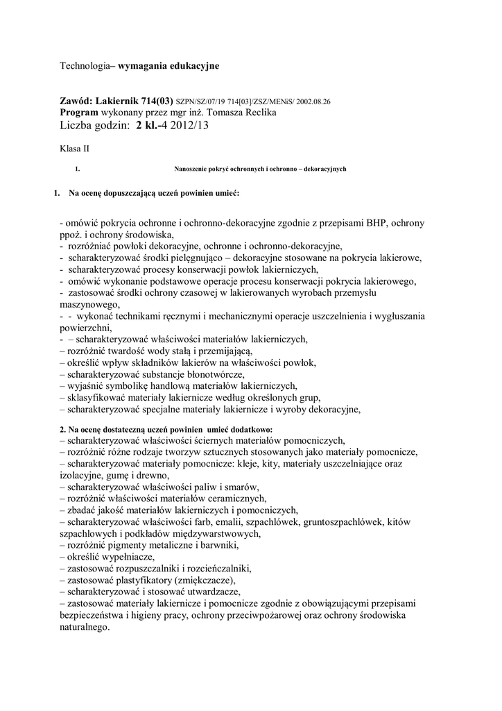 Technologia– wymagania edukacyjne Zawód: Lakiernik 714(03) SZPN/SZ/07/19 714[03]/ZSZ/MENiS/ 2002.08.26 Program wykonany przez mgr inż. Tomasza Reclika Liczba godzin: 2 kl.-4 2012/13 Klasa II 1. 1. Nanoszenie pokryć ochronnych i ochronno – dekoracyjnych Na ocenę dopuszczającą uczeń powinien umieć: - omówić pokrycia ochronne i ochronno-dekoracyjne zgodnie z przepisami BHP, ochrony ppoż. i ochrony środowiska, - rozróżniać powłoki dekoracyjne, ochronne i ochronno-dekoracyjne, - scharakteryzować środki pielęgnująco – dekoracyjne stosowane na pokrycia lakierowe, - scharakteryzować procesy konserwacji powłok lakierniczych, - omówić wykonanie podstawowe operacje procesu konserwacji pokrycia lakierowego, - zastosować środki ochrony czasowej w lakierowanych wyrobach przemysłu maszynowego, - - wykonać technikami ręcznymi i mechanicznymi operacje uszczelnienia i wygłuszania powierzchni, - – scharakteryzować właściwości materiałów lakierniczych, – rozróżnić twardość wody stałą i przemijającą, – określić wpływ składników lakierów na właściwości powłok, – scharakteryzować substancje błonotwórcze, – wyjaśnić symbolikę handlową materiałów lakierniczych, – sklasyfikować materiały lakiernicze według określonych grup, – scharakteryzować specjalne materiały lakiernicze i wyroby dekoracyjne, 2. Na ocenę dostateczną uczeń powinien umieć dodatkowo: – scharakteryzować właściwości ściernych materiałów pomocniczych, – rozróżnić różne rodzaje tworzyw sztucznych stosowanych jako materiały pomocnicze, – scharakteryzować materiały pomocnicze: kleje, kity, materiały uszczelniające oraz izolacyjne, gumę i drewno, – scharakteryzować właściwości paliw i smarów, – rozróżnić właściwości materiałów ceramicznych, – zbadać jakość materiałów lakierniczych i pomocniczych, – scharakteryzować właściwości farb, emalii, szpachlówek, gruntoszpachlówek, kitów szpachlowych i podkładów międzywarstwowych, – rozróżnić pigmenty metaliczne i barwniki, – określić wypełniacze, – zastosować rozpuszczalniki i rozcieńczalniki, – zastosować plastyfikatory (zmiękczacze), – scharakteryzować i stosować utwardzacze, – zastosować materiały lakiernicze i pomocnicze zgodnie z obowiązującymi przepisami bezpieczeństwa i higieny pracy, ochrony przeciwpożarowej oraz ochrony środowiska naturalnego. 2. Na ocenę dobrą uczeń powinien umieć dodatkowo: - ocenić jakość powierzchni dekoracyjnych i ochronnych, – zbadać materiały lakiernicze: lepkość, czas schnięcia, rozlewność, – pobrać i przygotować próbki materiałów lakierniczych do kontroli laboratoryjnej, 4. Na ocenę bardzo dobrą uczeń powinien umieć dodatkowo: - skorzystać z literatury technicznej i innych źródeł informacji. – magazynować materiały lakiernicze, – zastosować wodę dejonizowaną, 2. Ocenianie jakości pokryć lakierniczych 1. Na ocenę dopuszczającą uczeń powinien umieć: - organizować stanowisko pracy zgodnie z wymogami ergonomii, - dobierać metody i narzędzia do wykonywanych czynności, - znajdować właściwą dokumentację techniczną w bibliotece lub innej bazie danych, - rozróżniać pokrycia i powłoki lakiernicze, - identyfikować strukturę pokryć i powłok lakierniczych, - stosować podstawy fizykochemiczne produktów lakierniczych, - korzystać z różnych źródeł informacji - rozróżnić wady powłok lakierniczych, - wykonać próby jakościowe materiałów i powłok lakierniczych zgodnie z przepisami bhp, ochrony ppoż. i ochrony środowiska, - wyjaśnić istotę systemu zapewnienia jakości, 2. Na ocenę dostateczną uczeń powinien umieć dodatkowo: - scharakteryzować zadania kontroli jakości materiałów i pokryć lakierniczych, - ocenić jakość powłok lakierniczych w warunkach warsztatowych, 3. Na ocenę dobrą uczeń powinien umieć dodatkowo: - posłużyć się dokumentacją procesów kontroli jakości, - identyfikować strukturę pokryć i powłok lakierniczych, - stosować podstawy fizykochemiczne produktów lakierniczych, 4. Na ocenę bardzo dobrą uczeń powinien umieć dodatkowo: - skorzystać z literatury technicznej oraz bazy danych. 3. Przygotowanie powierzchni wyrobów do lakierowania 1. Na ocenę dopuszczającą uczeń powinien umieć: – organizować stanowisko pracy zgodnie z wymogami ergonomii, – znajdować właściwą dokumentację techniczną w bibliotece lub innej bazie danych, – stosować pojęcia procesów fizycznych i chemicznych, – rozróżniać strukturę pokryć i powłok lakierniczych, – stosować poznane pojęcia i prawa w praktyce, – rozróżniać różne typy podłoży przeznaczone do lakierowania, – wykonywać zadane ćwiczenia zgodnie z zasadami bhp i ochrony ppoż., – korzystać z różnych źródeł informacji. – wykonać prace związane z przygotowaniem powierzchni do lakierowania zgodnie z przepisami bhp, ochrony przeciwpożarowej i ochrony środowiska, – zidentyfikować zanieczyszczenia powierzchni przeznaczonych do lakierowania, – ocenić stan powierzchni przed lakierowaniem, – scharakteryzować podstawowe metody oczyszczania powierzchni, . 2. Na ocenę dostateczną uczeń powinien umieć dodatkowo: – dobrać metodę przygotowania powierzchni do lakierowania, – rozróżnić sprzęt i narzędzia do czyszczenia powierzchni pod pokrycia malarsko lakiernicze, 3. Na ocenę dobrą uczeń powinien umieć dodatkowo: – zorganizować stanowisko pracy, – oczyścić powierzchnię metodami ręcznymi i maszynowymi, 4. Na ocenę bardzo dobrą uczeń powinien umieć dodatkowo: – posłużyć się dokumentacją technologiczną – posłużyć się dokumentacją techniczno – ruchową /DTR/ urządzeń, – posłużyć się dokumentacją procesów kontroli jakości, 4. Wykorzystanie techniki lakierowania pneumatycznego w lakierowaniu specjalistycznym 1. Na ocenę dopuszczającą uczeń powinien u