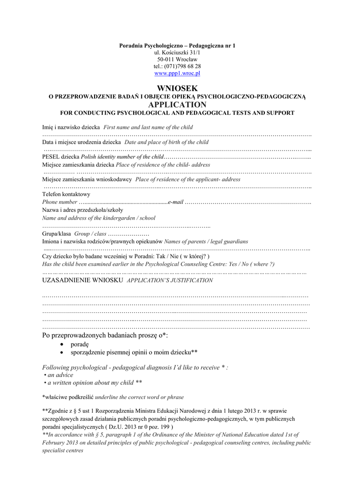 Poradnia Psychologiczno – Pedagogiczna nr 1 ul. Kościuszki 31/1 50-011 Wrocław tel.: (071)798 68 28 www.ppp1.wroc.pl WNIOSEK O PRZEPROWADZENIE BADAŃ I OBJĘCIE OPIEKĄ PSYCHOLOGICZNO-PEDAGOGICZNĄ APPLICATION FOR CONDUCTING PSYCHOLOGICAL AND PEDAGOGICAL TESTS AND SUPPORT Imię i nazwisko dziecka First name and last name of the child ………………………………………………………………………………………………………………………. Data i miejsce urodzenia dziecka Date and place of birth of the child ….…………………………………………………………………………………………………………………... PESEL dziecka Polish identity number of the child………………………………………………………….…….. Miejsce zamieszkania dziecka Place of residence of the child- address .…………… ……………………………………….………………………………………………………………. Miejsce zamieszkania wnioskodawcy Place of residence of the applicant- address …………………………………………………..………………………………………………………………….. Telefon kontaktowy Phone number …........................................................e-mail ………………………………………………………. Nazwa i adres przedszkola/szkoły Name and address of the kindergarden / school ………………………………………………….……………..……….. Grupa/klasa Group / class ………………… Imiona i nazwiska rodziców/prawnych opiekunów Names of parents / legal guardians .....………………………………………………………………………………………………………………….. Czy dziecko było badane wcześniej w Poradni: Tak / Nie ( w której? ) Has the child been examined earlier in the Psychological Counseling Centre: Yes / No ( where ?) …………………………………………………………………………………………………………………………………… UZASADNIENIE WNIOSKU APPLICATION’S JUSTIFICATION .…………………………………………………………………………………………………………..………… ……………………………………………………………………………………………………………………… …………………………………………………………..………………………………………………………… ………………………………………..…………………………………………………………………………… ……………………………………………………………………………………………………………………… Po przeprowadzonych badaniach proszę o*: poradę sporządzenie pisemnej opinii o moim dziecku** Following psychological - pedagogical diagnosis I’d like to receive * : • an advice • a written opinion about my child ** *właściwe podkreślić underline the correct word or phrase **Zgodnie z § 5 ust 1 Rozporządzenia Ministra Edukacji Narodowej z dnia 1 lutego 2013 r. w sprawie szczegółowych zasad działania publicznych poradni psychologiczno-pedagogicznych, w tym publicznych poradni specjalistycznych ( Dz.U. 2013 nr 0 poz. 199 ) **In accordance with § 5, paragraph 1 of the Ordinance of the Minister of National Education dated 1st of February 2013 on detailed principles of public psychological - pedagogical counseling centres, including public specialist centres Informacje dotyczące danych osobowych Information on personal data Przyjmuję do wiadomości, iż zgodnie z przepisami ustawy z dnia 29 sierpnia 1997 roku o ochronie danych osobowych (Dz. U. z 2002 r. Nr 101, poz. 926 ze zm.) administratorem danych jest Poradnia PsychologicznoPedagogiczna nr 1. Mam świadomość przysługującego mi prawa wglądu do treści danych oraz ich poprawiania. Podstawą prawną przetwarzania danych przez poradnię jest art. 23 ust. 1 pkt 2 ustawy z dnia 29 sierpnia 1997 roku o ochronie danych osobowych (Dz. U. z 2002 r. Nr 101, poz. 926 ze zm.). Zakres danych określony jest w przepisach ustawy z dnia 7 września 1991 roku o systemie oświaty (Dz. U. z 2004 r. Nr 256, poz. 2572, z późn. zm.), ustawy z dnia 15 kwietnia 2011 roku o systemie informacji oświatowej (Dz. U. z 2012 r. Nr 139, poz. 814, z późn. zm.) oraz rozporządzenia MEN z 1 lutego 2013 r. w sprawie szczegółowych zasad działania publicznych poradni psychologiczno-pedagogicznych, w tym publicznych poradni specjalistycznych (Dz. U. z 2013 r., poz. 199). I acknowledge that an administrator of the submitted data is Psychological and Pedagogical Counseling Centre No. 1., in accordance with the Personal Data Protection Act dated 29.08.1997 (uniform text: Journal of Laws of the Republic of Poland 2002 No 101, item 926 with further amendments). I am aware that I access and adjust my personal data. Personal data processing by the counseling centre is based upon Personal Data Protection Act dated 29.08.1997 (uniform text:Journal of Laws of the Republic of Poland 2002 No 101, item 926 with further amendments). The data scope is defined by the following legislation acts: The Education System Act of 7 September 1991 (uniform text: Journal of Laws of the Republic of Poland 2004 No 256, item 2572 with further amendments), The Act of 15 April 2011 on the System of Educational Information (uniform text: Journal of Laws of the Republic of Poland 2012 No 139, item 814 with further amendments), the Ordinance of the Minister of National Education dated 1st of February 2013 on detailed principles of public psychological - pedagogical counseling centres, including public specialist centres (uniform text: Journal of Laws of the Republic of Poland 2013, item 199) ………………………………… ( data wypełnienia wnio