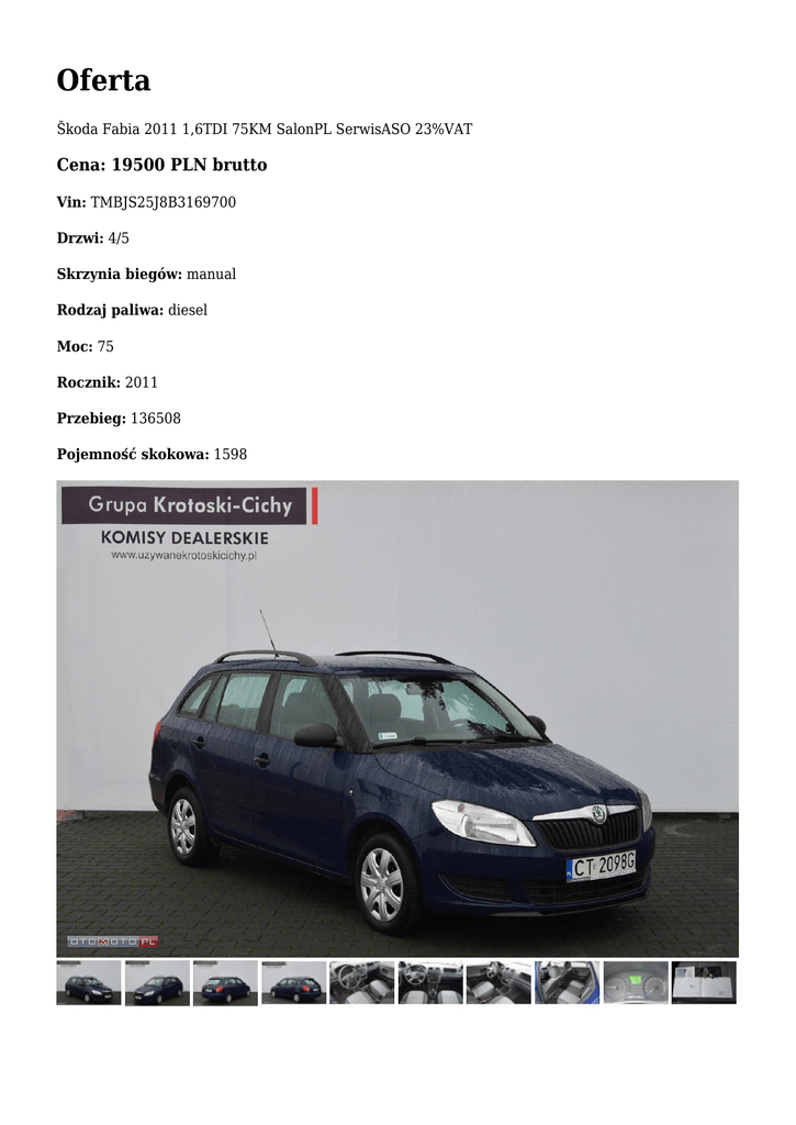 Oferta Škoda Fabia 2011 1,6TDI 75KM SalonPL SerwisASO 23%VAT Cena: 19500 PLN brutto Vin: TMBJS25J8B3169700 Drzwi: 4/5 Skrzynia biegów: manual Rodzaj paliwa: diesel Moc: 75 Rocznik: 2011 Przebieg: 136508 Pojemność skokowa: 1598 Opis: Auto-Handel-Centrum Krotoski-Cichy Autoryzowany Dealer VW Audi Seat Skoda GWARANCJA POCHODZENIA MOŻLIWOŚĆ SPRAWDZENIA POJAZDU W STACJI OBSŁUGI. MOŻLIWOŚĆ POZOSTAWIENIA SWOJEGO SAMOCHODU UŻYWANEGO W ROZLICZENIU -----------------------------------------------------------------------------------------------------------------------------------------------------Uwaga: Miejsce ekspozycji pojazdu - Grupa Krotoski-Cichy Salon Pojazdów Używanych Wysogotowo, ul. Skórzewska 8 Osoba kontaktowa tel: Maximilian Gera - 609 790 272 Łukasz Grześkowiak - 601 383 710 Mariusz Kowalewski - 609 795 053 Możliwa jazda próbna po wcześniejszym uzgodnieniu terminu -----------------------------------------------------------------------------------------------------------------------------------------------------SKODA FABIA Kombi 1,6TDI CR 75KM Samochód kupiony w polskim salonie SKODA Serwisowany w ASO SKODA - książki serwisowe, instrukcje obsługi , 2 klucze rozruchowe Pierwszy właściciel Pojemność skokowa: 1598 cm3 Typ silnika: olej napędowy Moc silnika: 75 KM przy 4000 Obr/min Maksymalny moment obrotowy: 195 Nm przy 1500-2000 Obr/min Liczba cylindrów: 4 Skrzynia biegów: manualna 5 biegowa Przyspieszenie (0-100km/h) : 14,1 s. Wyposażenie: ABS - system zapobiegający blokowaniu się kół podczas hamowania ACS - system pokolizyjny Klimatyzacja półautomatyczna Climatic Elektrycznie sterowane szyby w drzwiach przednich Airbag - 4 sztuki (czołowe poduszki kierowcy i pasażera, boczne poduszki - przód) Chromowana listwa nad atrapą chłodnicy Deska rozdzielcza Onyx/Onyx Dual Rate - system wspomagania nagłego hamowania Felgi stalowe 14cali Fotel kierowcy z manualną regulacją wysokości Immobilizer Kolumna kierownicy regulowana w pionie/poziomie MSR - układ przeciwblokujący przy hamowaniu silnikiem Roleta przestrzeni bagażowej, automatycznie zwijana Uchwyty ISOFIX na tylnych siedzeniach Wspomaganie układu kierowniczego Światła do jazdy dziennej Czujnik odległości przy parkowaniu - tył Relingi dachowe w kolorze czarnym Zamek centralny z pilotem Alarm Radio CD Zestaw głośnomówiący Bluetooth NOKIA NA POWYŻSZY POJAZD WYSTAWIANA JEST FAKTURA VAT 23% - KUPUJĄCY ZWOLNIONY Z OPŁATY SKARBOWEJ ( 2% wartości pojazdu) -----------------------------------------------------------------------------------------------------------------------------------------------------Oferujemy kompleksową obsługę sprzedaży ratalnej na bardzo dogodnych warunkach - w celu bliższego zapoznania się z aktualną ofertą finansowania prosimy o kontakt : Łukasz Grześkowiak - 601 383 710 Katarzyna Świątkiewicz - 609 562 980 Oferujemy ubezpieczenia samochodowe z wiodących na rynku ubezpieczalni - możliwość zakupu pakietu ubezpieczeniowego na miejscu. Oferujemy możliwość jazdy próbnej przed zakupem oraz usługę inspekcji pojazdu. Przyjmujemy również w rozliczeniu każdy pojazd. -----------------------------------------------------------------------------------------------------------------------------------------------------Ogłoszenie ma charakter informacyjny i stanowi zaproszenie do zawarcia umowy (art. 71 Kodeksu cywilnego); nie stanowi natomiast oferty handlowej w rozumieniu art. 66 § 1 Kodeksu cywilnego. W celu sprawdzenia zgodności oferty oraz uzyskania wszelkich informacji prosimy kontaktować się z handlowcem d.s. samochodów używanych Auto możesz zobaczyć: