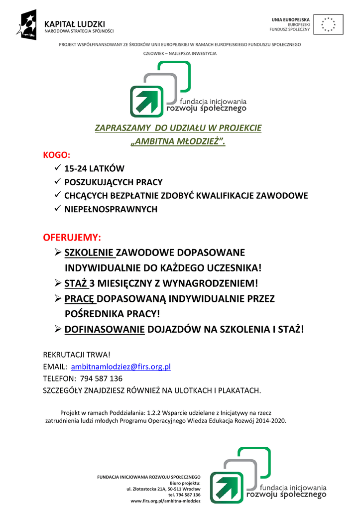 ZAPRASZAMY DO UDZIAŁU W PROJEKCIE „AMBITNA MŁODZIEŻ”. KOGO: 15-24 LATKÓW POSZUKUJĄCYCH PRACY CHCĄCYCH BEZPŁATNIE ZDOBYĆ KWALIFIKACJE ZAWODOWE NIEPEŁNOSPRAWNYCH OFERUJEMY: SZKOLENIE ZAWODOWE DOPASOWANE INDYWIDUALNIE DO KAŻDEGO UCZESNIKA! STAŻ 3 MIESIĘCZNY Z WYNAGRODZENIEM! PRACĘ DOPASOWANĄ INDYWIDUALNIE PRZEZ POŚREDNIKA PRACY! DOFINASOWANIE DOJAZDÓW NA SZKOLENIA I STAŻ! REKRUTACJI TRWA! EMAIL: [email protected] TELEFON: 794 587 136 SZCZEGÓŁY ZNAJDZIESZ RÓWNIEŻ NA ULOTKACH I PLAKATACH. Projekt w ramach Poddziałania: 1.2.2 Wsparcie udzielane z Inicjatywy na rzecz zatrudnienia ludzi młodych Programu Operacyjnego Wiedza Edukacja Rozwój 2014-2020. FUNDACJA INICJOWANIA ROZWOJU SPOŁECZNEGO Biuro projektu: ul. Złotostocka 21A, 50-511 Wrocław tel. 794 587 136 www.firs.org.pl/ambitna-mlodziez