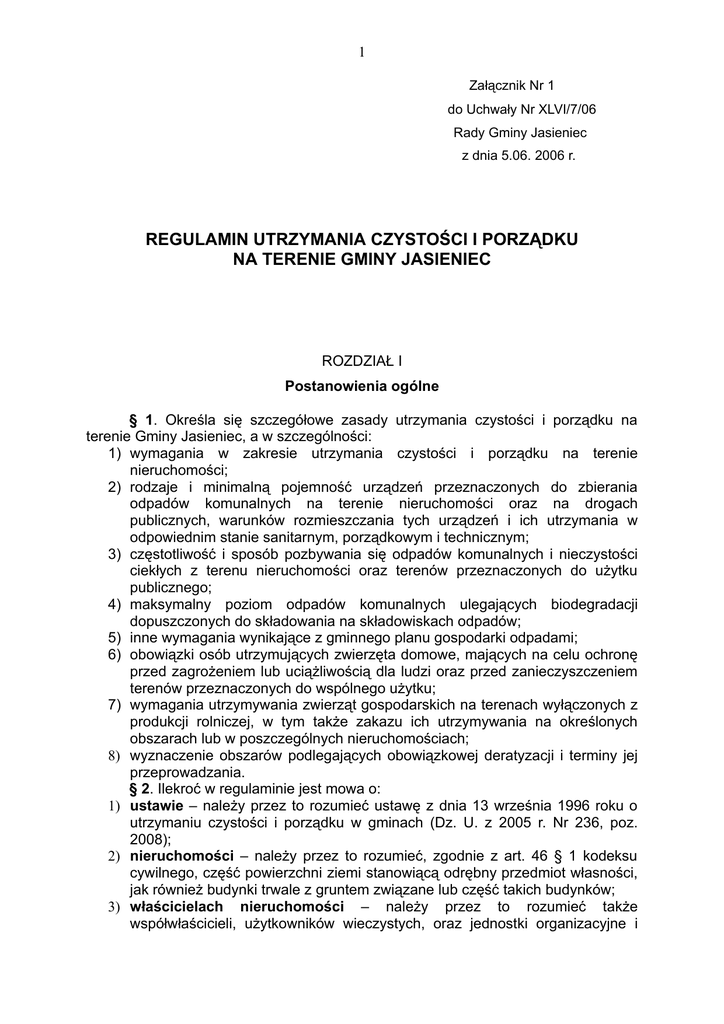 1 Załącznik Nr 1 do Uchwały Nr XLVI/7/06 Rady Gminy Jasieniec z dnia 5.06. 2006 r. REGULAMIN UTRZYMANIA CZYSTOŚCI I PORZĄDKU NA TERENIE GMINY JASIENIEC ROZDZIAŁ I Postanowienia ogólne § 1. Określa się szczegółowe zasady utrzymania czystości i porządku na terenie Gminy Jasieniec, a w szczególności: 1) wymagania w zakresie utrzymania czystości i porządku na terenie nieruchomości; 2) rodzaje i minimalną pojemność urządzeń przeznaczonych do zbierania odpadów komunalnych na terenie nieruchomości oraz na drogach publicznych, warunków rozmieszczania tych urządzeń i ich utrzymania w odpowiednim stanie sanitarnym, porządkowym i technicznym; 3) częstotliwość i sposób pozbywania się odpadów komunalnych i nieczystości ciekłych z terenu nieruchomości oraz terenów przeznaczonych do użytku publicznego; 4) maksymalny poziom odpadów komunalnych ulegających biodegradacji dopuszczonych do składowania na składowiskach odpadów; 5) inne wymagania wynikające z gminnego planu gospodarki odpadami; 6) obowiązki osób utrzymujących zwierzęta domowe, mających na celu ochronę przed zagrożeniem lub uciążliwością dla ludzi oraz przed zanieczyszczeniem terenów przeznaczonych do wspólnego użytku; 7) wymagania utrzymywania zwierząt gospodarskich na terenach wyłączonych z produkcji rolniczej, w tym także zakazu ich utrzymywania na określonych obszarach lub w poszczególnych nieruchomościach; 8) wyznaczenie obszarów podlegających obowiązkowej deratyzacji i terminy jej przeprowadzania. § 2. Ilekroć w regulaminie jest mowa o: 1) ustawie – należy przez to rozumieć ustawę z dnia 13 września 1996 roku o utrzymaniu czystości i porządku w gminach (Dz. U. z 2005 r. Nr 236, poz. 2008); 2) nieruchomości – należy przez to rozumieć, zgodnie z art. 46 § 1 kodeksu cywilnego, część powierzchni ziemi stanowiącą odrębny przedmiot własności, jak również budynki trwale z gruntem związane lub część takich budynków; 3) właścicielach nieruchomości – należy przez to rozumieć także współwłaścicieli, użytkowników wieczystych, oraz jednostki organizacyjne i 2 osoby posiadające nieruchomości w zarządzie lub użytkowaniu, a także inne podmioty władające nieruchomościami mające obowiązek realizować obowiązki w zakresie utrzymania czystości i porządku, przy czym: na terenie budowy wykonywanie obowiązków właściciela nieruchomości należy do wykonawcy robót budowlanych; na terenie wydzielonych krawężnikiem lub oznakowaniem poziomym, torowisk pojazdów szynowych oraz przystanków komunikacyjnych obowiązki uprzątnięcia i pozbycia się błota, śniegu, lodu i innych zanieczyszczeń, należą do przedsiębiorców użytkujących tereny służące komunikacji publicznej; na drogach publicznych obowiązki utrzymania czystości i porządku, a także zbieranie i pozbywanie się odpadów zgromadzonych w urządzeniach do tego przeznaczonych oraz utrzymanie tych urządzeń w odpowiednim stanie sanitarnym, porządkowym i technicznym, pozbywanie się błota, śniegu, lodu i innych zanieczyszczeń uprzątniętych z chodników przez właścicieli nieruchomości przyległych do drogi publicznej, uprzątnięcie i pozbycie się błota, śniegu, lodu i innych zanieczyszczeń z chodników, jeżeli zarząd drogi pobiera opłaty z tytułu postoju lub parkowania pojazdów na takim chodniku, należą do zarządu drogi; na terenach pozostałych obowiązki utrzymania czystości i porządku należą do gminy, do obowiązków gminy należy także uprzątnięcie i pozbycie się błota, śniegu, lodu i innych zanieczyszczeń z chodników, jeżeli gmina pobiera opłaty z tytułu postoju lub parkowania pojazdów samochodowych na takim chodniku oraz zbieranie i pozbycie się odpadów zgromadzonych w urządzeniach do tego przeznaczonych umieszczonych na tym chodniku i utrzymanie tych urządzeń w odpowiednim stanie sanitarnym, porządkowym i technicznym; 4) najemcach/właścicielach lokalu – należy przez to rozumieć najemców lub właścicieli lokali mieszkalnych i użytkowych, 5) umowach – należy przez to rozumieć umowy, rozumiane zgodnie z treścią art. 6. ust. 1 ustawy, podpisane z podmiotem uprawnionym przez właścicieli nieruchomości oraz najemców/właścicieli lokali; 6) stawkach opłat – należy rozumieć przez to wysokość opłat uiszczanych przez właściciela nieruchomości lub najemcę/właściciela lokalu, podmiotowi uprawnionemu za odbiór odpadów komunalnych 7) odpadach komunalnych- należy przez to rozumieć odpady powstające w gospodarstwach domowych, a także odpady nie zawierające odpadów niebezpiecznych pochodzące od innych wytwórców odpadów, które ze względu na swój charakter lub skład są podobne do odpadów powstających w gospodarstwach domowych; 8) odpadach wielkogabarytowych- należy przez to rozumieć jeden ze strumieni odpadów komunalnych, charakteryzujący się tym, że jego składniki, ze względu na swoje rozmiary i masę, nie mogą być umieszczone w typowych pojemnikach przeznaczonych do zbierania odpadów komunalnych; 9) odpadach ulegających biodegradacji- należy przez to rozumieć odpady, które ulegają rozkładowi tlenowemu lub beztlenowemu przy udziale mikroorganizmów, np.: odpady kuchenne, odpady zielone itp; 10) odpadach niebezpiecznych- rozumie się przez to frakcję odpadów niebezpiecznych w rozumieniu ustawy o odpadach, a więc np.: baterie, akumulatory, świetlówki, resztki farb, lakierów, rozpuszczalników, środków do impregnacji drewna, olejów mineralnych i syntetycznych, benzyn, leków, 3 opakowania po środkach ochrony roślin i nawozach, opakowania po aerozolach, zużyte opatrunki, odpady komunalne, które ze względu na swój skład i zawartość nie dają się poddać procesowi odzysku i przerobu w standardowych instalacjach odzysku odpadów komunalnych. 11) nieczystościach ciekłych- rozumie się przez to ścieki gromadzone przejściowo w zbiornikach bezodpływowych
