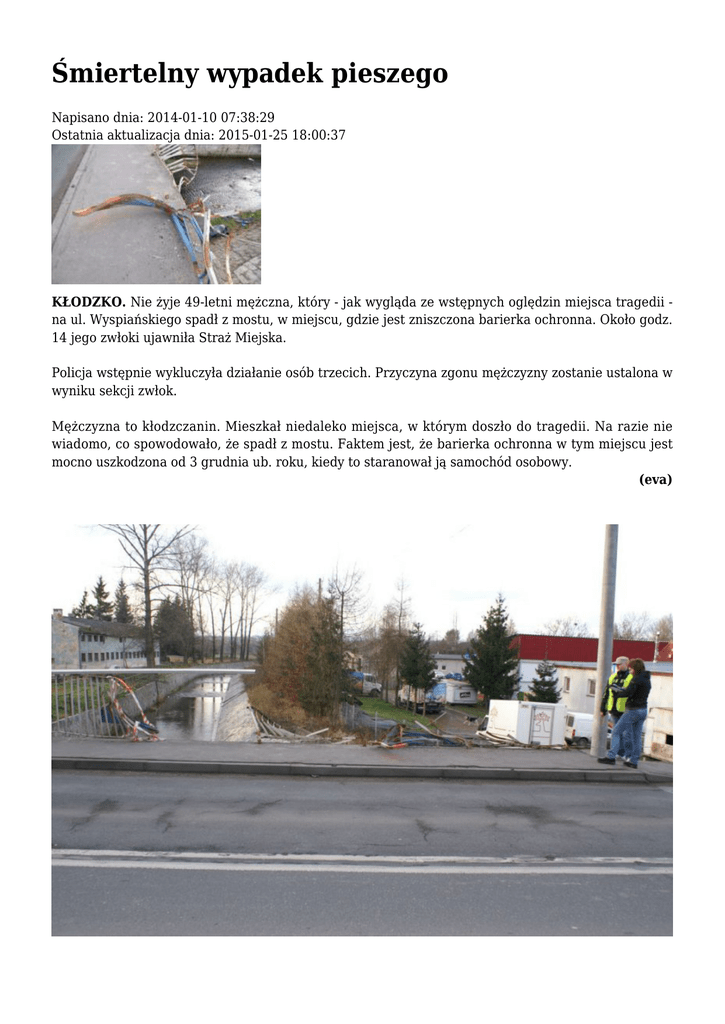 Śmiertelny wypadek pieszego Napisano dnia: 2014-01-10 07:38:29 Ostatnia aktualizacja dnia: 2015-01-25 18:00:37 KŁODZKO. Nie żyje 49-letni mężczna, który - jak wygląda ze wstępnych oględzin miejsca tragedii na ul. Wyspiańskiego spadł z mostu, w miejscu, gdzie jest zniszczona barierka ochronna. Około godz. 14 jego zwłoki ujawniła Straż Miejska. Policja wstępnie wykluczyła działanie osób trzecich. Przyczyna zgonu mężczyzny zostanie ustalona w wyniku sekcji zwłok. Mężczyzna to kłodzczanin. Mieszkał niedaleko miejsca, w którym doszło do tragedii. Na razie nie wiadomo, co spowodowało, że spadł z mostu. Faktem jest, że barierka ochronna w tym miejscu jest mocno uszkodzona od 3 grudnia ub. roku, kiedy to staranował ją samochód osobowy. (eva) Foto: Z. Byrski