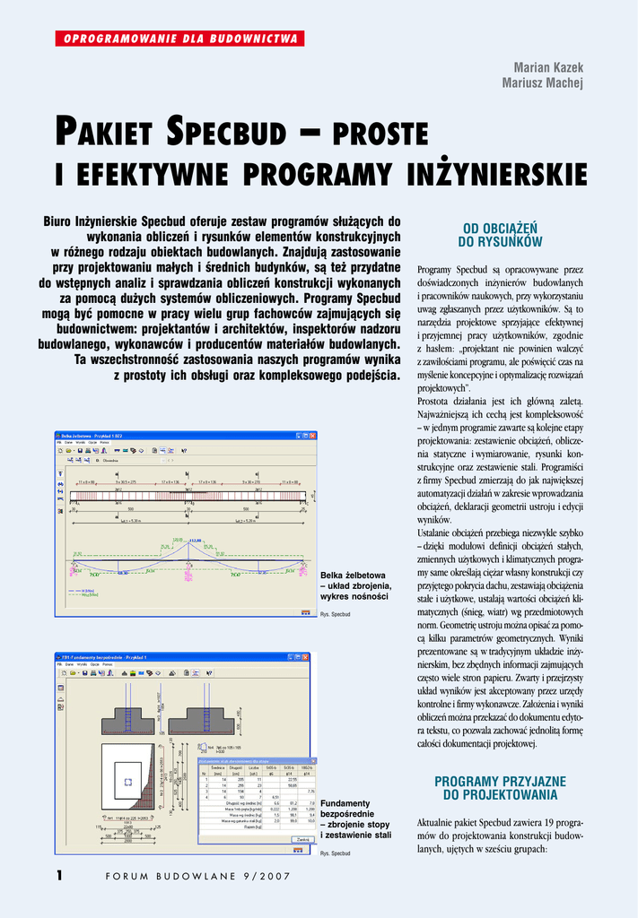 O P R O G R A M O WA N I E D L A B U D O W N I C T WA Marian Kazek Mariusz Machej Pakiet Specbud – proste i efektywne programy inżynierskie Biuro Inżynierskie Specbud oferuje zestaw programów służących do wykonania obliczeń i rysunków elementów konstrukcyjnych w różnego rodzaju obiektach budowlanych. Znajdują zastosowanie przy projektowaniu małych i średnich budynków, są też przydatne do wstępnych analiz i sprawdzania obliczeń konstrukcji wykonanych za pomocą dużych systemów obliczeniowych. Programy Specbud mogą być pomocne w pracy wielu grup fachowców zajmujących się budownictwem: projektantów i architektów, inspektorów nadzoru budowlanego, wykonawców i producentów materiałów budowlanych. Ta wszechstronność zastosowania naszych programów wynika z prostoty ich obsługi oraz kompleksowego podejścia. Belka żelbetowa – układ zbrojenia, wykres nośności Rys. Specbud Fundamenty bezpośrednie – zbrojenie stopy i zestawienie stali Rys. Specbud 1 FORUM BUDOWLANE 9/2007 OD OBCIĄŻEŃ DO RYSUNKÓW Programy Specbud są opracowywane przez doświadczonych inżynierów budowlanych i pracowników naukowych, przy wykorzystaniu uwag zgłaszanych przez użytkowników. Są to narzędzia projektowe sprzyjające efektywnej i przyjemnej pracy użytkowników, zgodnie z hasłem: „projektant nie powinien walczyć z zawiłościami programu, ale poświęcić czas na myślenie koncepcyjne i optymalizację rozwiązań projektowych”. Prostota działania jest ich główną zaletą. Najważniejszą ich cechą jest kompleksowość – w jednym programie zawarte są kolejne etapy projektowania: zestawienie obciążeń, obliczenia statyczne i wymiarowanie, rysunki konstrukcyjne oraz zestawienie stali. Programiści z firmy Specbud zmierzają do jak największej automatyzacji działań w zakresie wprowadzania obciążeń, deklaracji geometrii ustroju i edycji wyników. Ustalanie obciążeń przebiega niezwykle szybko – dzięki modułowi definicji obciążeń stałych, zmiennych użytkowych i klimatycznych programy same określają ciężar własny konstrukcji czy przyjętego pokrycia dachu, zestawiają obciążenia stałe i użytkowe, ustalają wartości obciążeń klimatycznych (śnieg, wiatr) wg przedmiotowych norm. Geometrię ustroju można opisać za pomocą kilku parametrów geometrycznych. Wyniki prezentowane są w tradycyjnym układzie inżynierskim, bez zbędnych informacji zajmujących często wiele stron papieru. Zwarty i przejrzysty układ wyników jest akceptowany przez urzędy kontrolne i firmy wykonawcze. Założenia i wyniki obliczeń można przekazać do dokumentu edytora tekstu, co pozwala zachować jednolitą formę całości dokumentacji projektowej. PROGRAMY PRZYJAZNE DO PROJEKTOWANIA Aktualnie pakiet Specbud zawiera 19 programów do projektowania konstrukcji budowlanych, ujętych w sześciu grupach: O P R O G R A M O WA N I E D L A B U D O W N I C T WA l Żelbet – Belka żelbetowa ciągła, Kalkulator elementów żelbetowych (m.in. Słupy), Schody płytowe, Płyta krzyżowo zbrojona, Płyta jednokierunkowo zbrojona, Strop Akermana; l Drewno – Kalkulator elementów drewnianych, Belka drewniana, Wiązar jętkowy, Wiązar płatwiowo-kleszczowy; l Stal – Kalkulator elementów stalowych, Belka stalowa, Tablice przekrojów stalowych; l Fundamenty – Fundamenty bezpośrednie, Kalkulator parametrów geotechnicznych gruntów (program darmowy); l Statyka – Kalkulator obciążeń normowych, Belka v.1.0 – (program darmowy), Belka v.2.0 – z kombinatoryką; l Ekspert – Belka jezdna wciągników. Wszystkie programy Specbud wykonują obliczenia wg aktualnych norm projektowania konstrukcji budowlanych, w tym nowych norm obciążenia śniegiem. Sposób prowadzenia obliczeń wg tych norm odpowiada układowi norm europejskich PN-EN, które przewidywane są do stosowania w nieodległej już przyszłości. Programy mają wszechstronne zastosowanie. Mogą stanowić narzędzie pracy projektantów Belka jezdna wciągnika – schemat obliczeniowy, przekrój poprzeczny Rys. Specbud o różnym poziomie przygotowania zawodowego – początkujących i doświadczonych, młodszych i tych z wieloletnim stażem zawodowym. Dzięki prostocie obsługi i istniejącym podpowiedziom mogą z nich korzystać początkujący projektanci – programy przeprowadzą ich przez obliczenia, a wielokrotność powtórzeń ułatwia zdobycie potrzebnego doświadczenia. Z kolei możliwość korzystania z zaawansowanych opcji wymiarowania może zaspokoić oczekiwania dociekliwych, wymagających konstruktorów. FORUM Ograniczenia objętościowe artykułu nie pozwalają na bardziej wyczerpującą prezentację możliwości i funkcji naszych programów. Więcej informacji o programach, a także ich wersje demonstracyjne oraz pełne wersje kilku programów do nieodpłatnego pobrania i stosowania w pracy zawodowej lub nauce, znajdują się na stronie internetowej firm z Specbud. q Marian Kazek, Mariusz Machej, Biuro Inżynierskie Specbud BUDOWLANE 9/2007